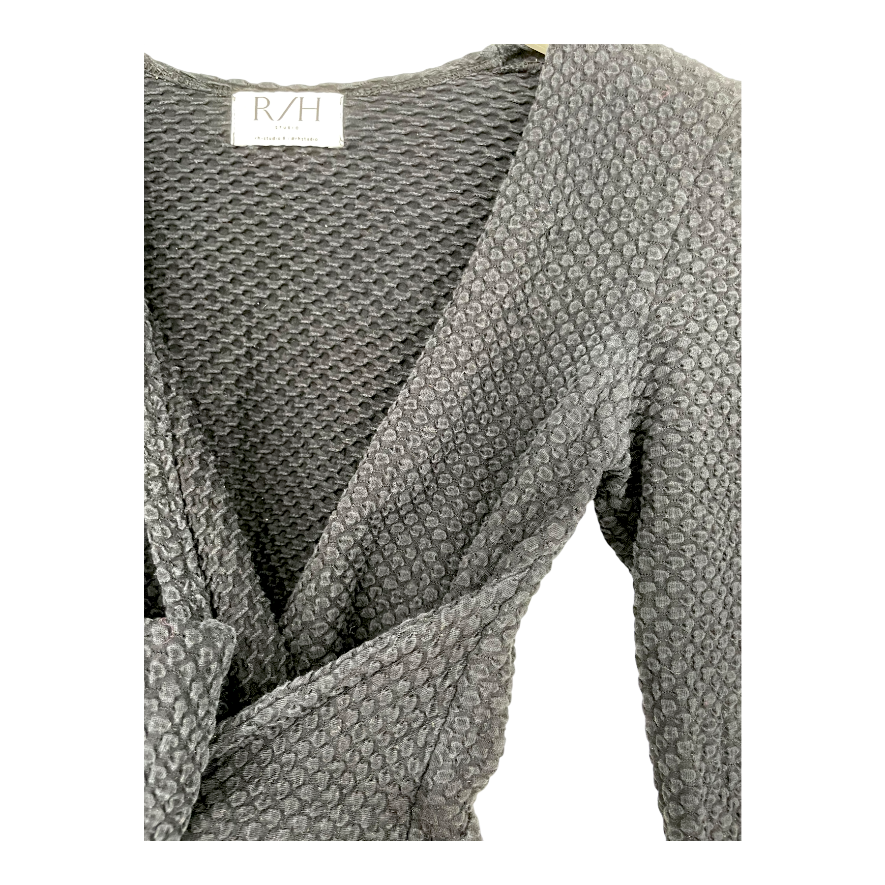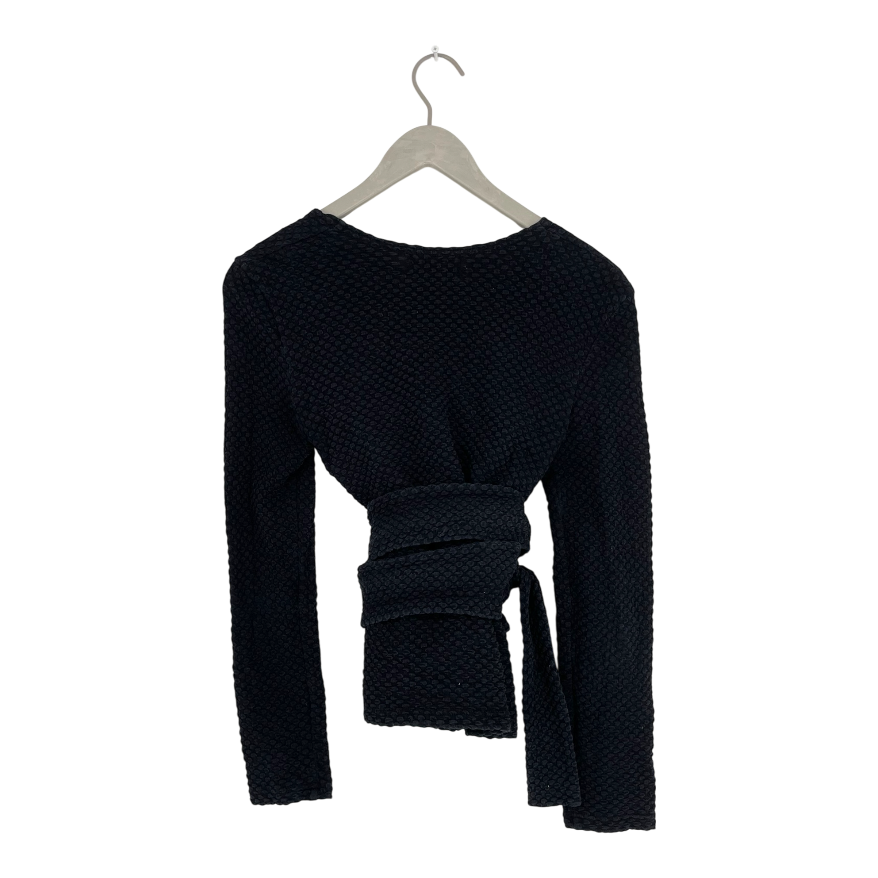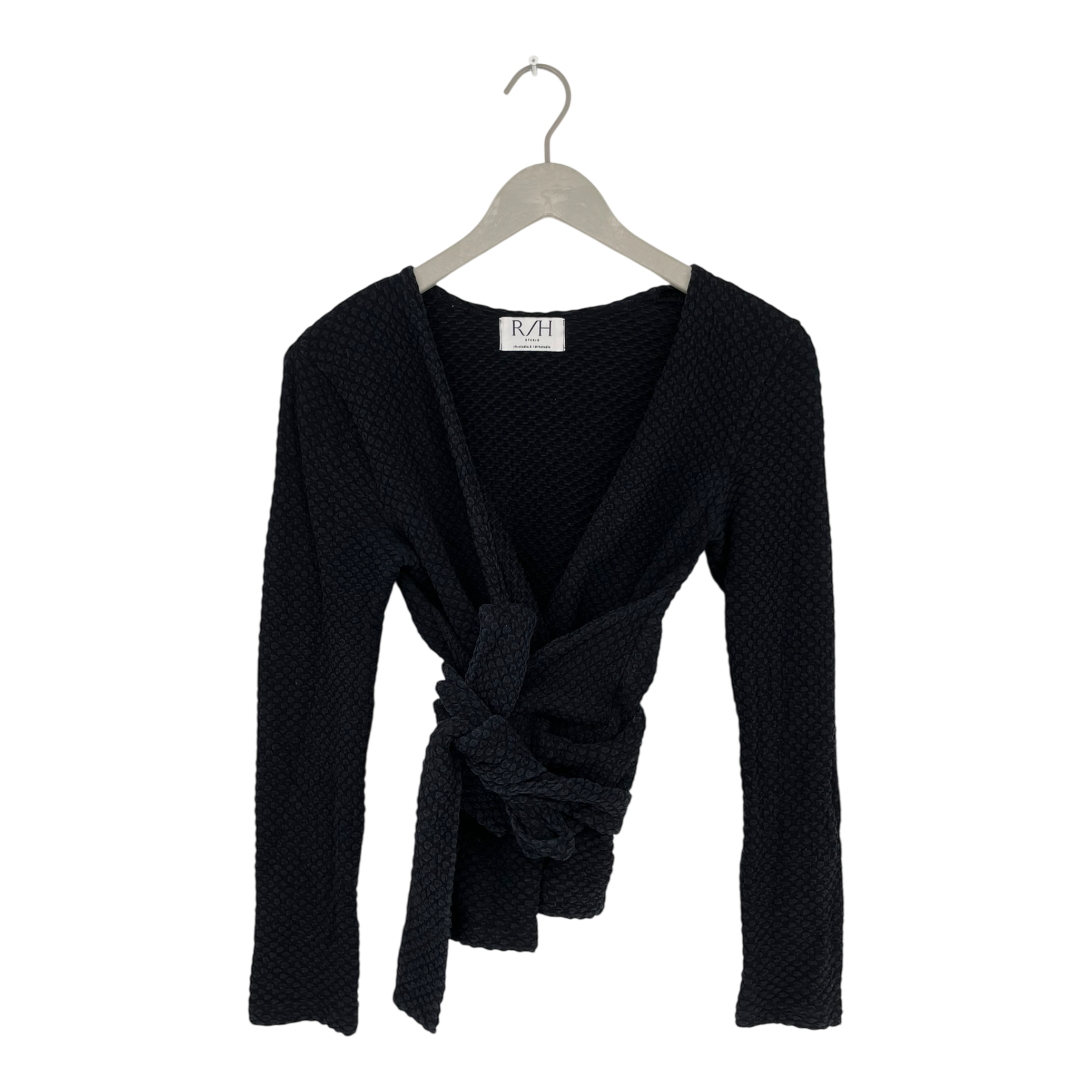 R/H Studio wrap shirt with an adjustable fabric bow. The fabric is slightly structured. 3/4 style sleeves. The color has faded.