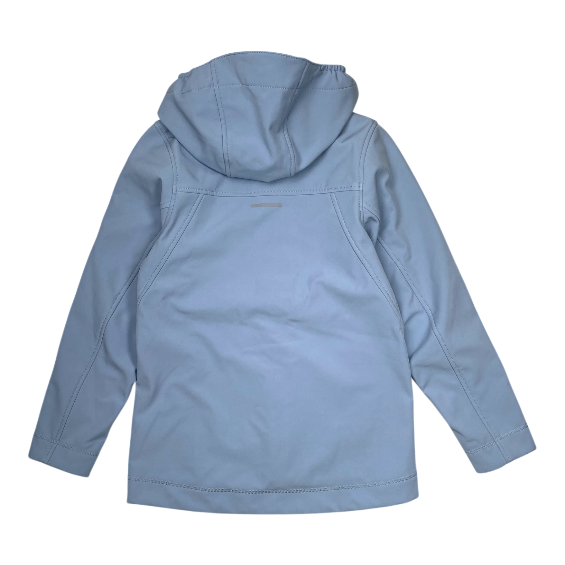 Reima Espoo softshell jacket with detachable hood, zip closure, and side pockets.