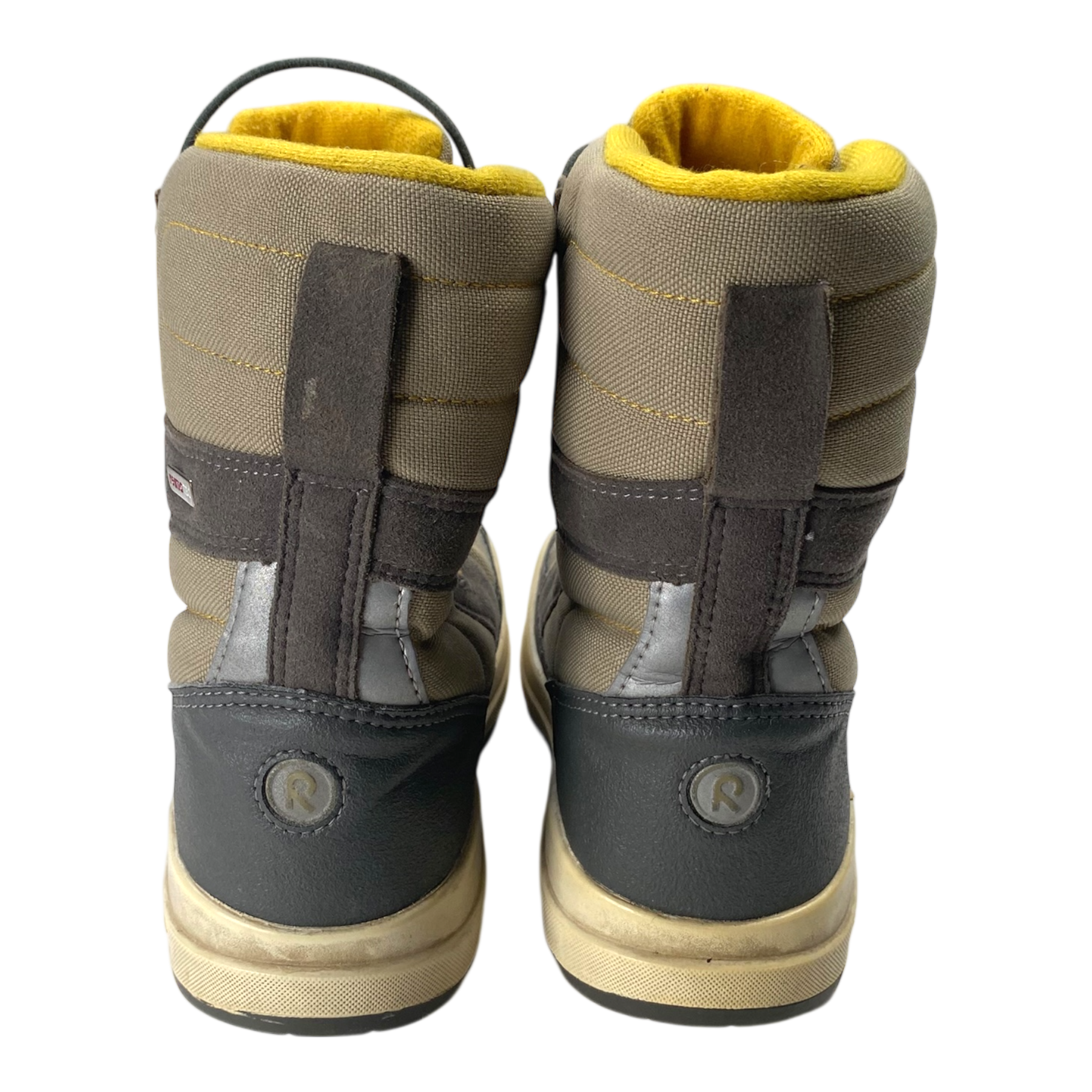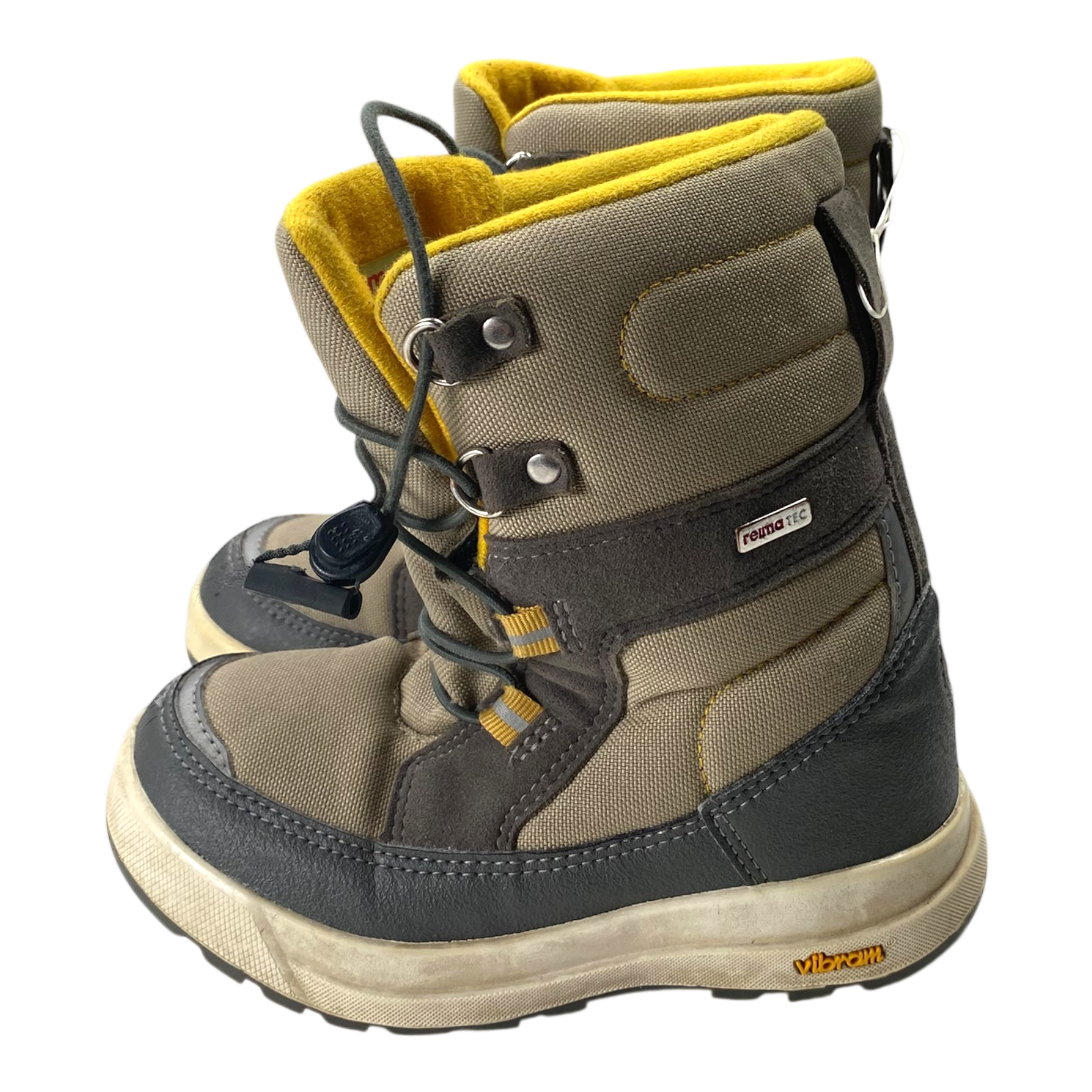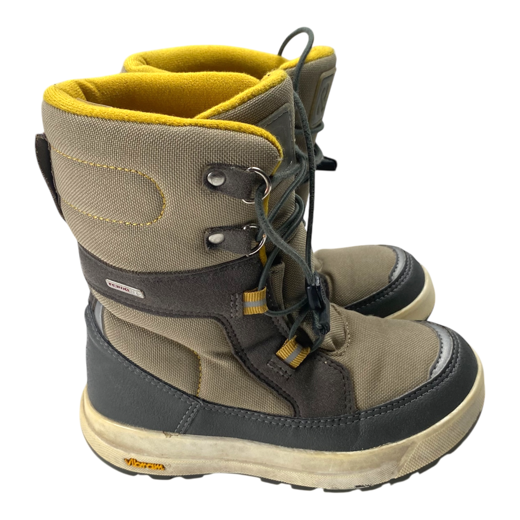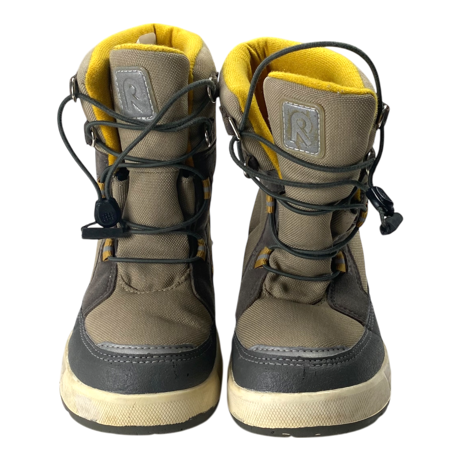 Reima kids' Laplander Arctic Grip winter boots has rubber sole and elastic lacing. Originally waterproof Reimatec boots are made of synthetic textile material and is equipped with a waterproof sealed insert, a warm fleece lining and very warm insulation.