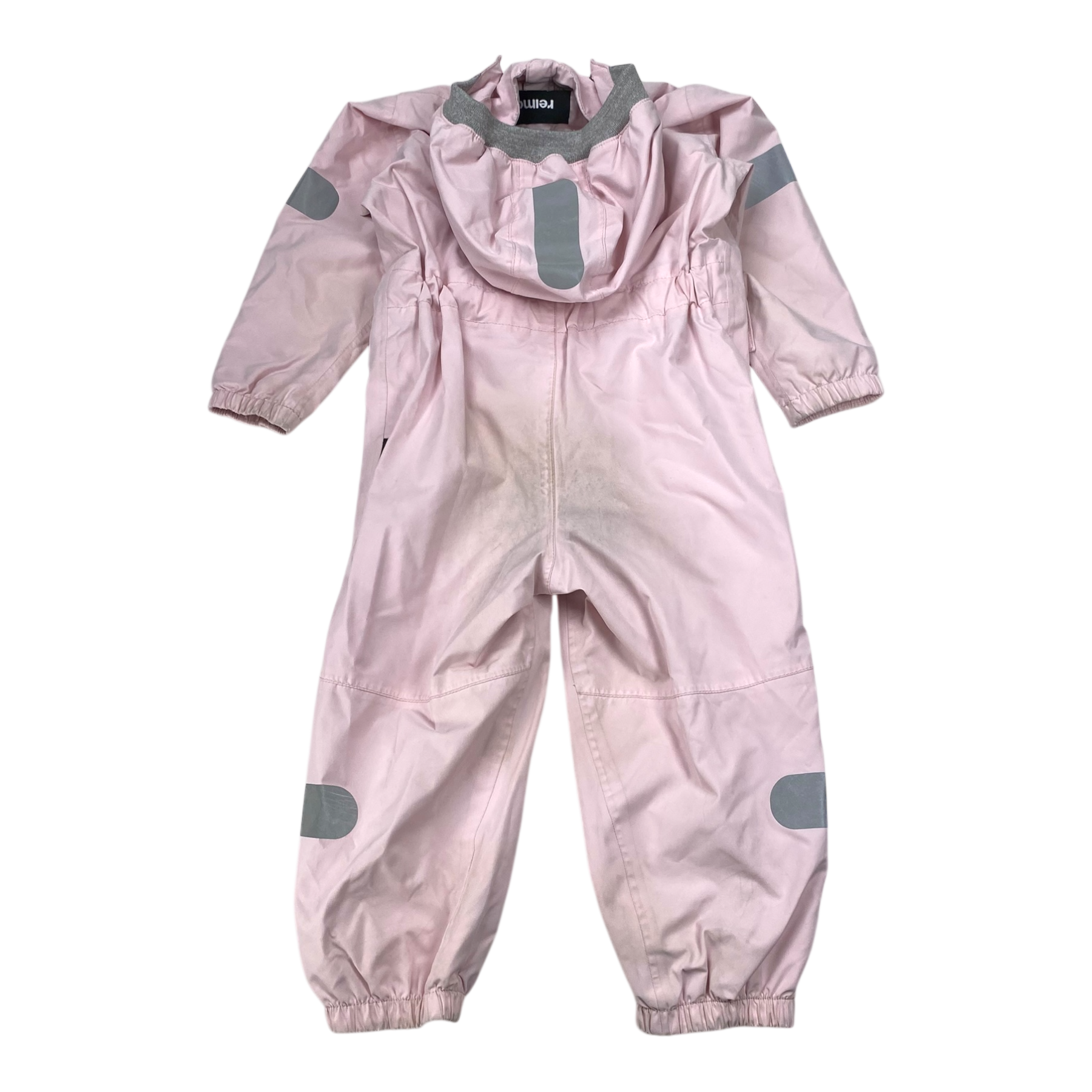 Reimatec Marssi midseason overall with detachable hood, zip closure, reflective details, two flap pockets, durable foot loops, and adjustable elastic on the waist. Originally waterproof and all seams are sealed. Material is originally water and dirt repellent. The item has stains.