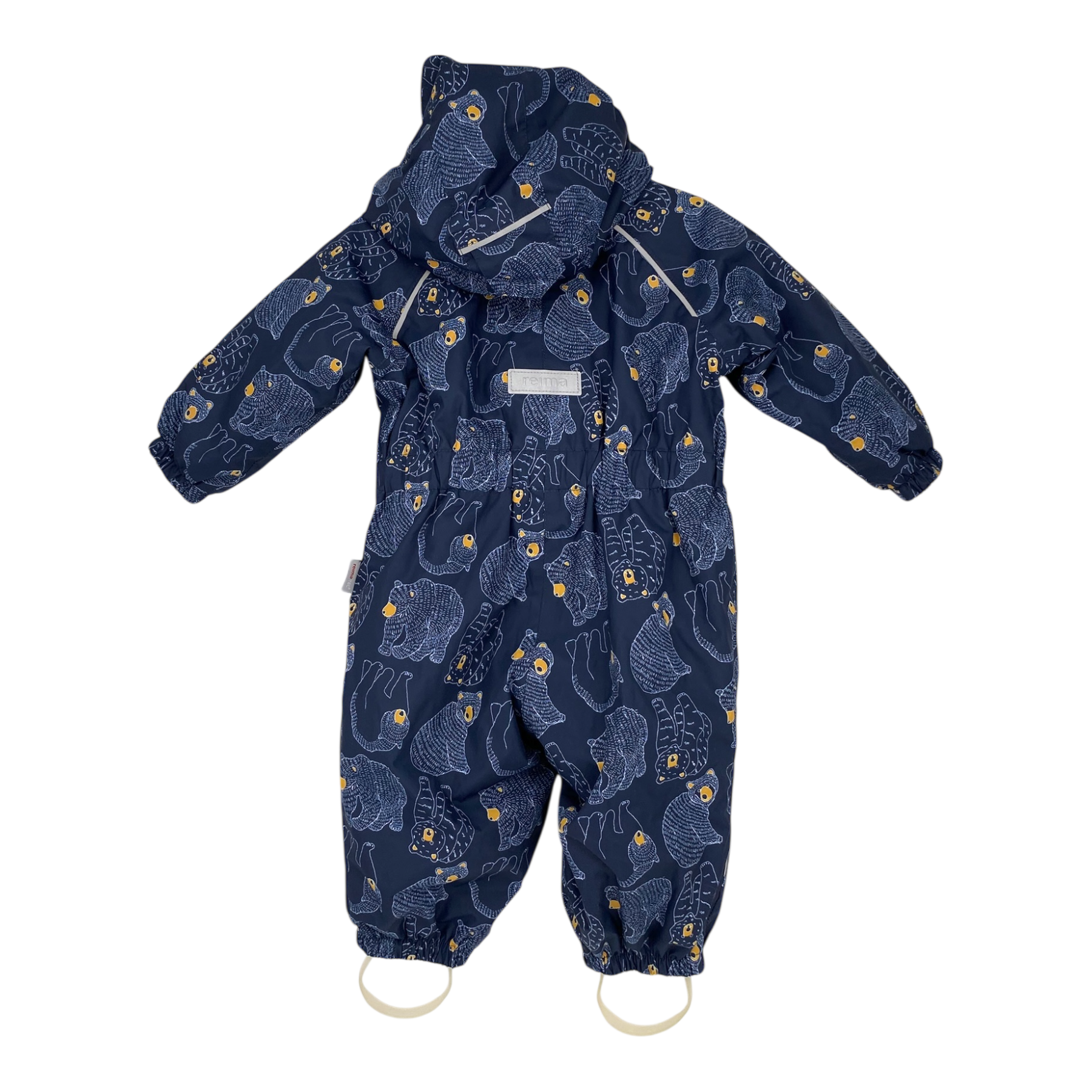 Reima Pirtti kid's overall for winter in a flower print has originally been waterproof up to 10 000mm water column. The overall has a removable hood, one zipper pocket and detachable silicone foot loops.