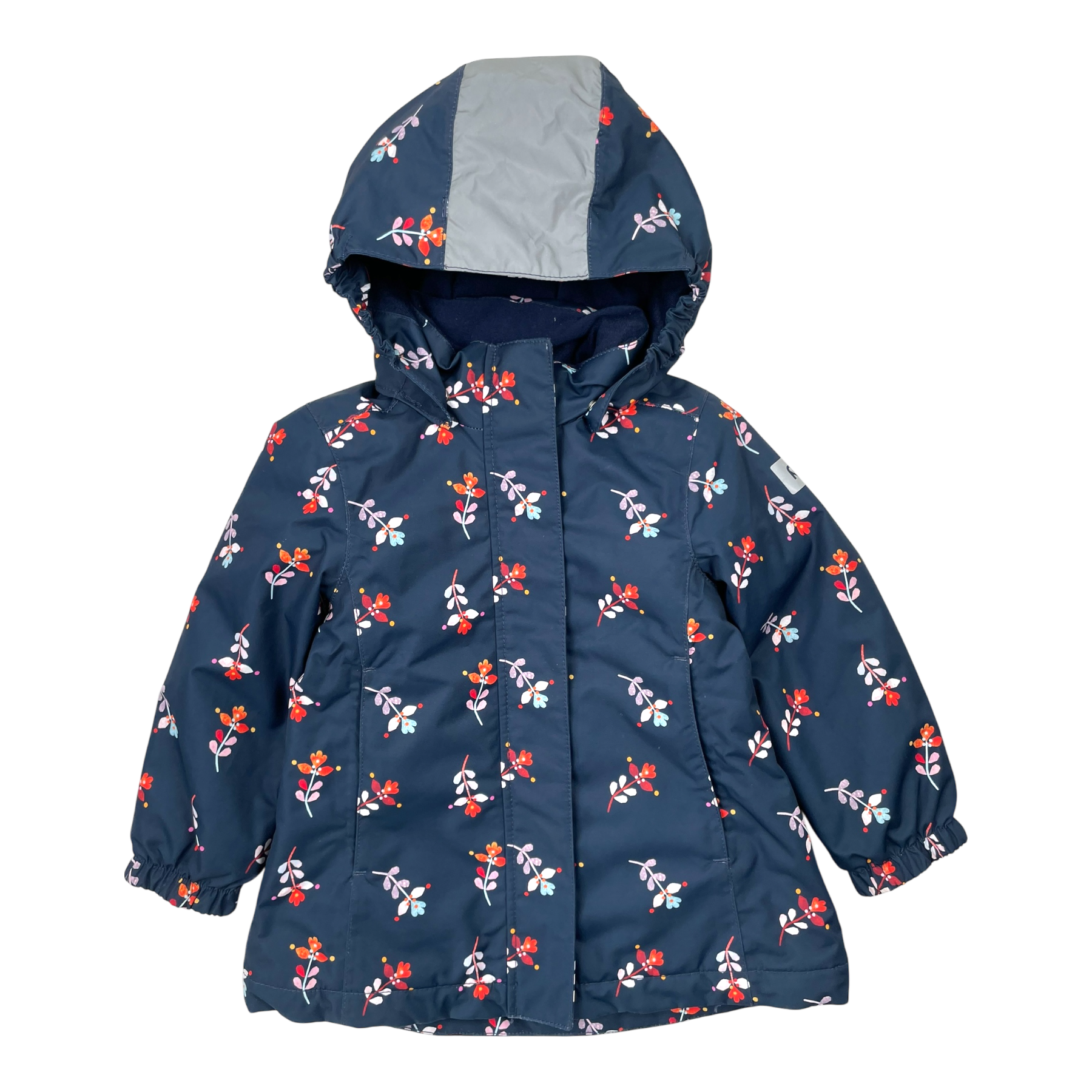 Reima Toki winter jacket with detachable hood, zip pockets on sides, big reflective detail on the hood, adjustable elastic on the hem, and waist. The material is originally waterproof up to 10,000 water column, and all the seams are sealed. Jacket is also wind- and dirt repellent, so it's easy to take care of.