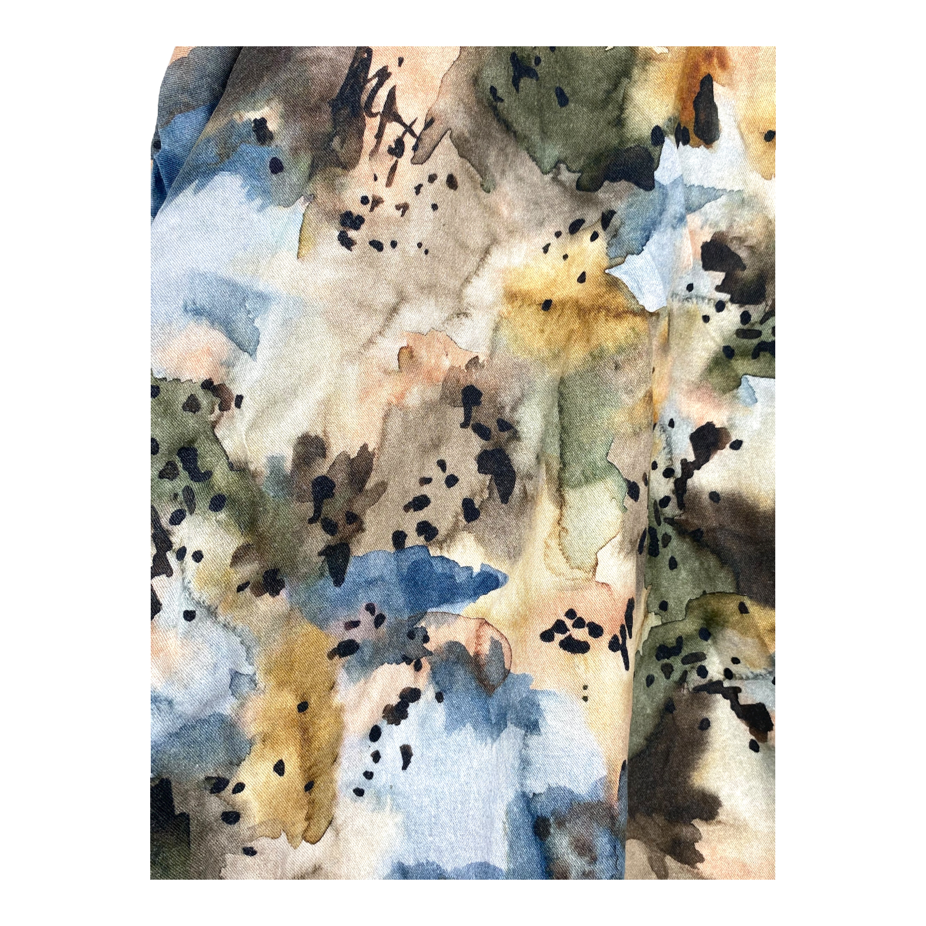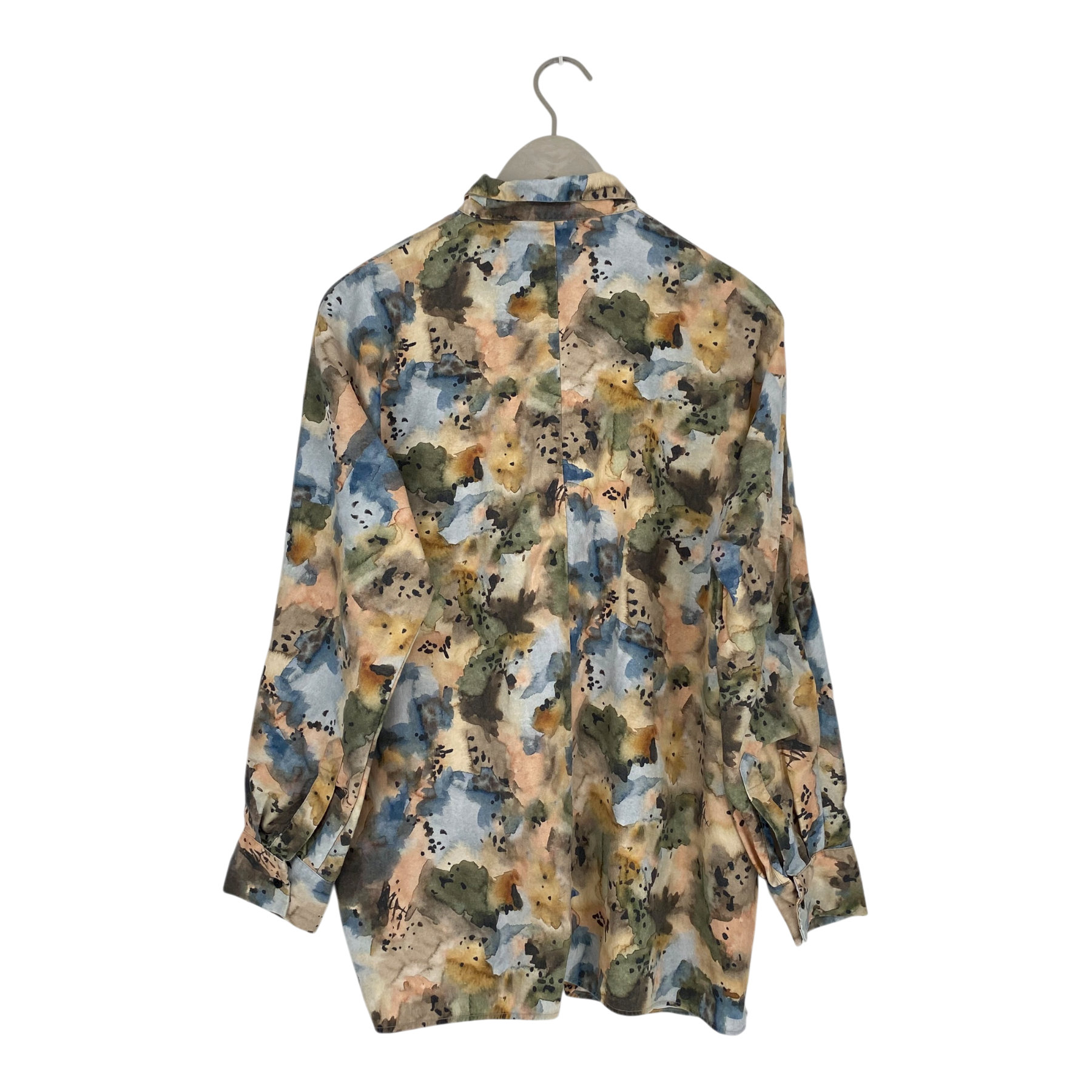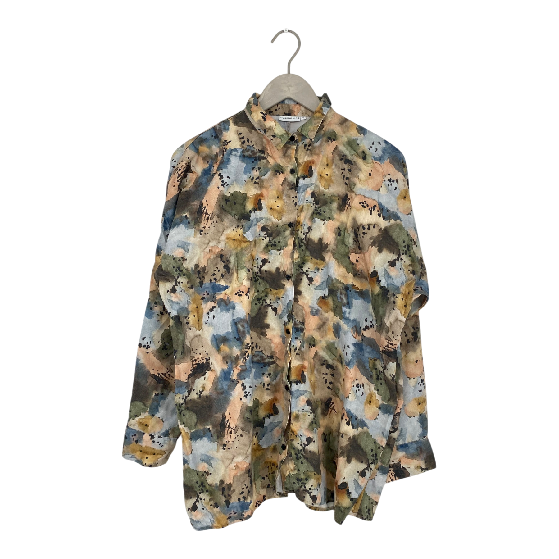 Riva Clothing long sleeve shirt with buttons on the front, dropped shoulders in an abstract watercolor print. The print has faded somewhat, as can be seen in the pictures.