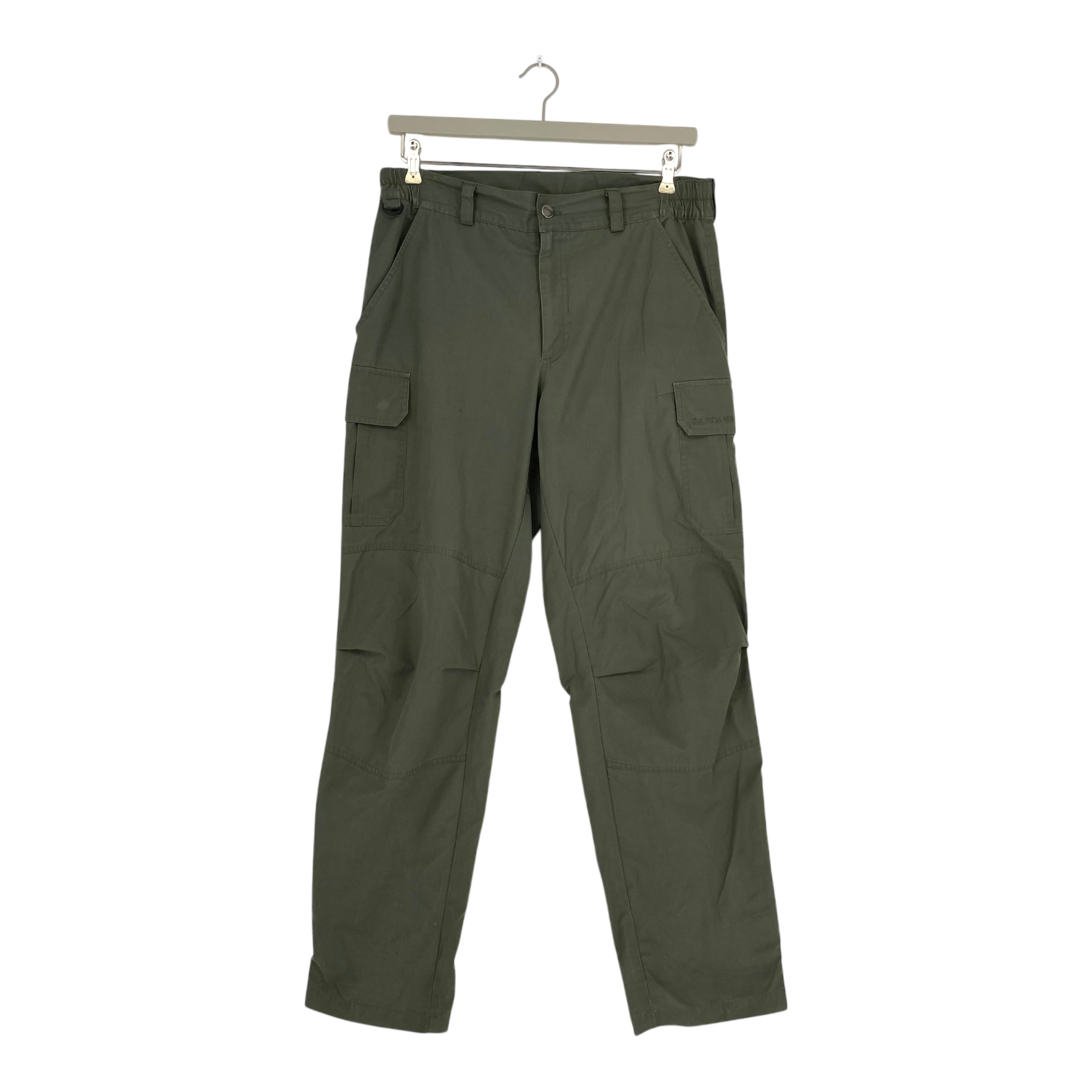 Sasta men's woven outdoor pants with two side pockets, two thigh pockets and one pocket in the back. Elasticated waistband with belt loops and adjustable cuffs.