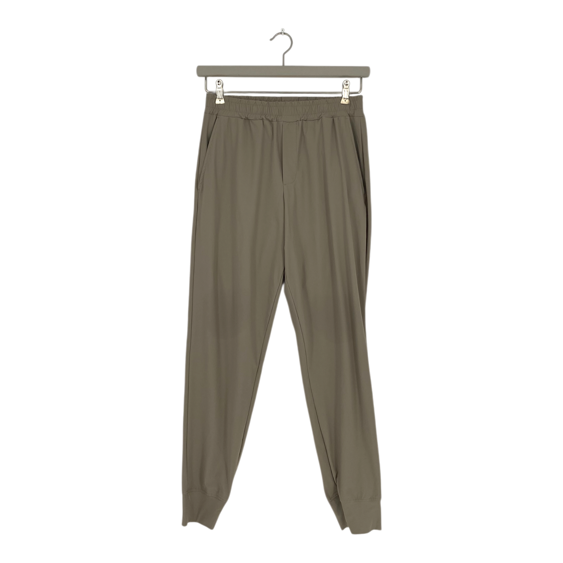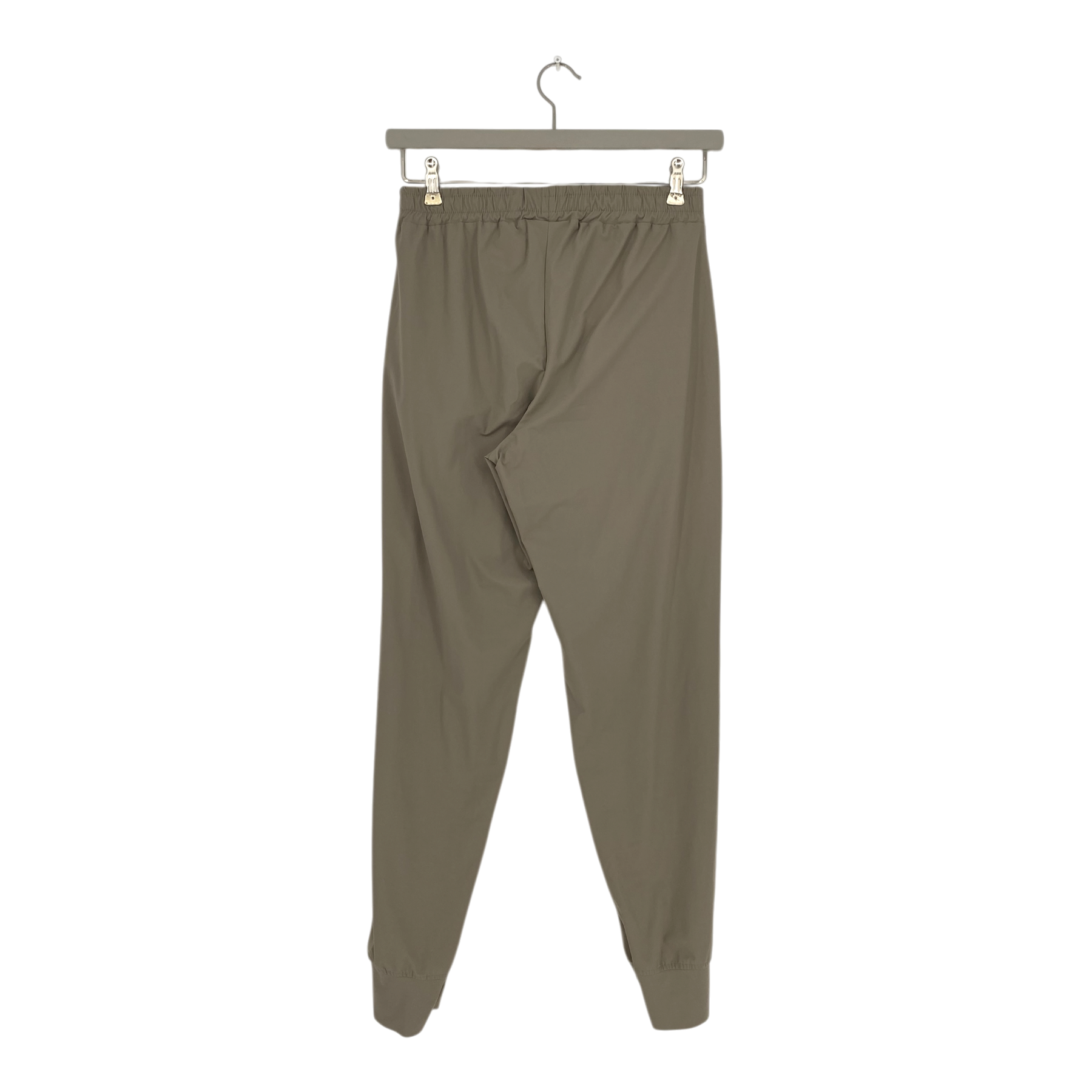 Toive Hehku joggers with narrowing fit on the legs, two pockets, hidden string closure on in the waistband and a decorative fly on the front. The loose seam on the inside of the back elastic appears to be a defect from manufacturing.