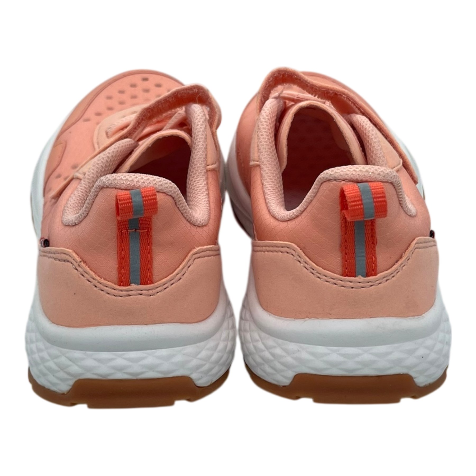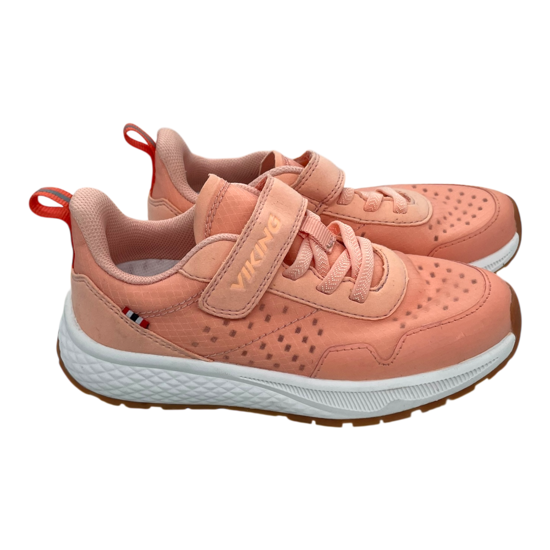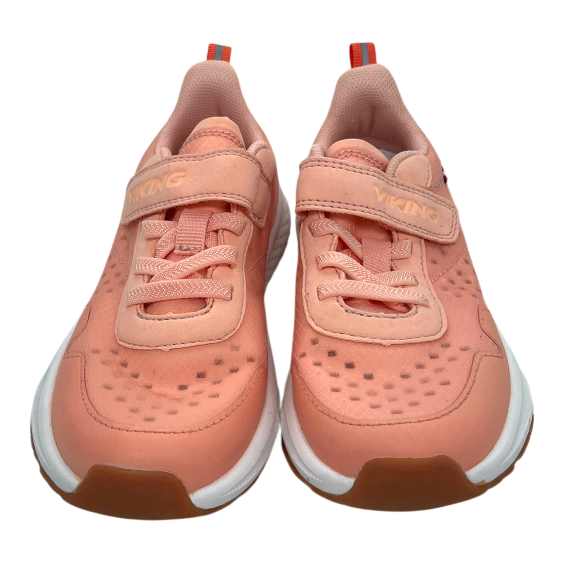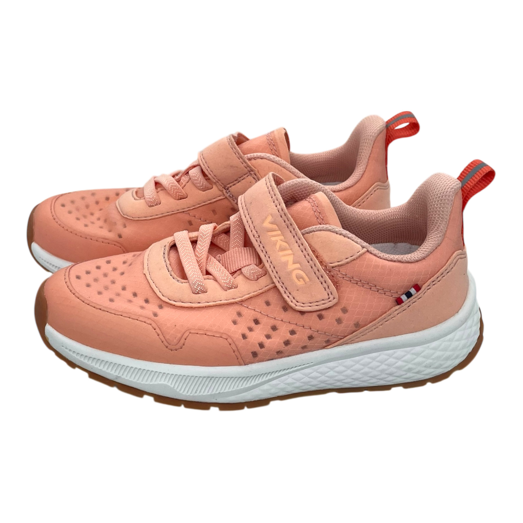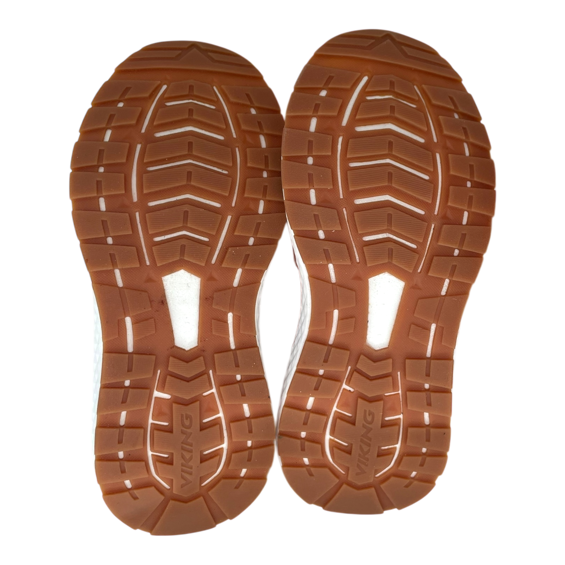 Viking sneakers for kids are lightweight and easy to wear. The shoes feature elastic laces that look like traditional laces but stretch for convenience, making them simple for children to put on and take off. A Velcro strap at the front provides additional adjustability, and a pull loop at the heel helps with slipping the shoes on.