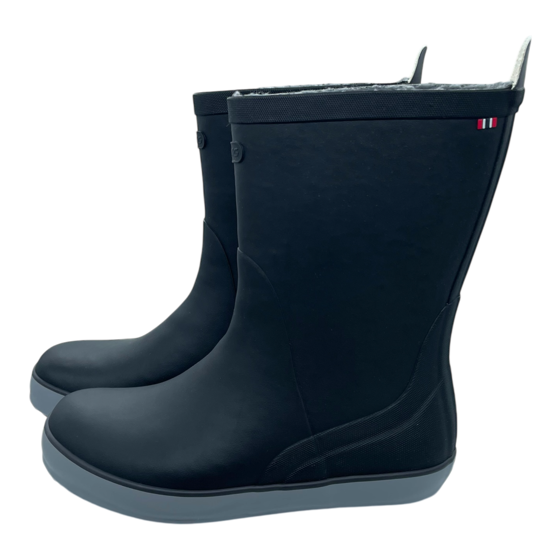 Viking winter rubber boot features an adjustable buckle on the shaft that serves as a stylish design detail while also providing a truly functional fit adjustment. The boot is lined with a warm winter lining to keep feet comfortable in cold conditions. The boots are black in color, complemented by light grey details that add a classic and refined look.