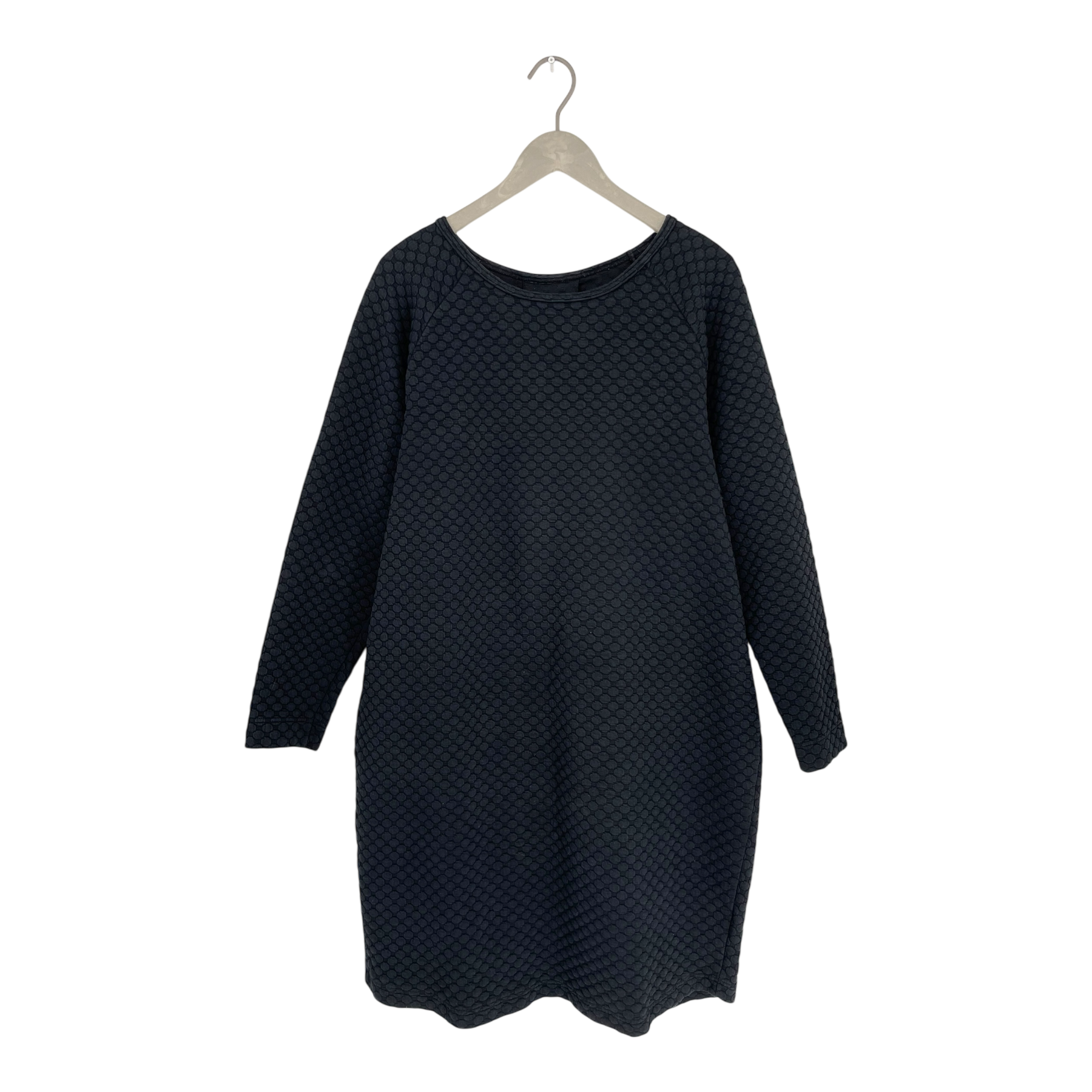 Aarre tunic dress with “bubble” knit structure and big fold on the back. Full length raglan sleeves, downwards narrowing and slightly rounded hem.