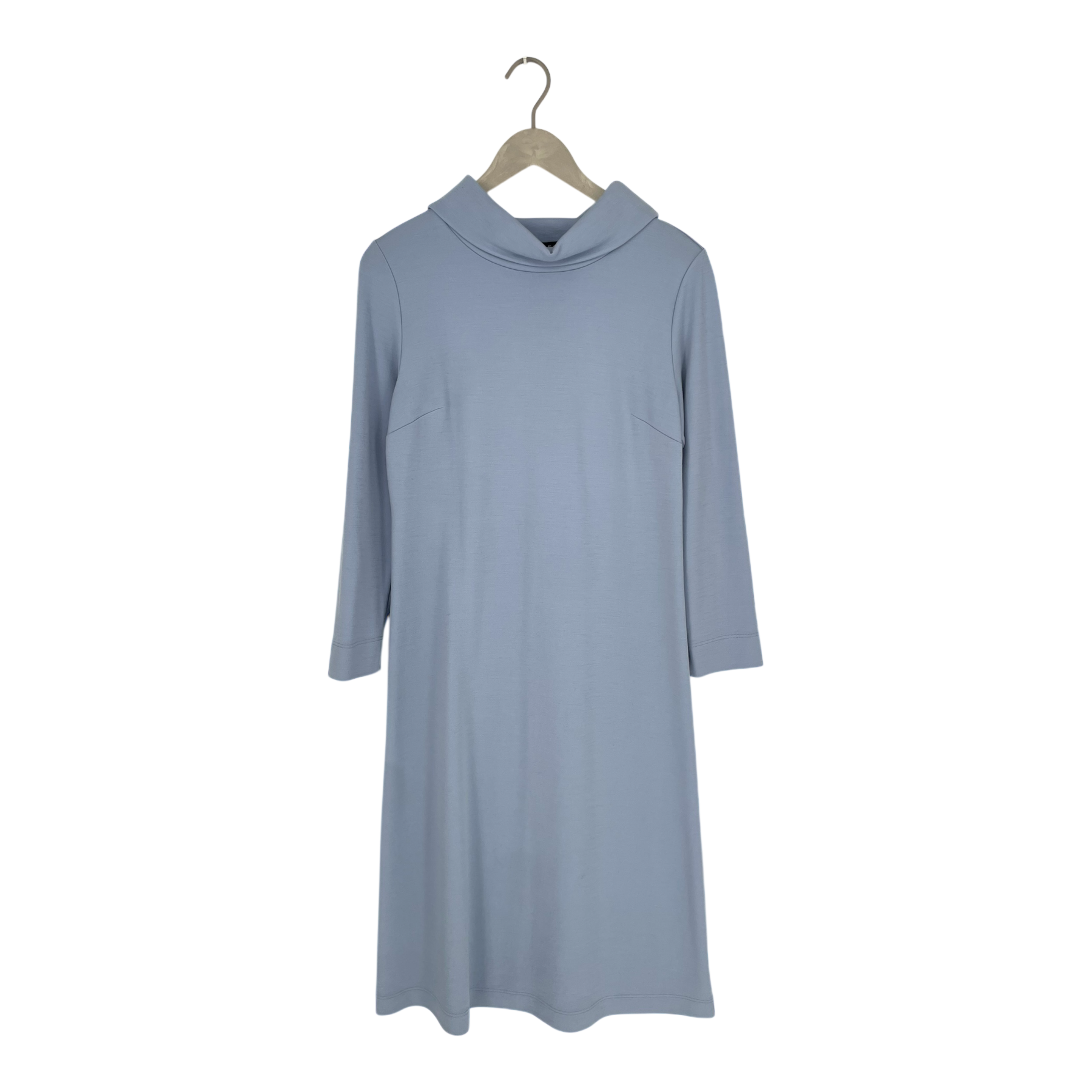Falla Finland Angervo wool tricot dress in light blue. Wide turtleneck and slits on the sleeve ends. This is a sample item so laundry tag is missing.