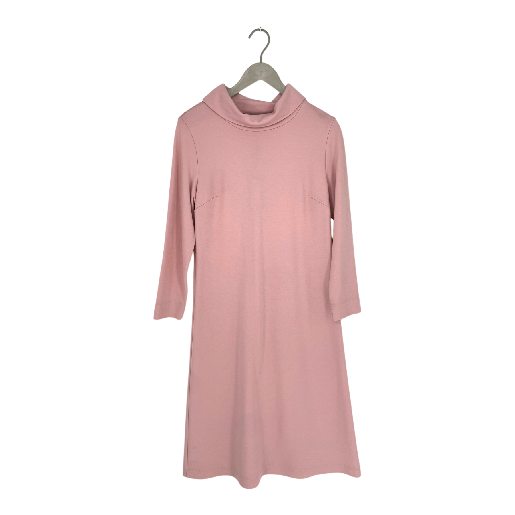 Falla Finland Angervo wool tricot dress in pink. Wide turtleneck and slits on the sleeve ends. This is a sample item so laundry tag is missing.