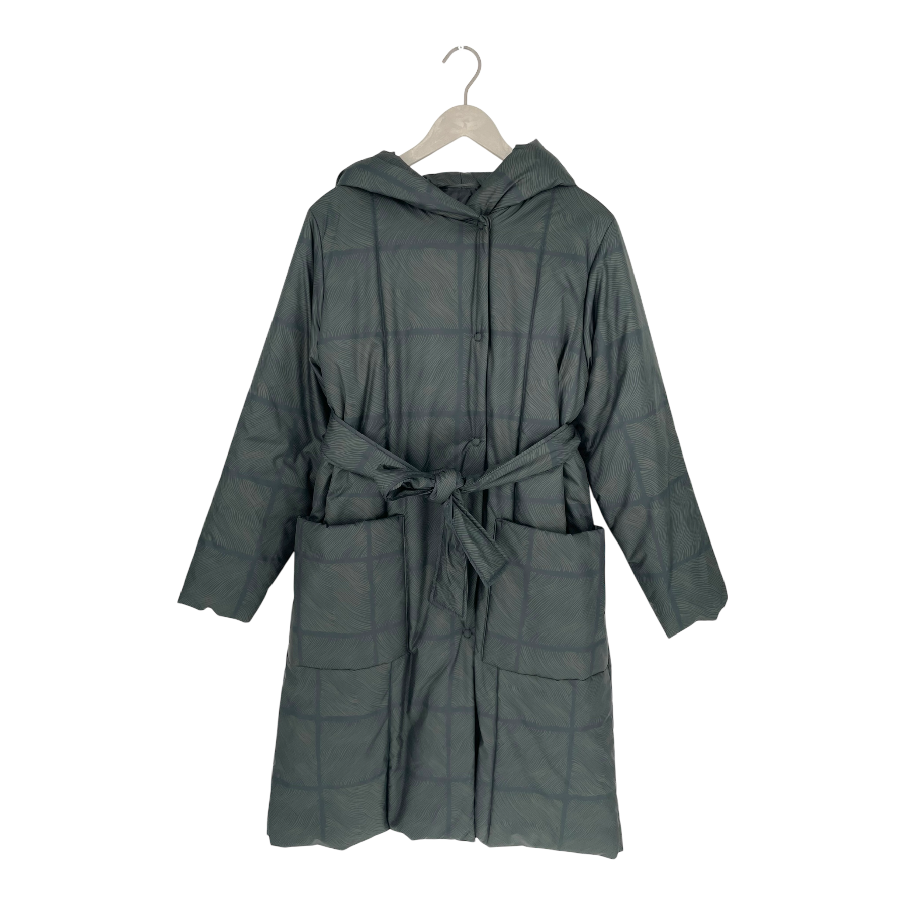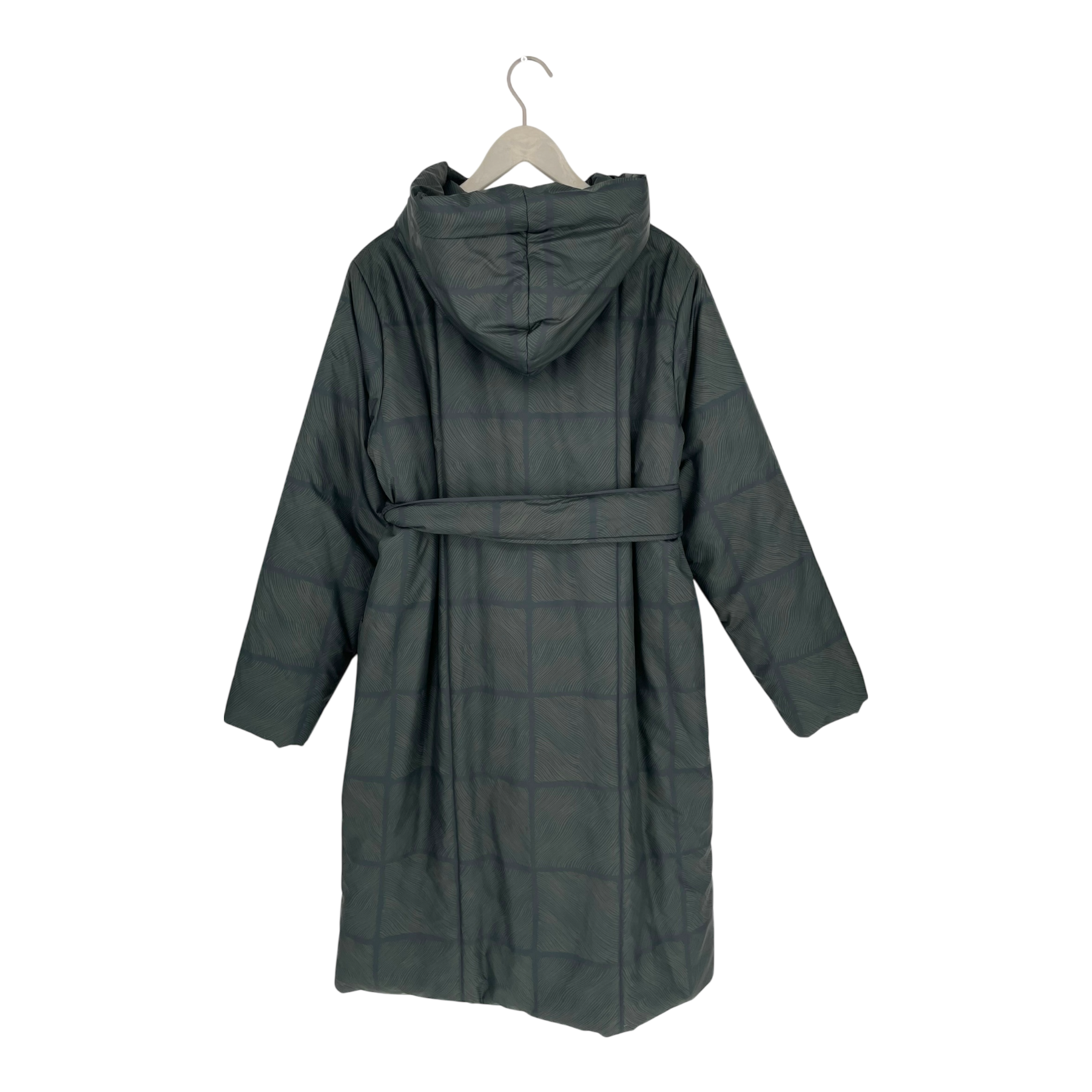 Falla Finland® Puhuri winter jacket is light but warm. The outer material is water-repellent and the color is a slightly shiny dark blue. The jacket features a warm double front fastening with an internal zip and snap buttons, generous flap pockets, a hood, internal elasticated cuffs to prevent wind from blowing through the cuffs, and a detachable belt. This is a sample item so laundry tag is missing.