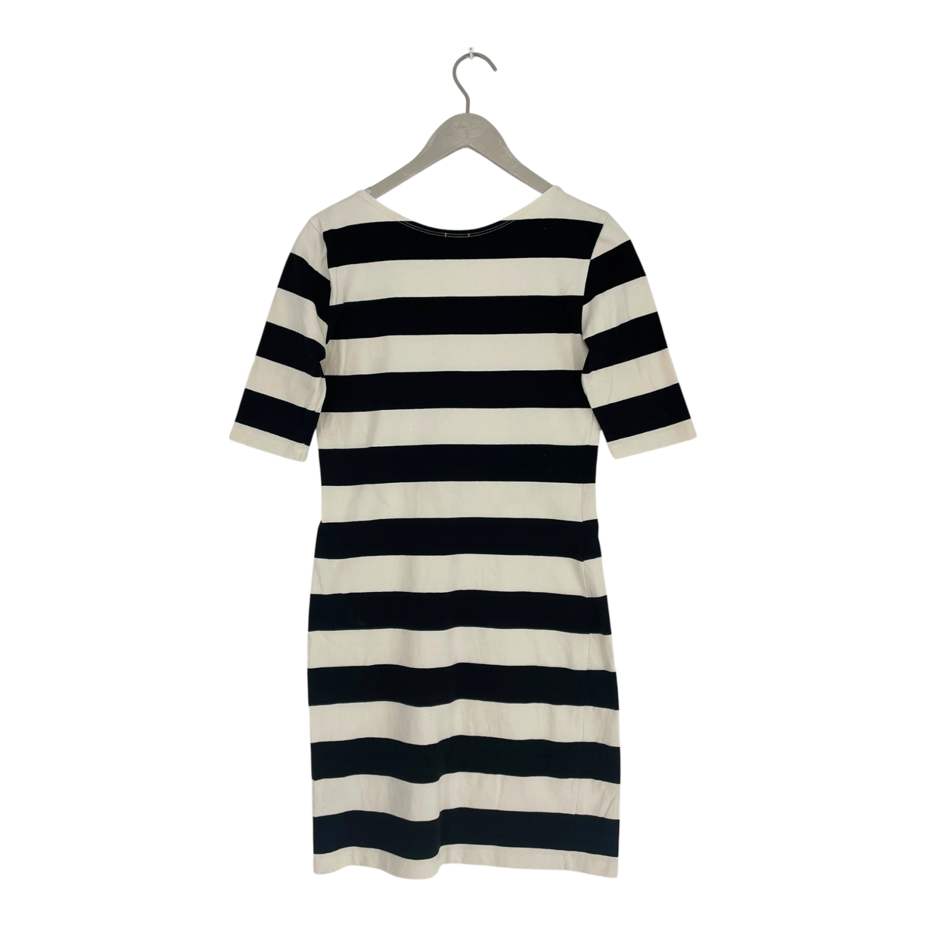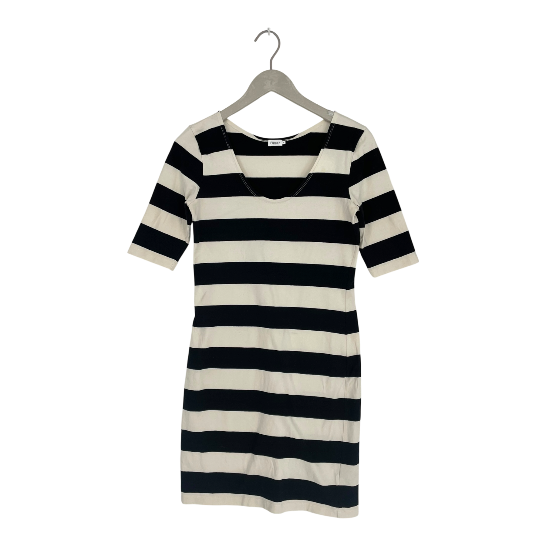 Filippa K women's 3/4 sleeve figure hugging mini/knee length dress. The item has one light stain on the collar and the fabric is somewhat fluffed.