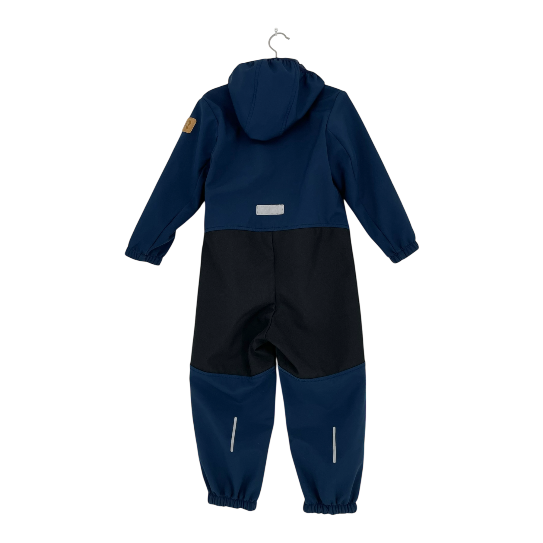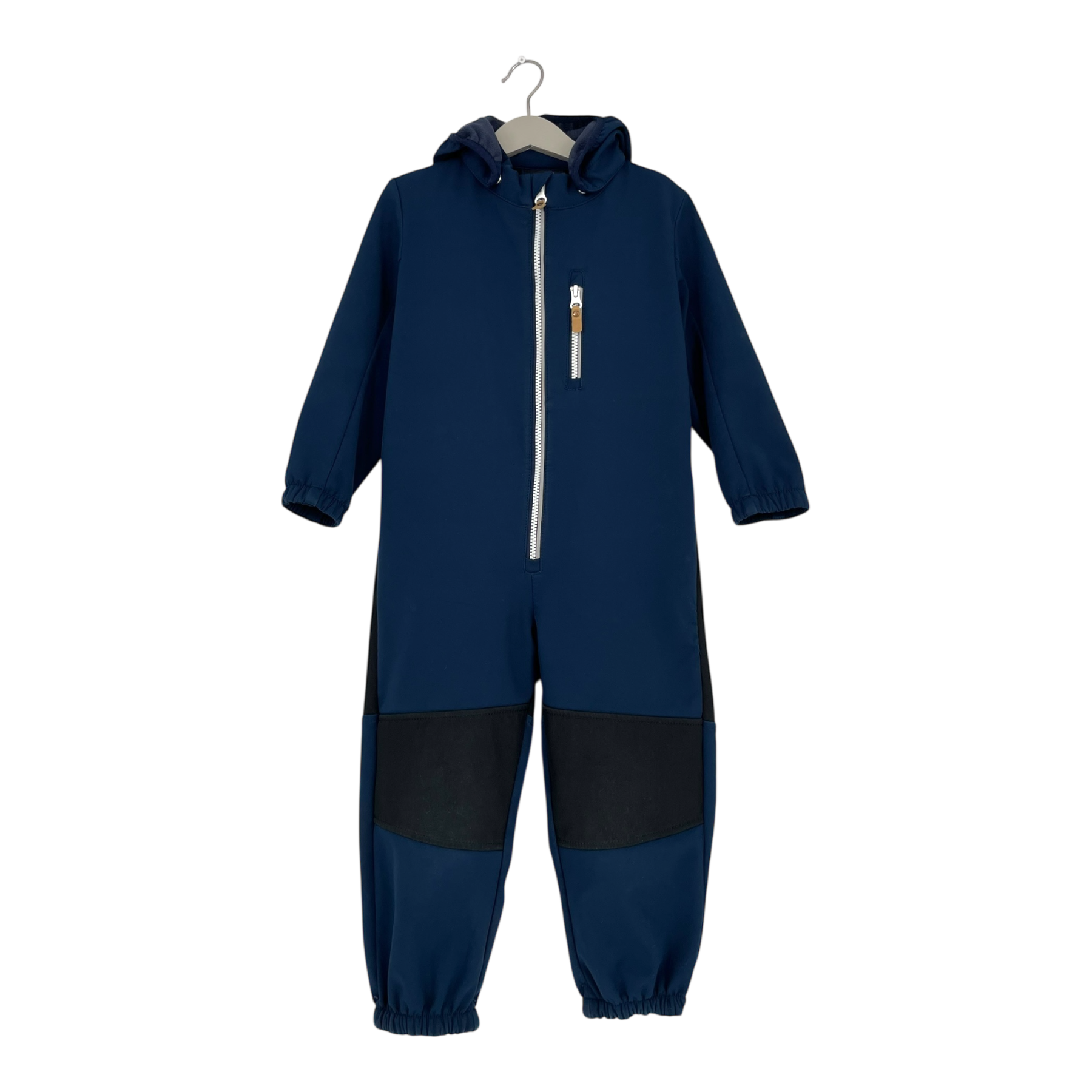 Reima Nurmes softshell midseason overall with durable reinforcements and fleece on reverse. Originally the surface has been treated with water-repellent finish. Elastic cuffs at wrists and leg ends together with the durable, detachable silicone foot loops, detachable hood, a zipper pocket and zipper fastening in the front.