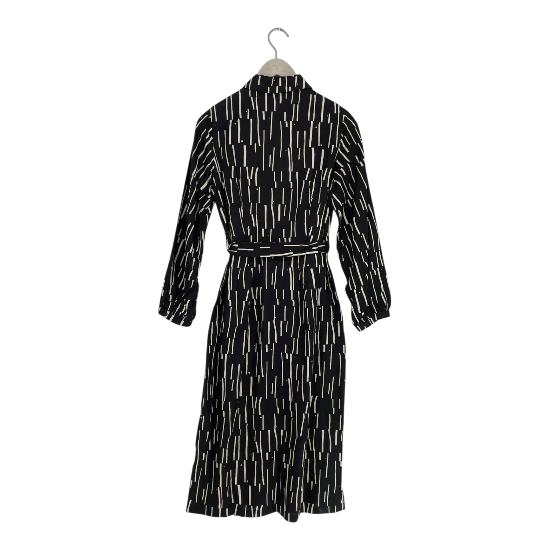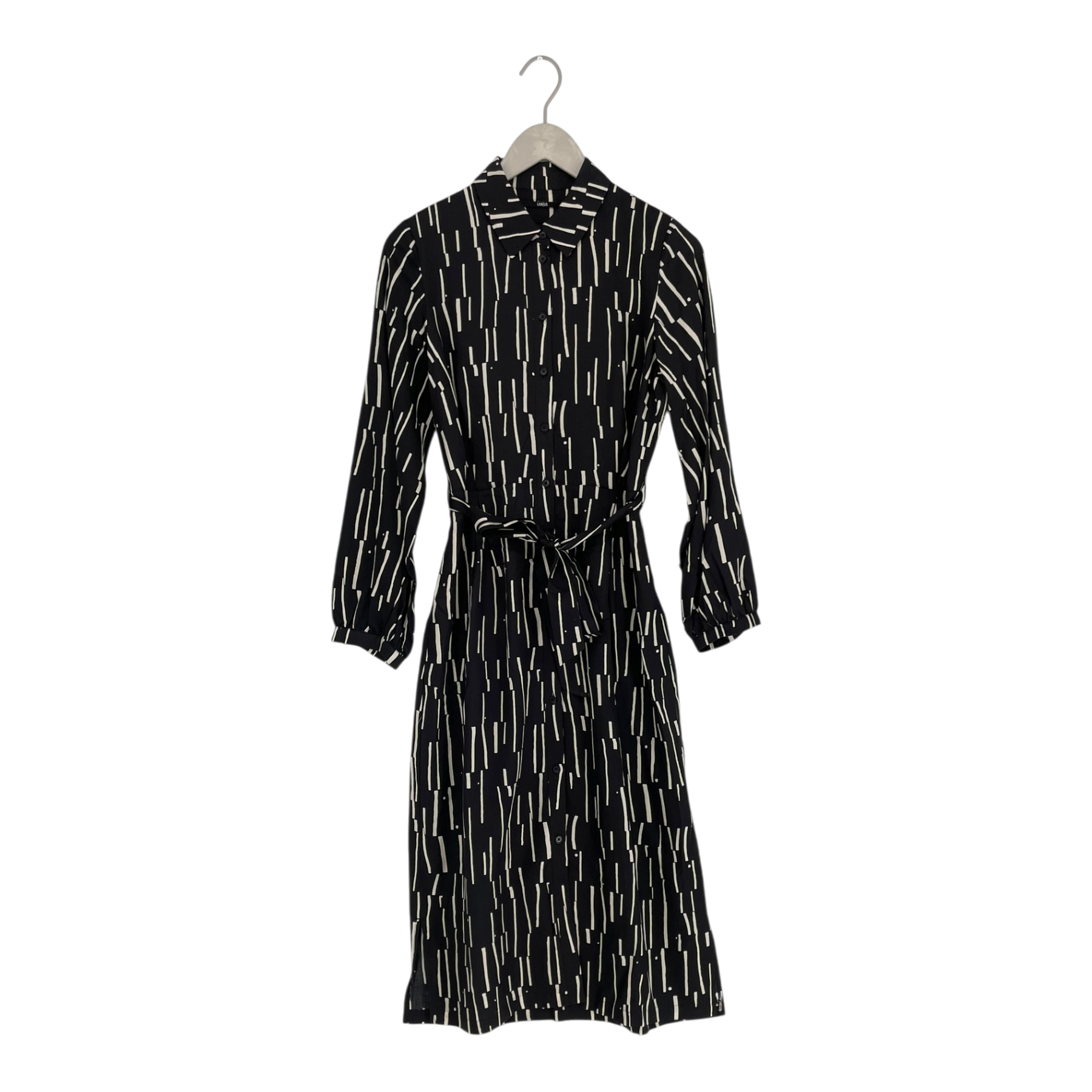 Lanius midi dress featuring a black base with white abstract linear print. Long sleeves with button cuffs, high neckline, and self-tie belt at waist. Flowing silhouette with midi length.