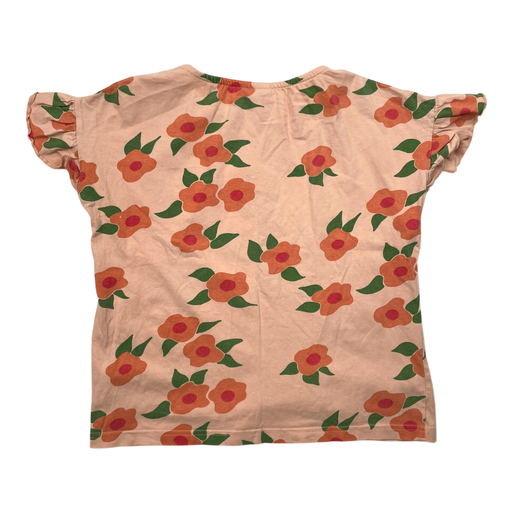 Mainio tricot t-shirt in Midsummer rose print with frills on the sleeves. The color is slightly faded all around the garment.