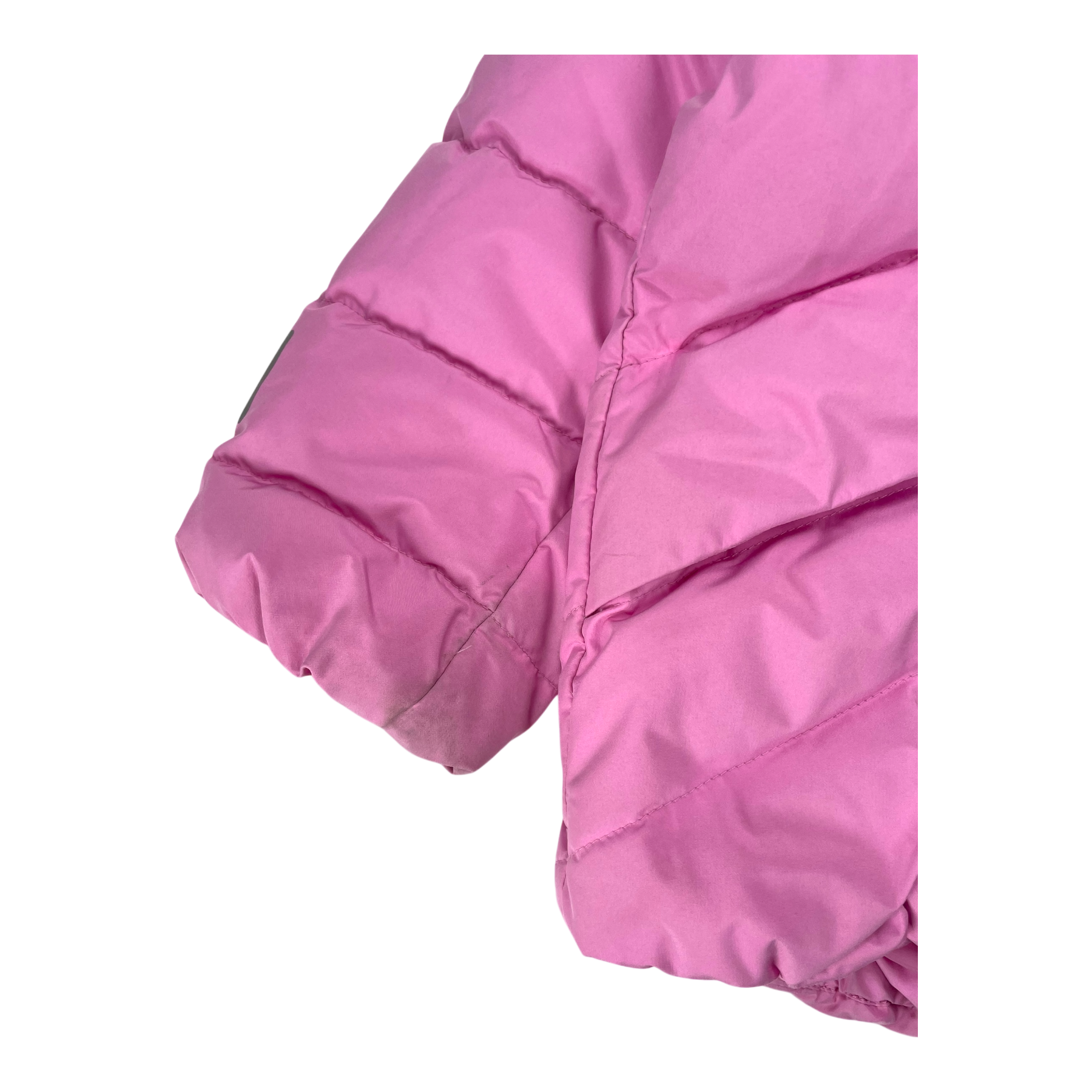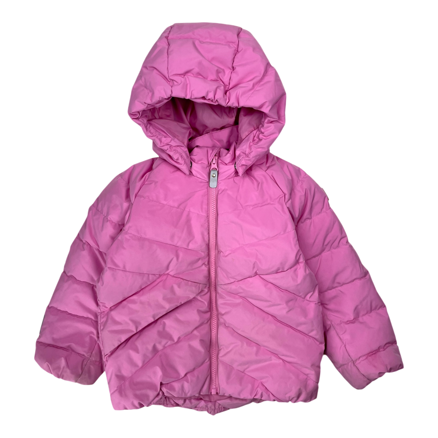 Reima Kupponen down winter jacket with detachable hood and one zip pocket on the front. The fabric stores heat, and the down insulation ensures that your little one stays warm outdoors. This winter jacket has originally a fluorine-free water- and dirt repellent finish up to 10,000mm water column.
