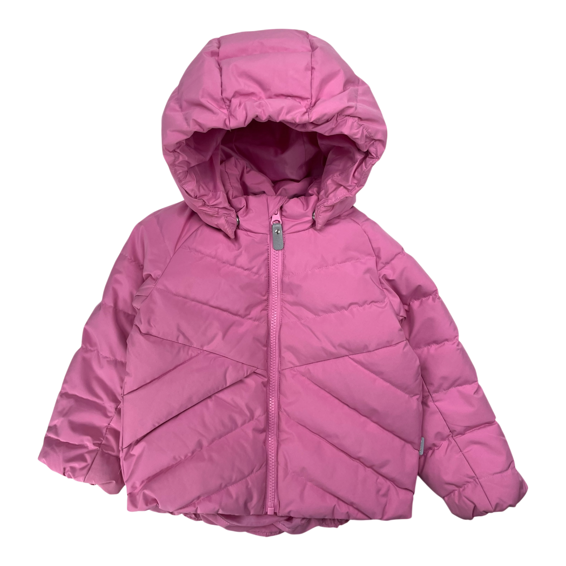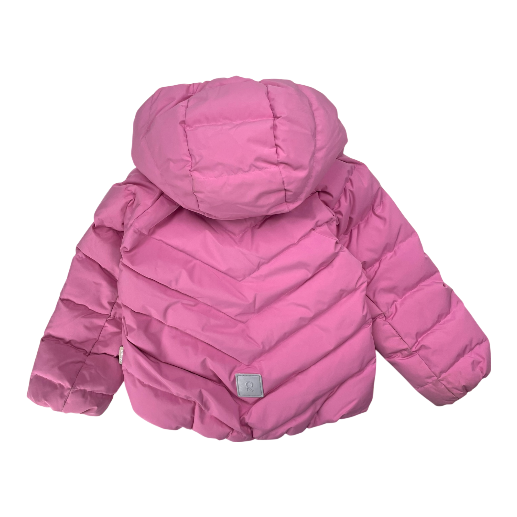Reima Kupponen down winter jacket with detachable hood and one zip pocket on the front. The fabric stores heat, and the down insulation ensures that your little one stays warm outdoors. This winter jacket has originally a fluorine-free water- and dirt repellent finish up to 10,000mm water column.