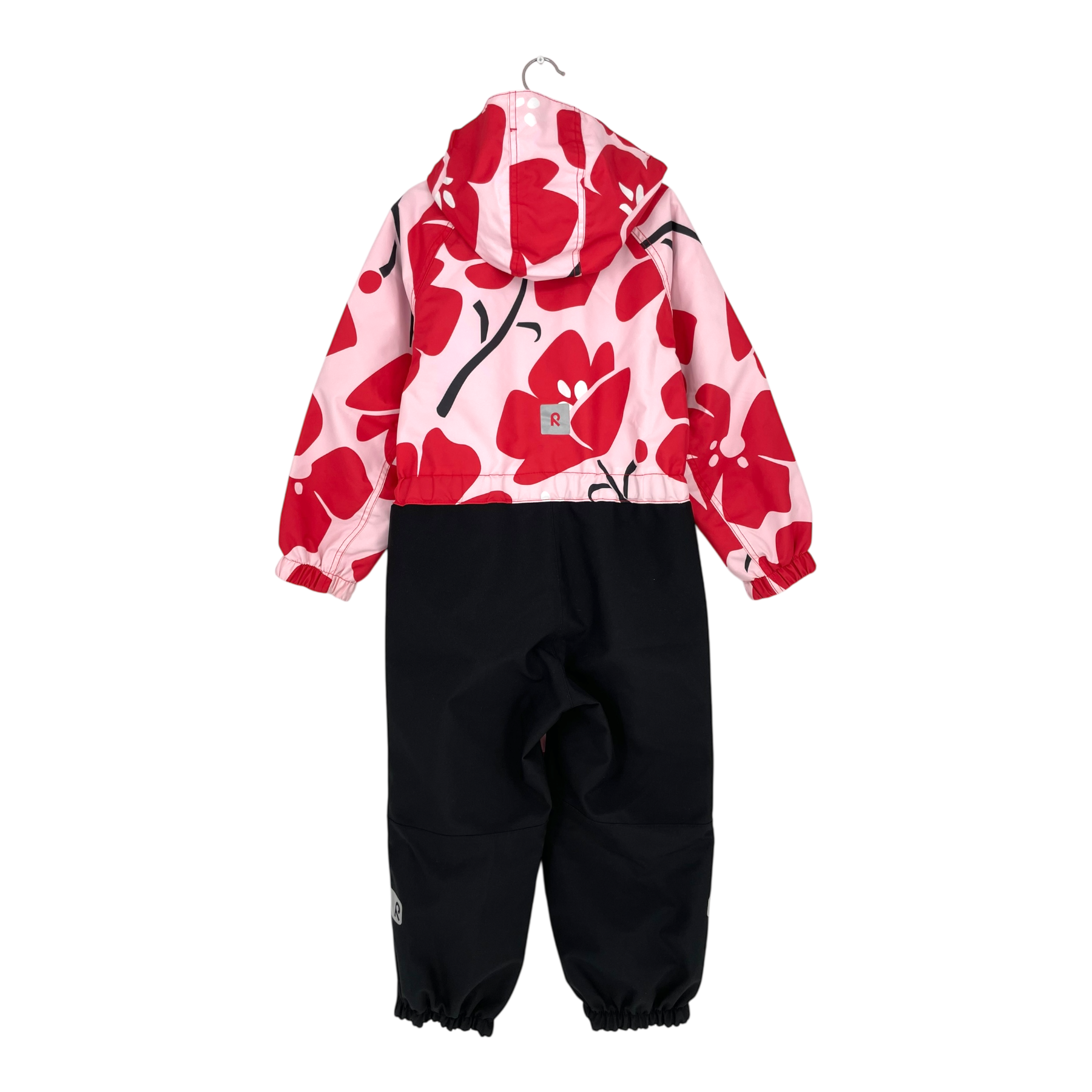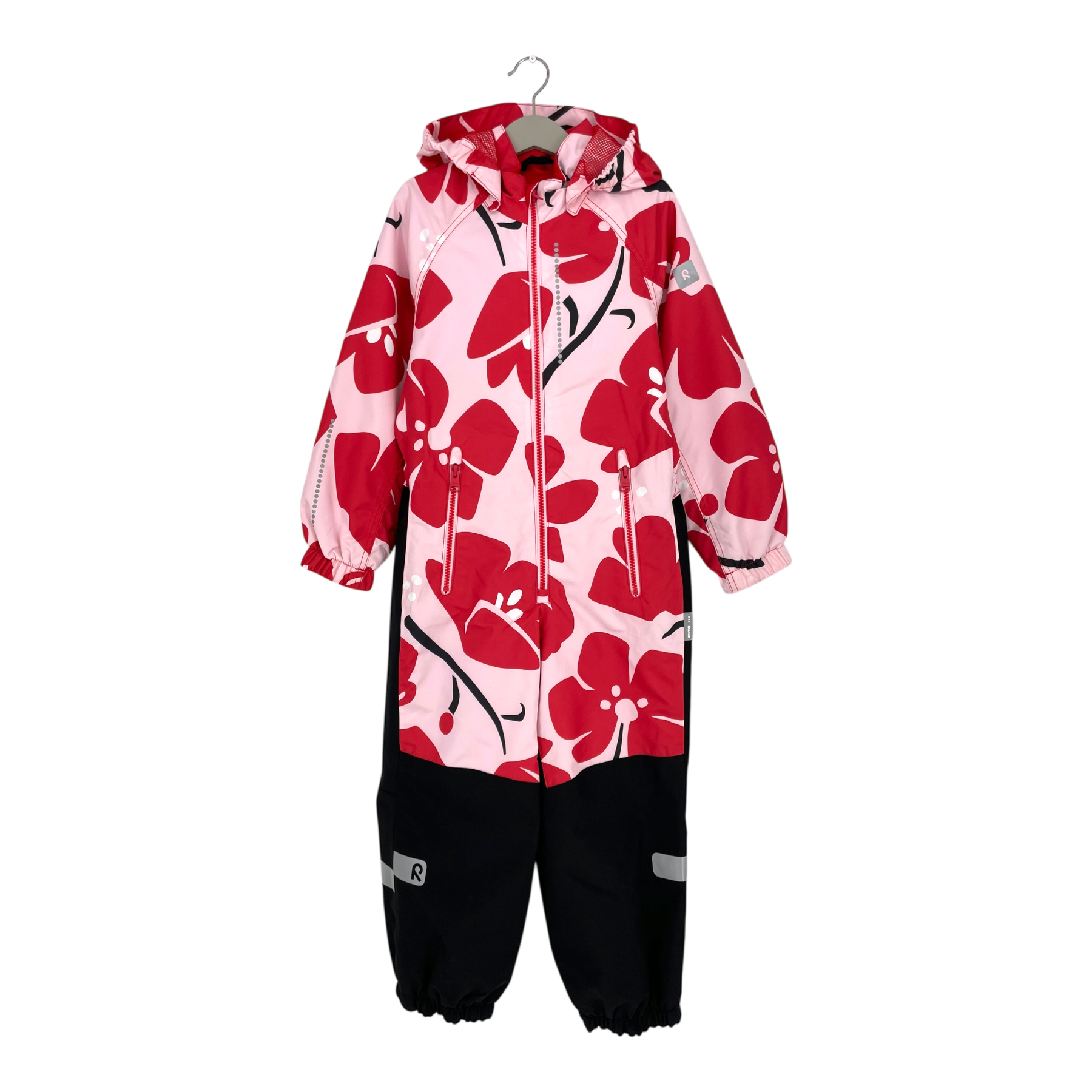 Reima Karikko midseason overall with detachable hood, zip pockets on sides, reflective details, and adjustable elastic on the waist. The material is originally waterproof up to 10,000mm water column. All seams are sealed, and the material is very durable.