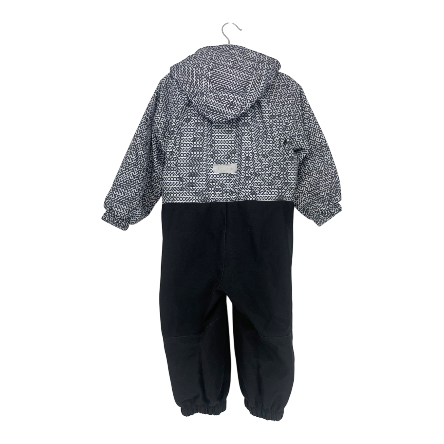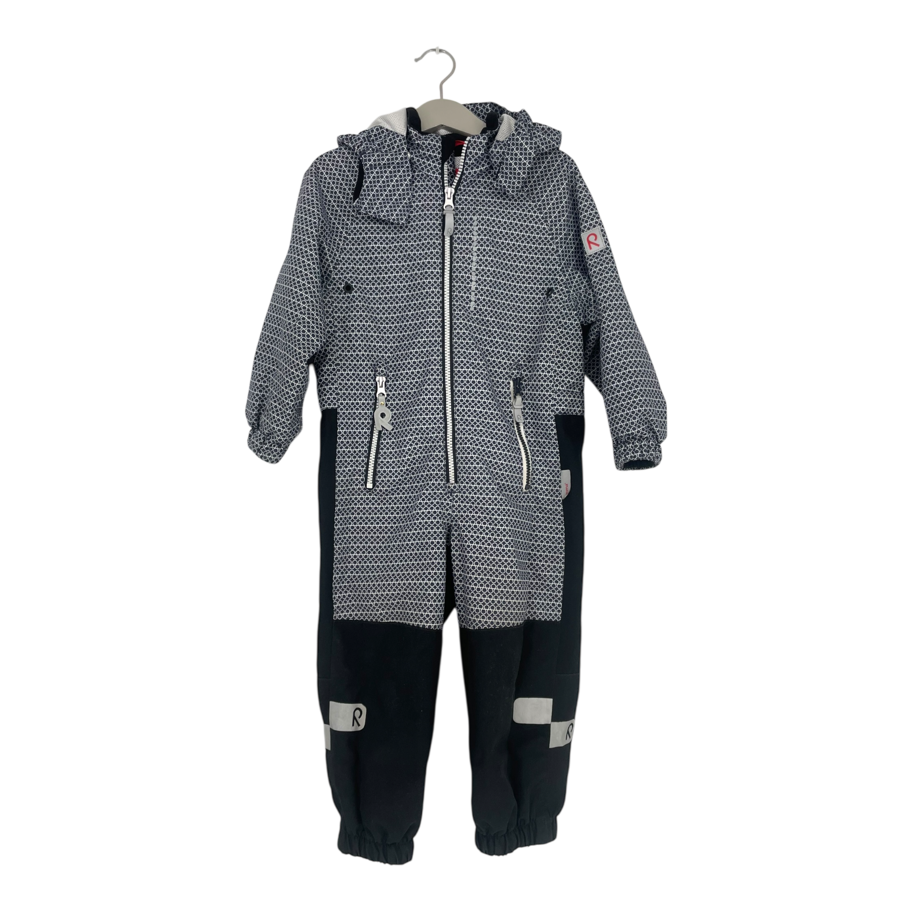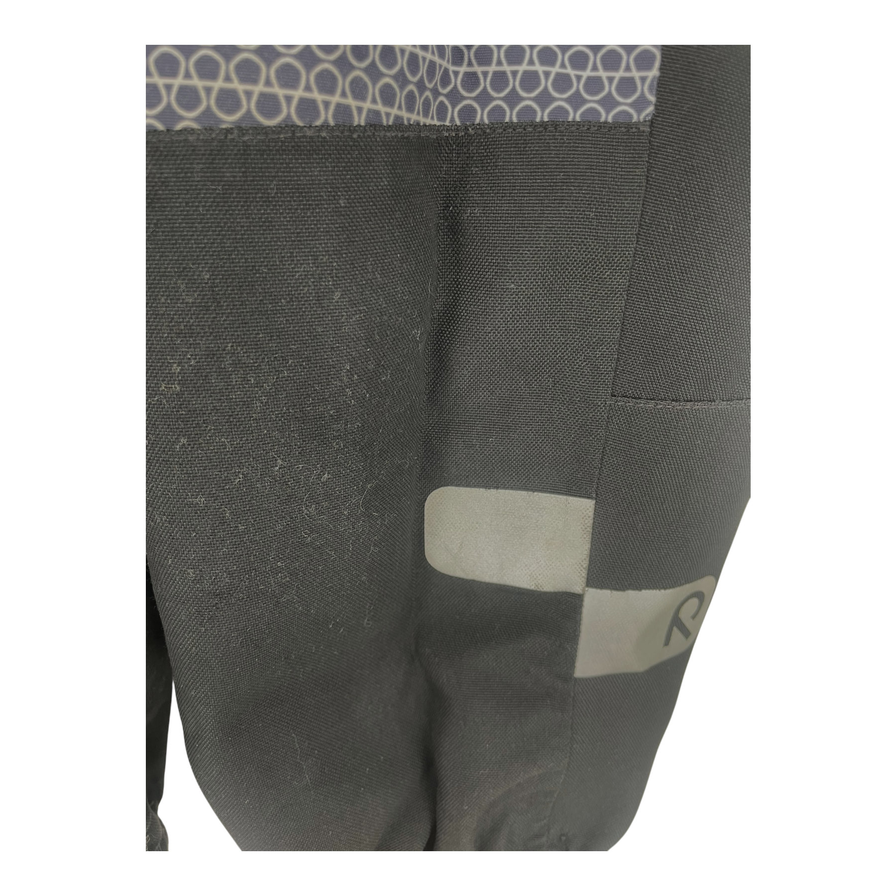 Reima Kiddo midseason overall with detachable hood, zip pockets on sides, reflective details, adjustable elastic on the waist, and durable foot loops. In this item the foot loops are missing. The material is originally waterproof up to 8,000 mm water column, and all seams are sealed.