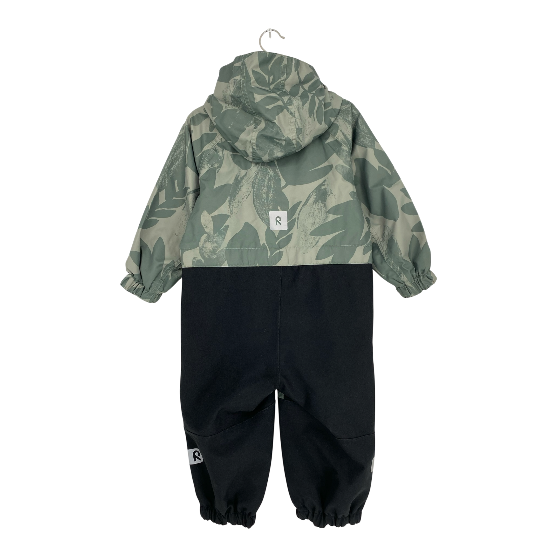 Reima Karviala mid-season overall with detachable hood, reflective details and adjustable waist. Two front pockets, elastic on the cuffs, and legs. Detachable and adjustable foot loops. Originally waterproof and seams are taped.