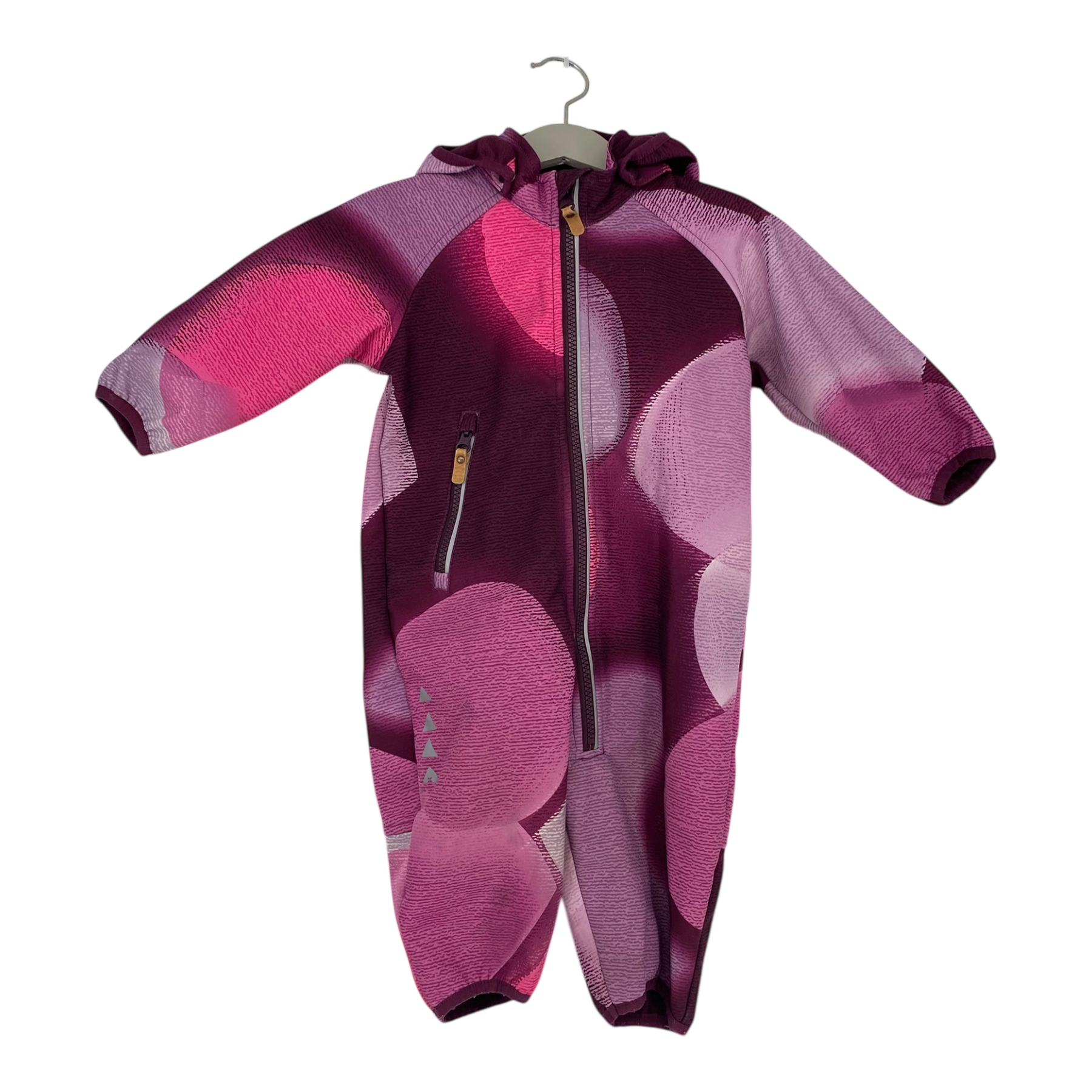 Reima Kotilo softshell midseason overall with durable reinforcements and fleece on reverse. Originally the surface has been treated with water-repellent finish. Elastic cuffs at wrists and leg ends together with the detachable hood, a zipper pocket and zipper fastening in the front.