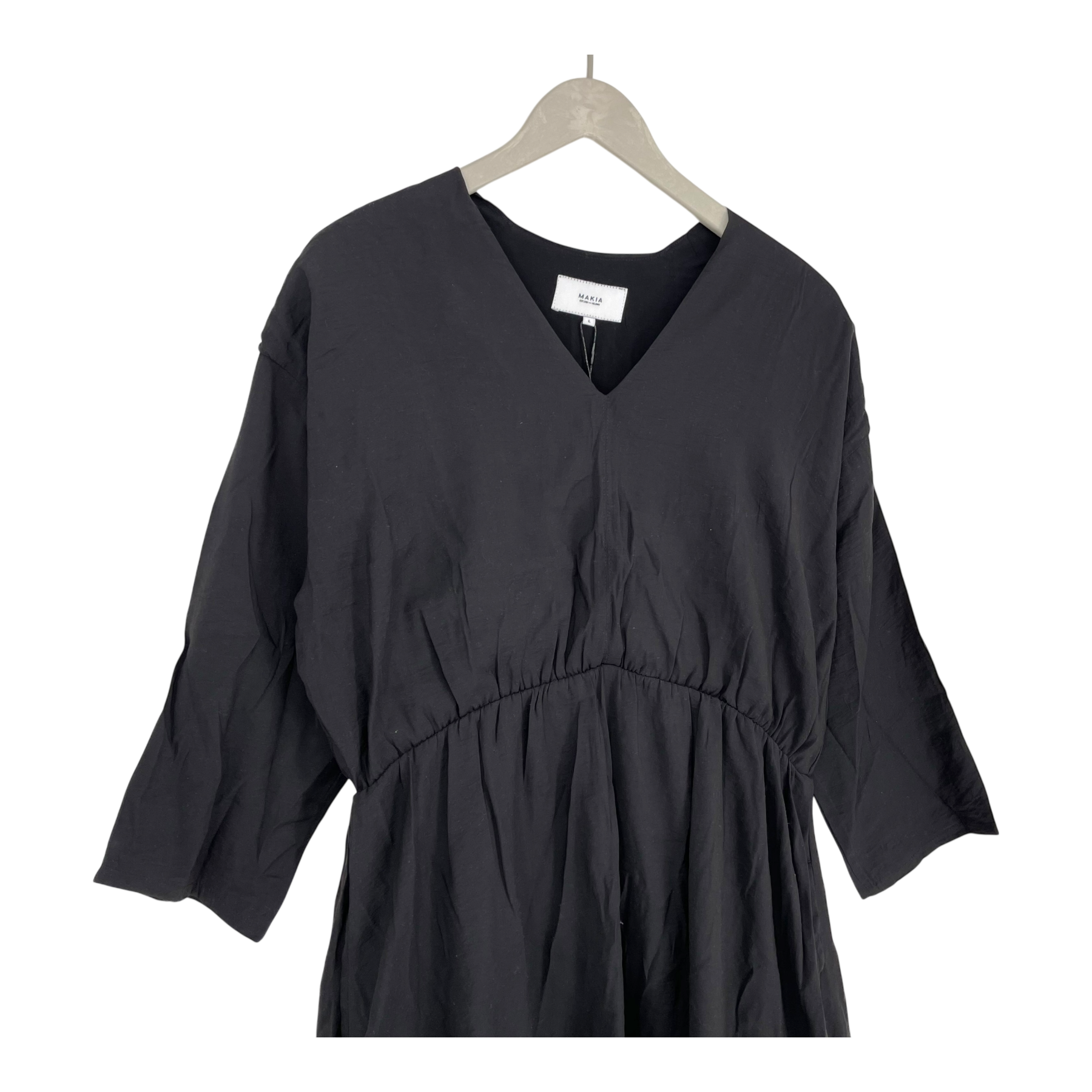 Makia Nea dress is woven flowy 4/5 sleeve dress with an elasticated waist and a v-neck. Lined.