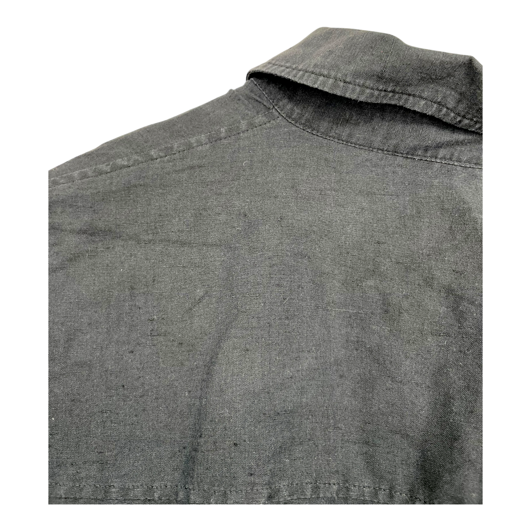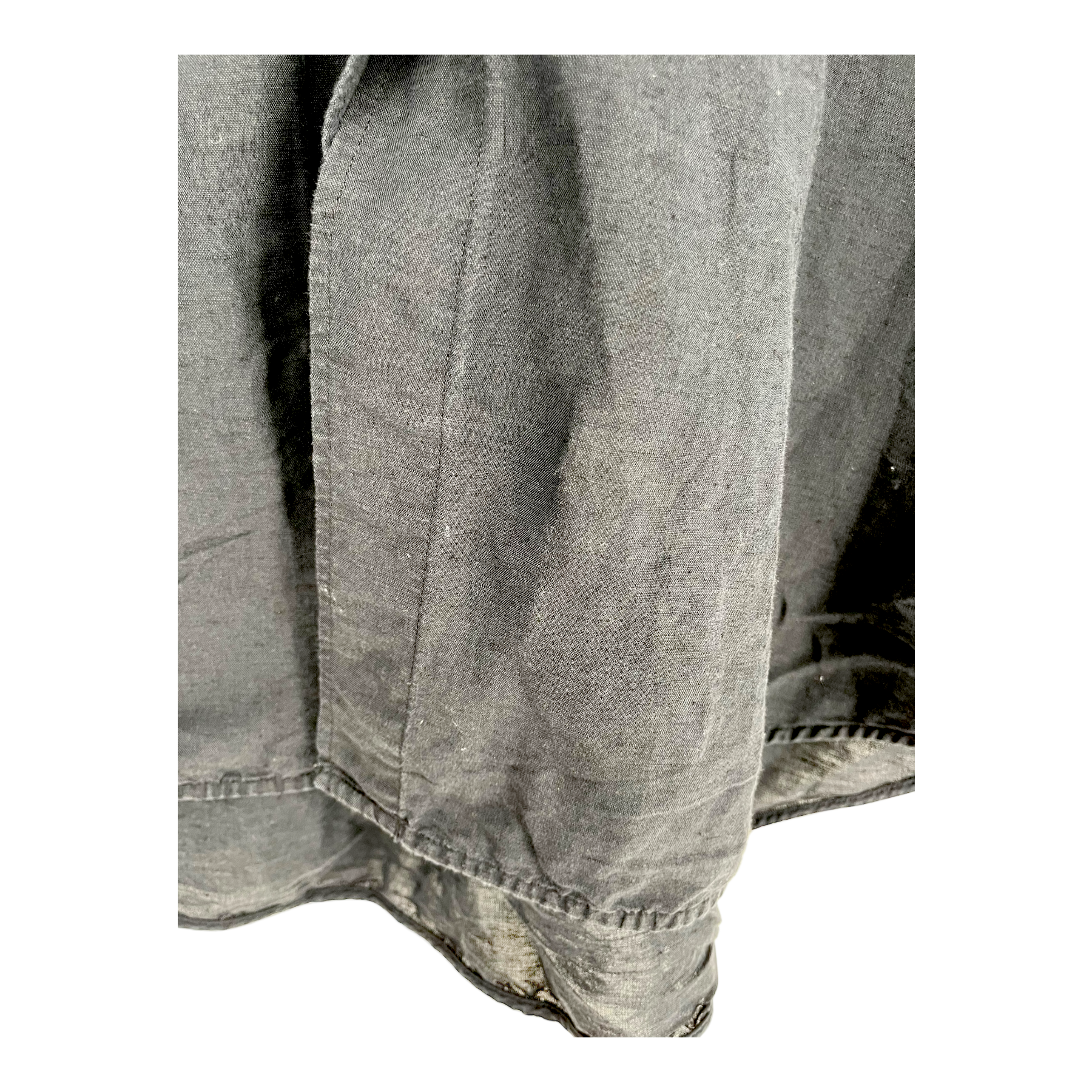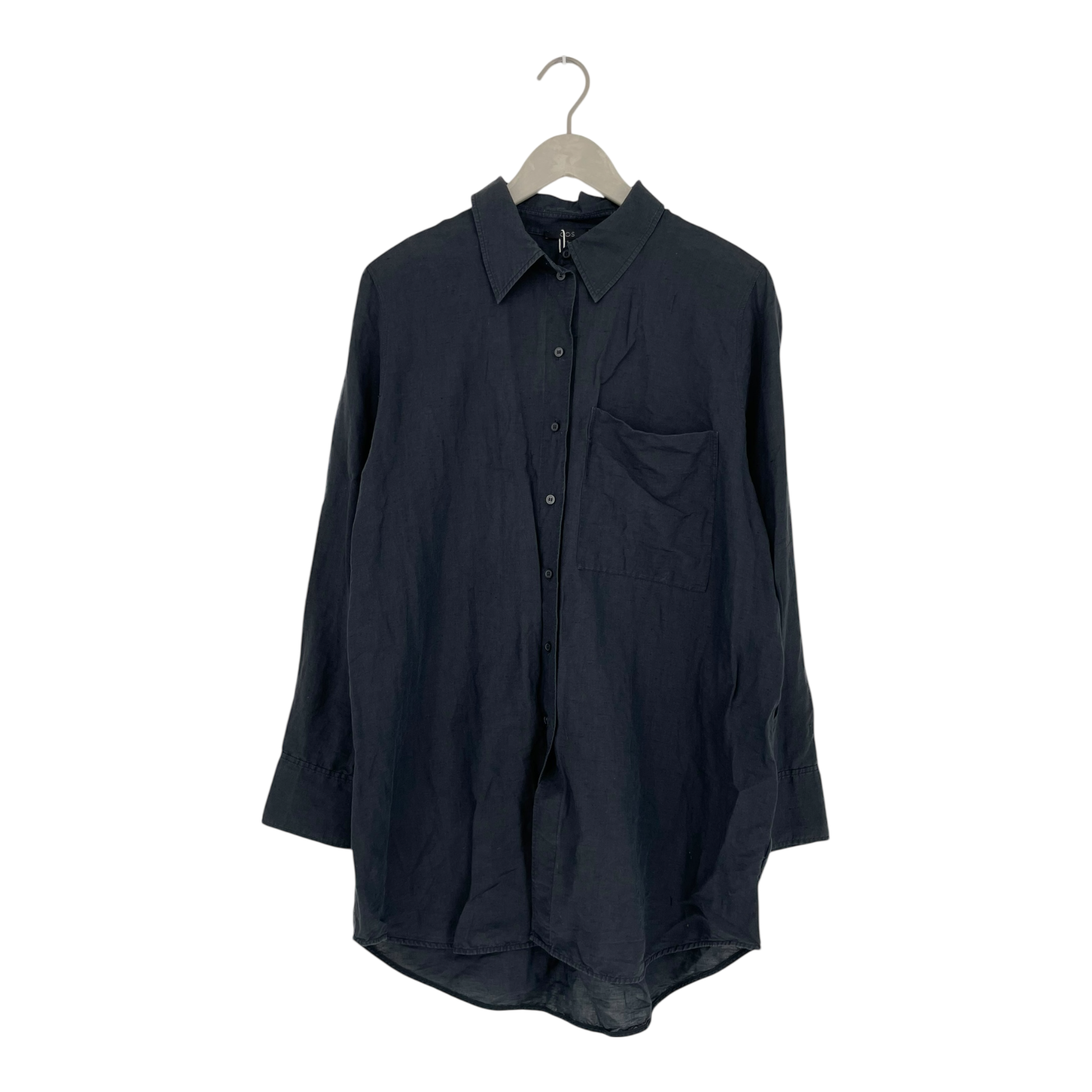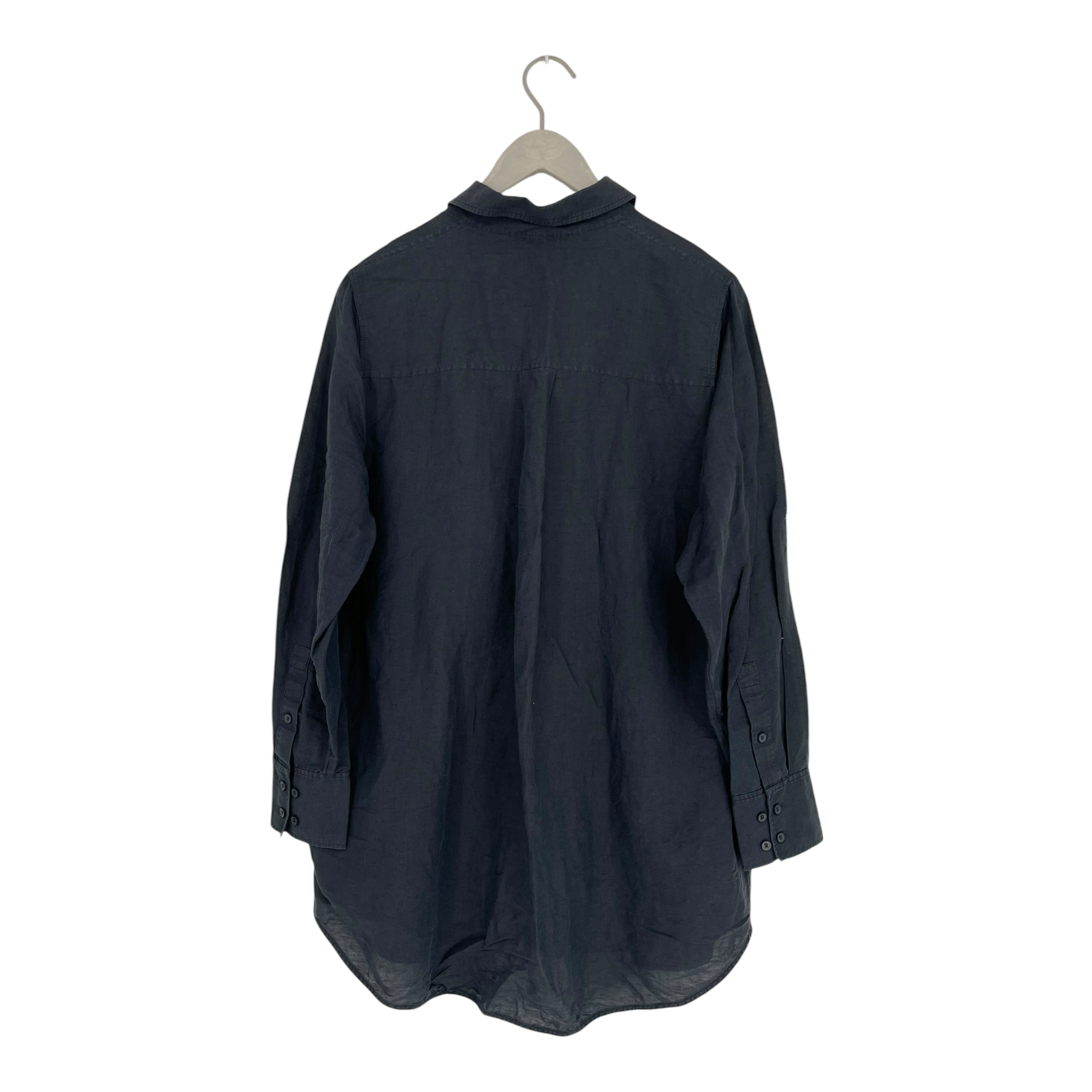 COS linen mix button up shirt. Spare button included in the laundry tag. The item shows some signs of wear in the fabric, as well as some runs of thread. It also has very light stains, that are most likely removable in the wash.