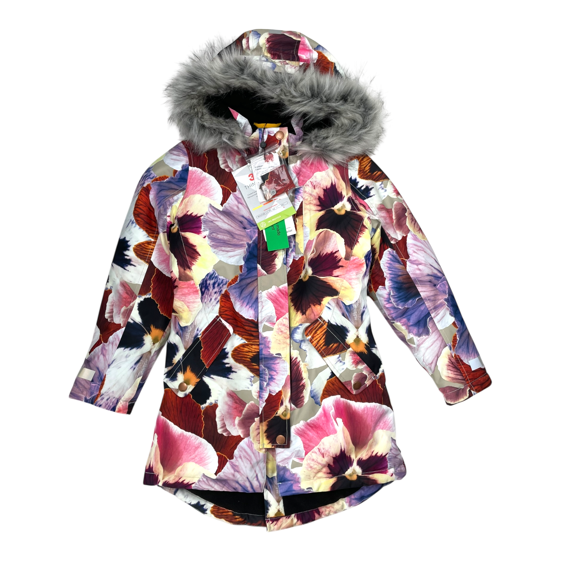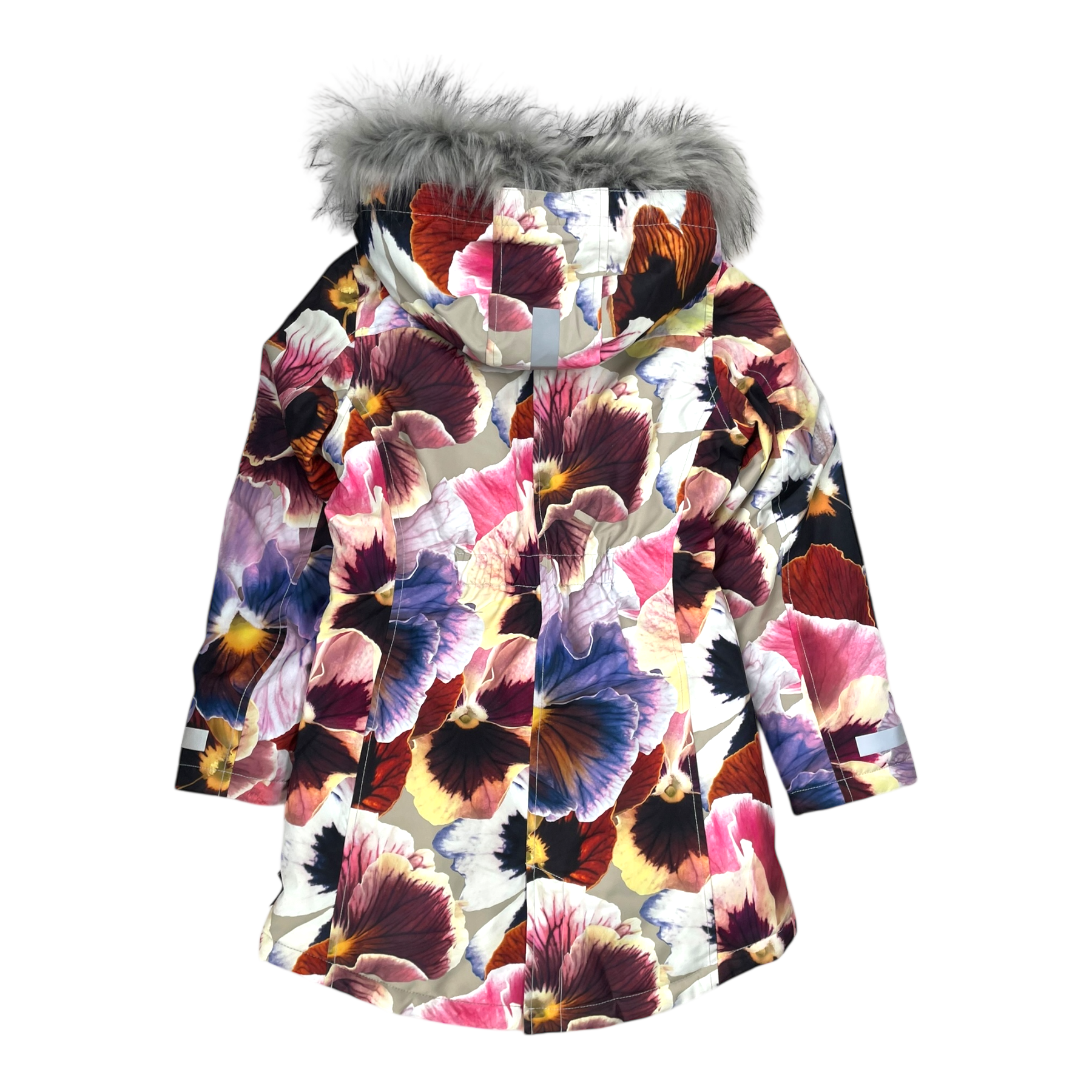 Molo Peace waterproof winter parka jacket with a detachable hood with a detachable faux fur edge, reflector, a hidden zipper with a placket, sleeve openings with a wind flap, two front pockets and an elastic at the back for a fitted shape.