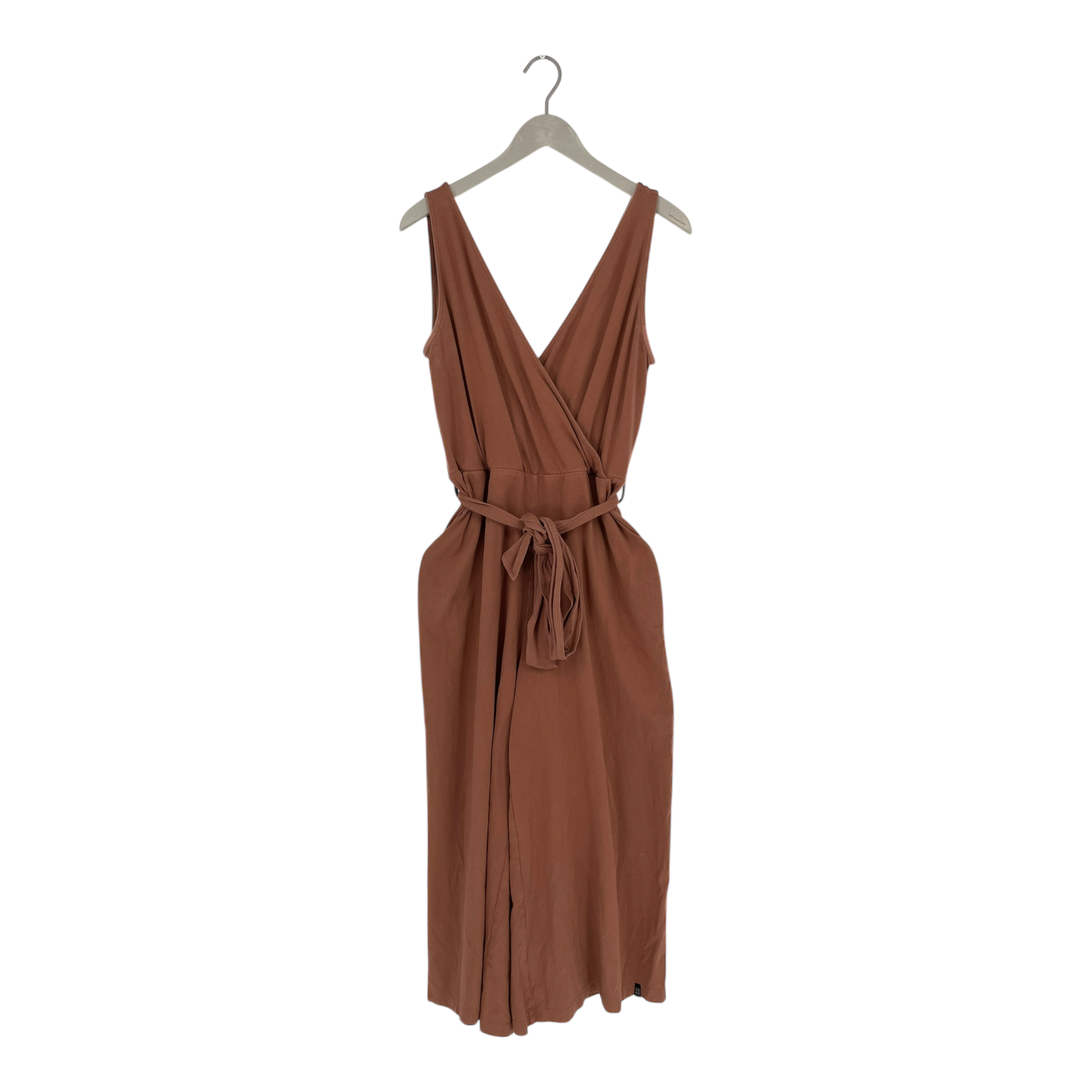 Kaiko women's sleeveless wrap style jumpsuit with a detachable fabric belt. The item shows signs of wear on the seams and the fabric is washed out.