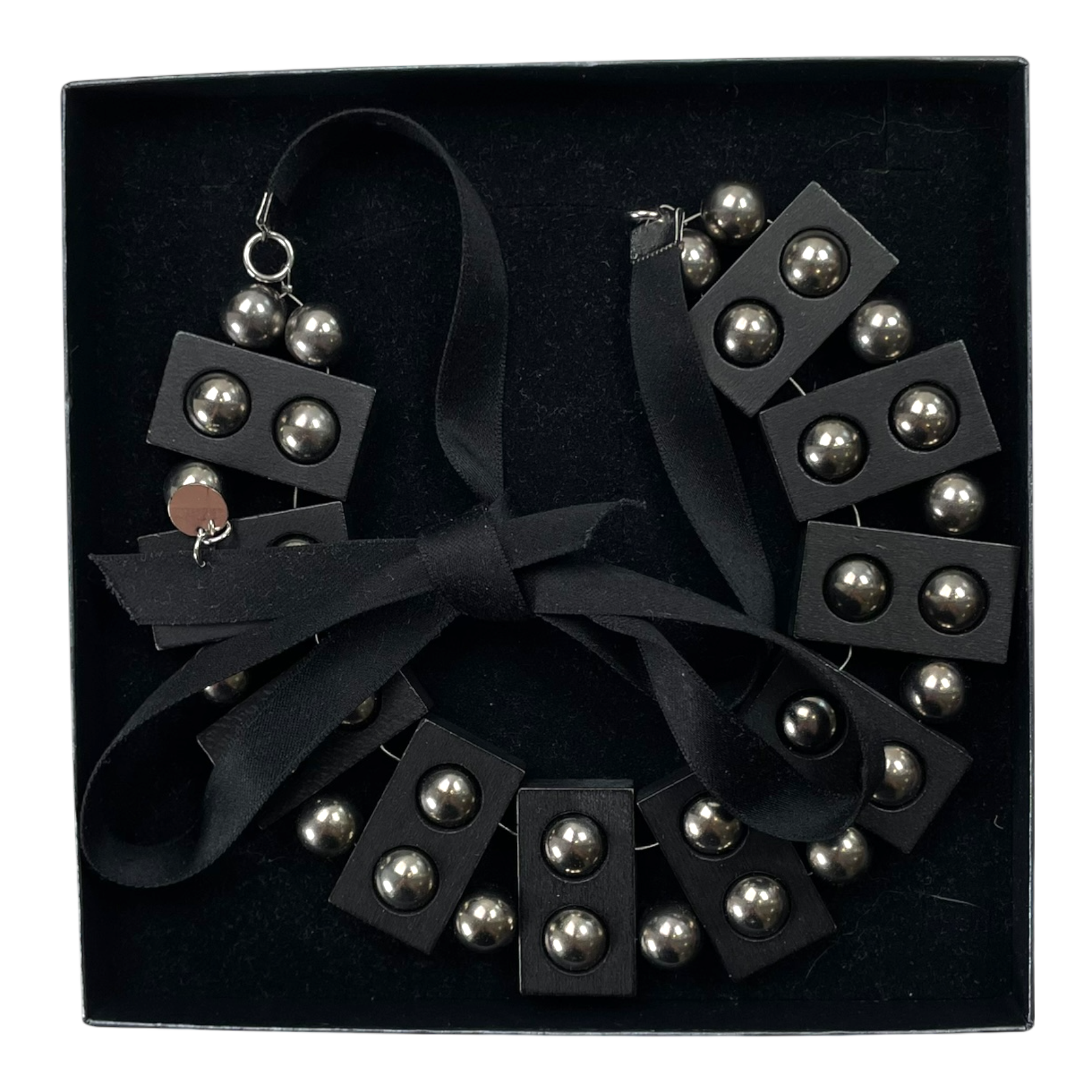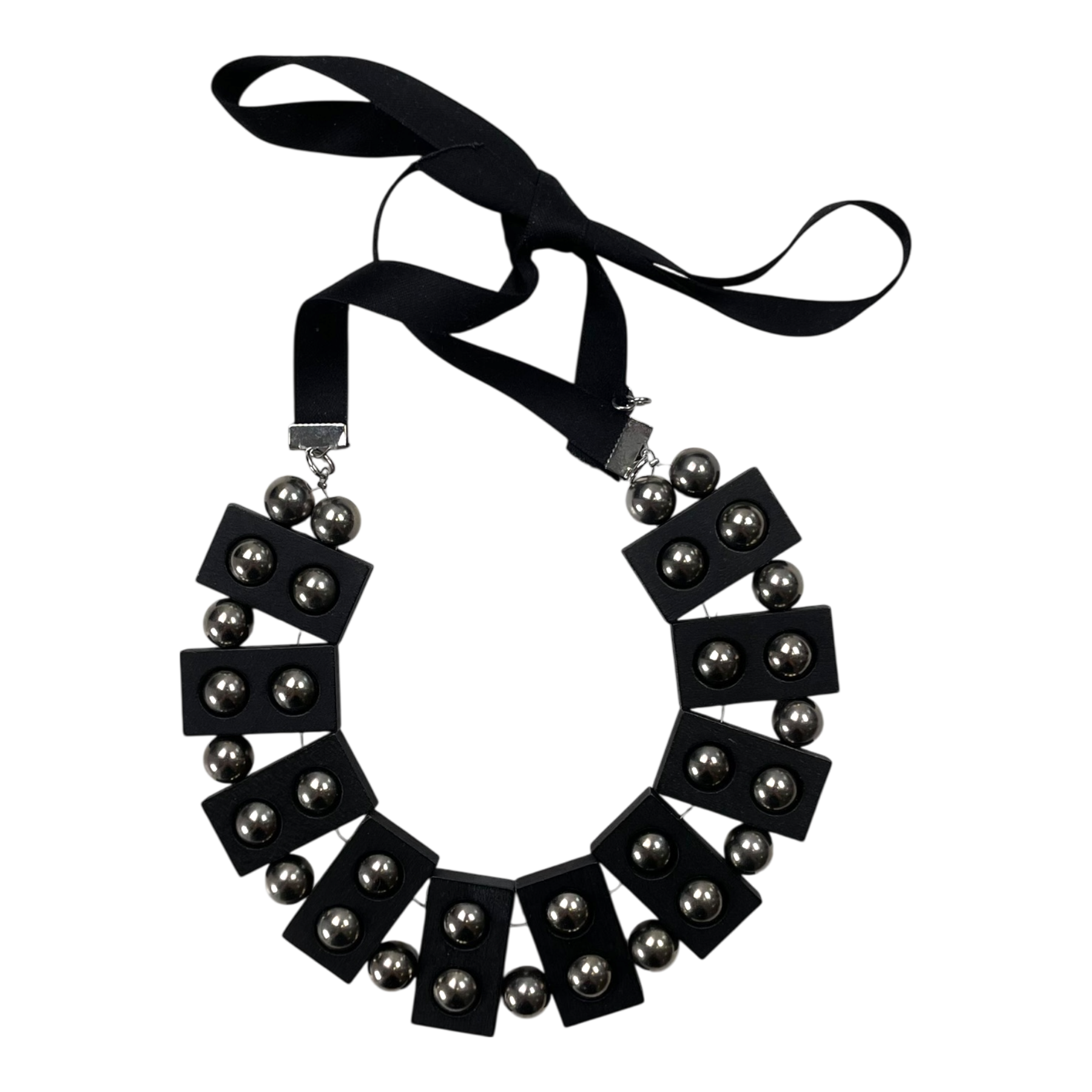 Aarikka Fenix necklace with ribbon closure and interwoven metal balls and wood blocks. Comes in an Aarikka dust bag.