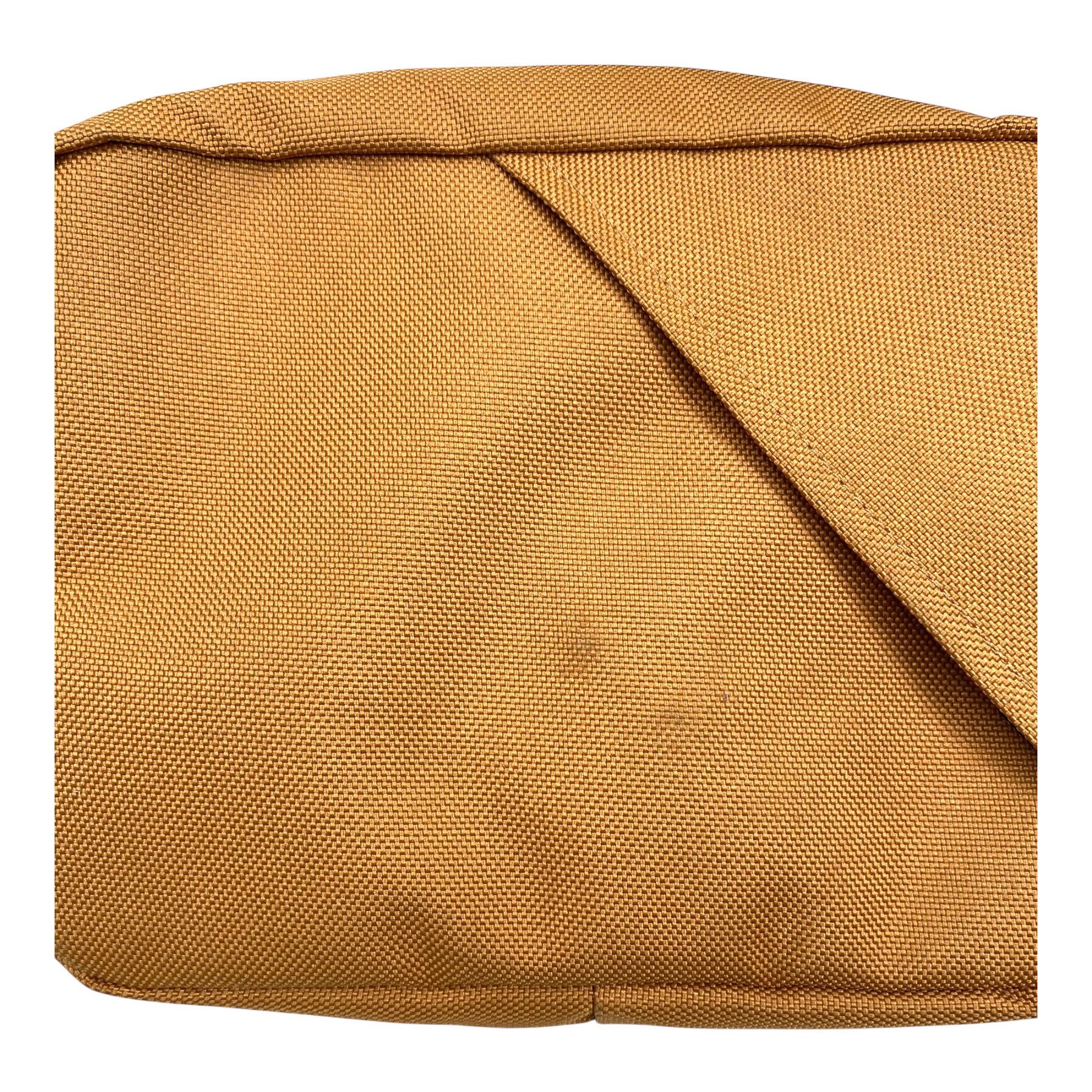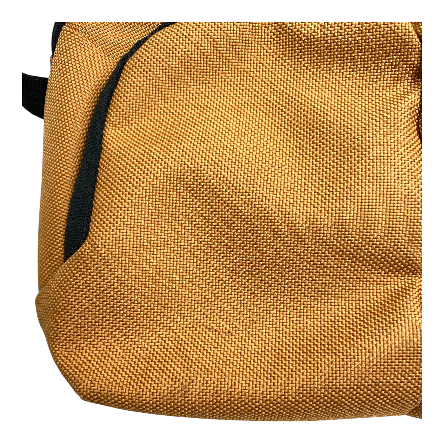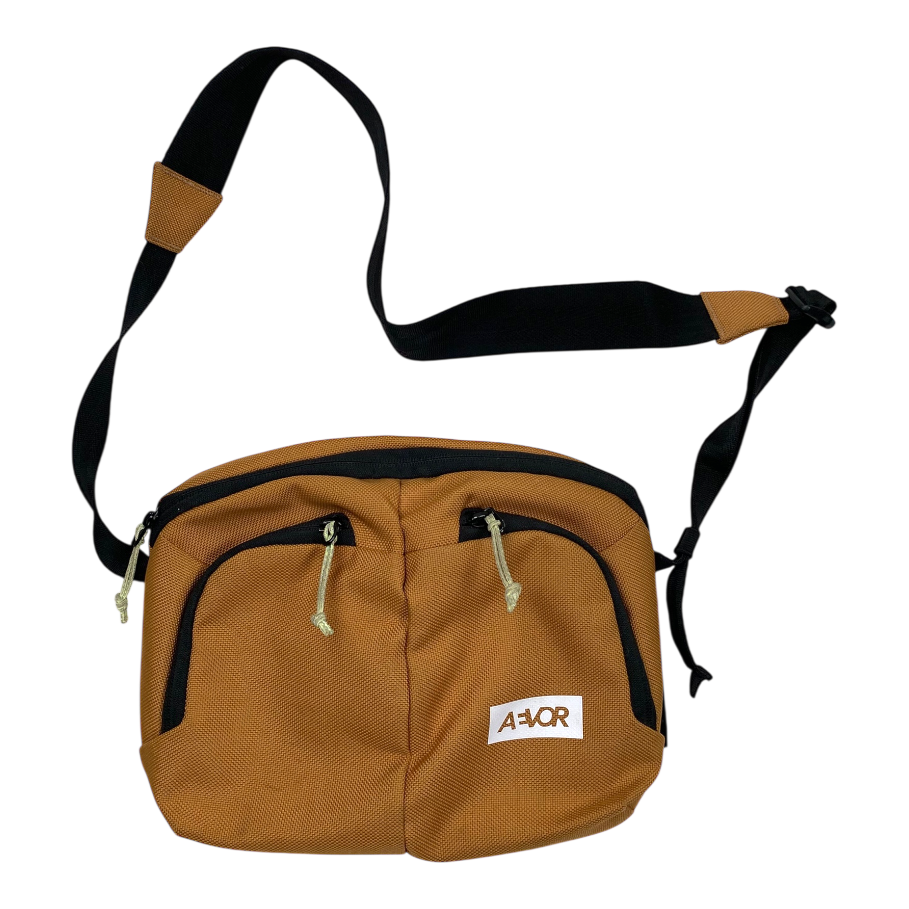 Aevor hip bag in caramel brown. Two zipper pockets in front. Multiple pockets inside. Strap is adjustable.