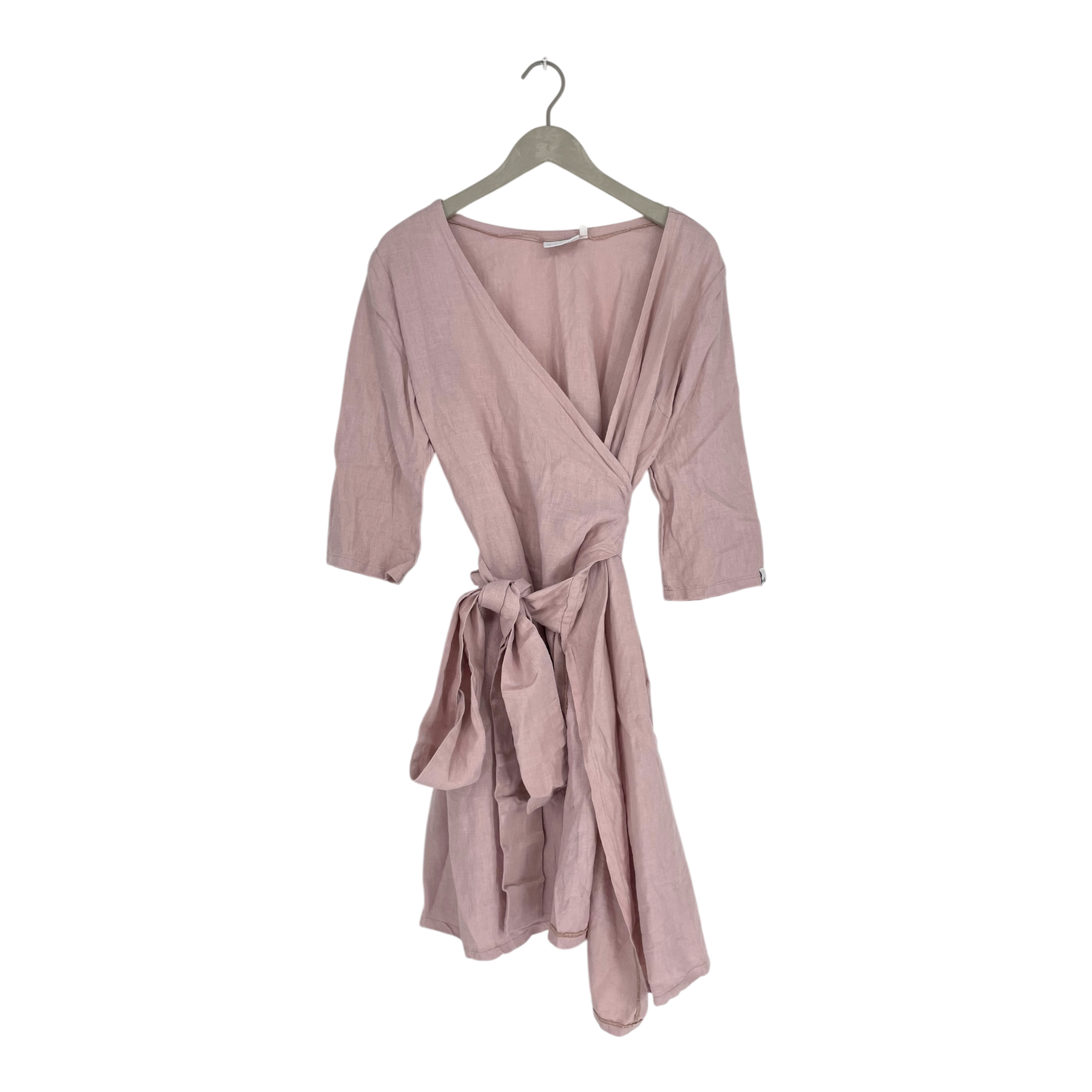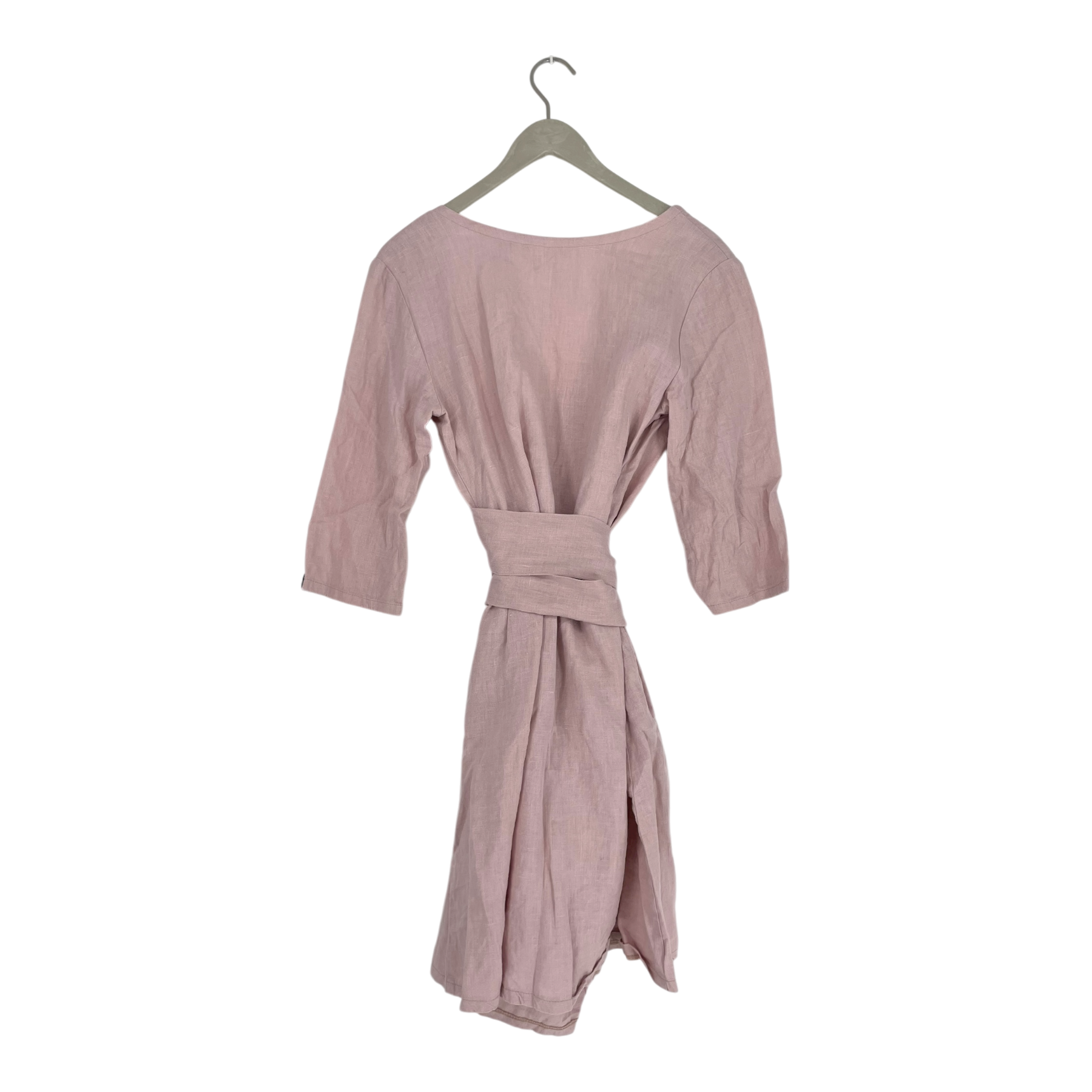 Nakoa linen wrap dress with 3/4 sleeves and pockets on the sides. The item shows signs of wear, especially in the armpits. The item also has a clasp with no hoop for closure.