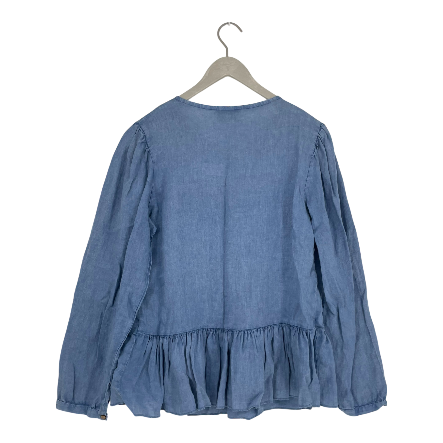 Bypias linen blouse with ruffle hemline and button closure in the front. Some fading on the fabric in the front, but not sure if on purpose.