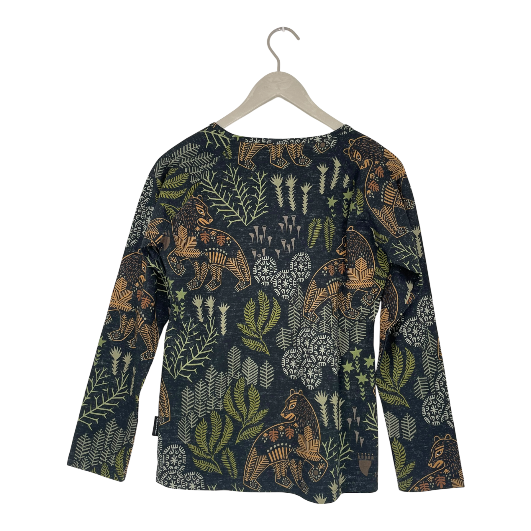 Versonpuoti long sleeve shirt in a forest print, oval neckline.