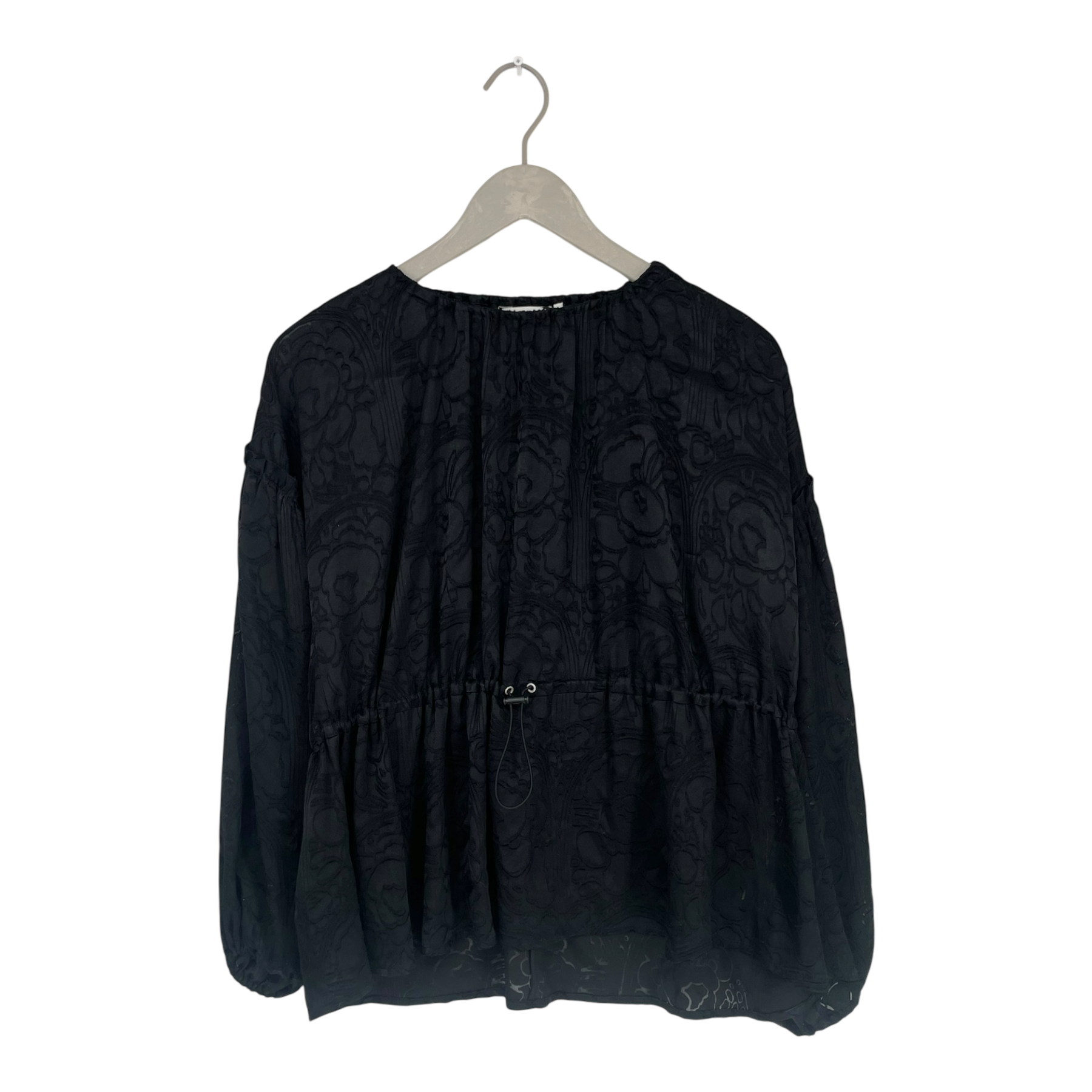 Marimekko Eleellinen lightweight and see-through shirt with string tightening on the waist, poofed sleeves with frill detail and round neckline with elastic. The unique Eleellinen shirt combines sport wear ease and evening wear glamour, elevated by the delicate embroidery of the playful Karuselli design on the fabric.