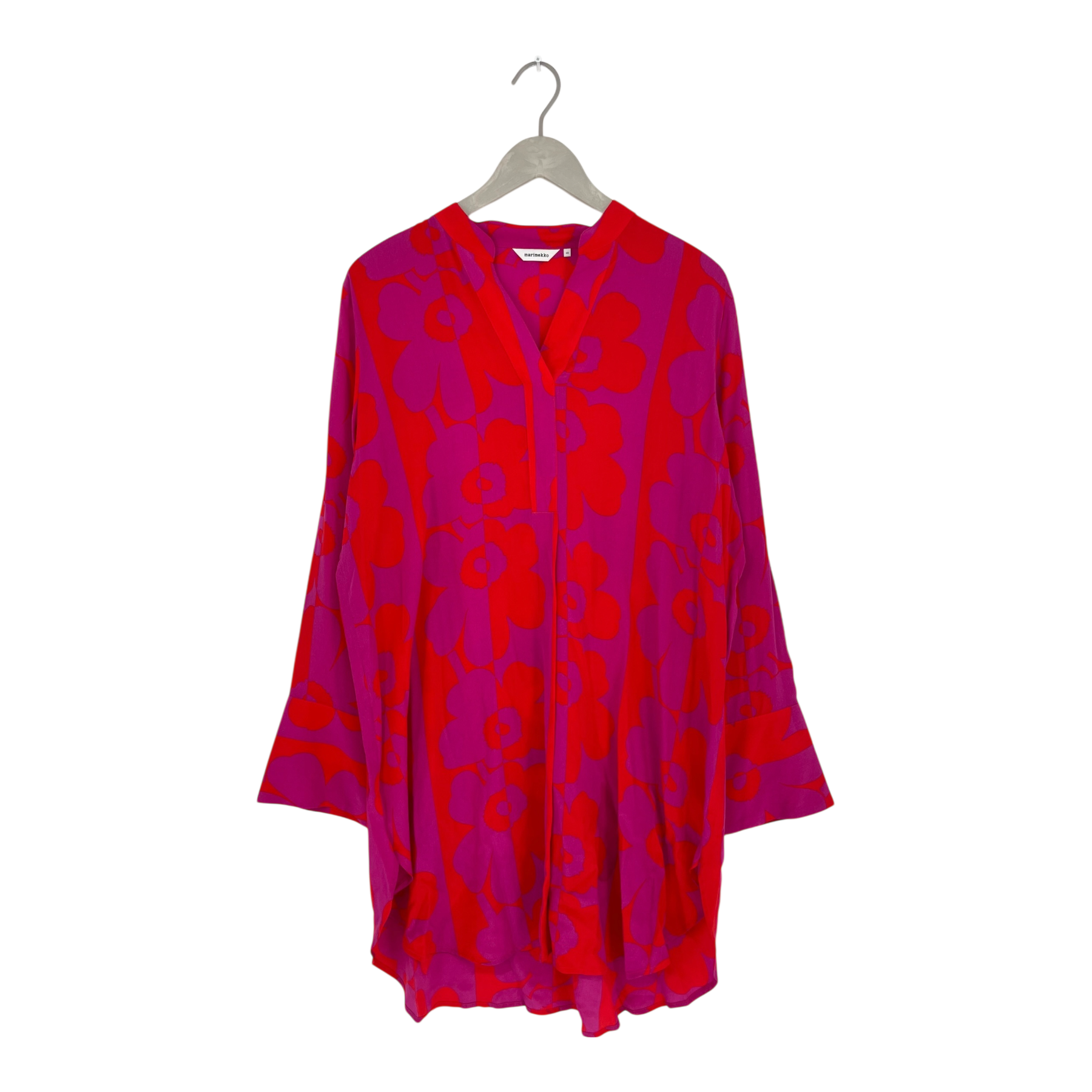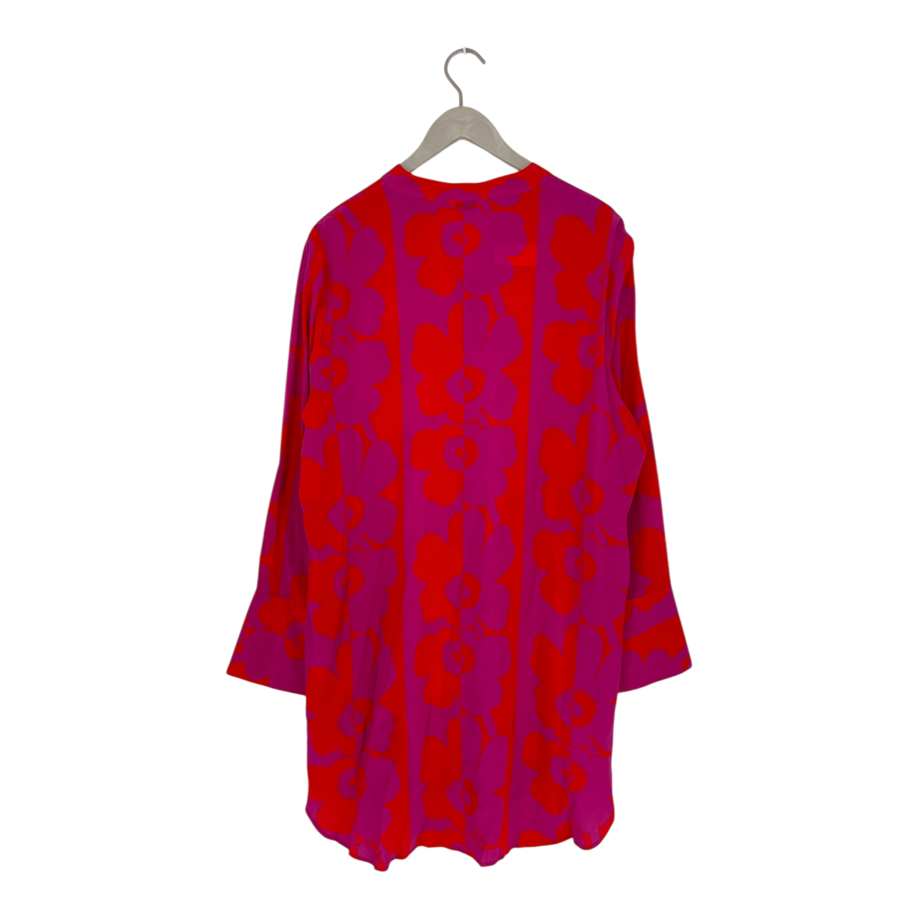 Marimekko Ollako Suur Unikko dress with a short standing collar, a short front list without buttons, and wide cuffs at the sleeve ends. The hemline has a rounded cut and side slits.