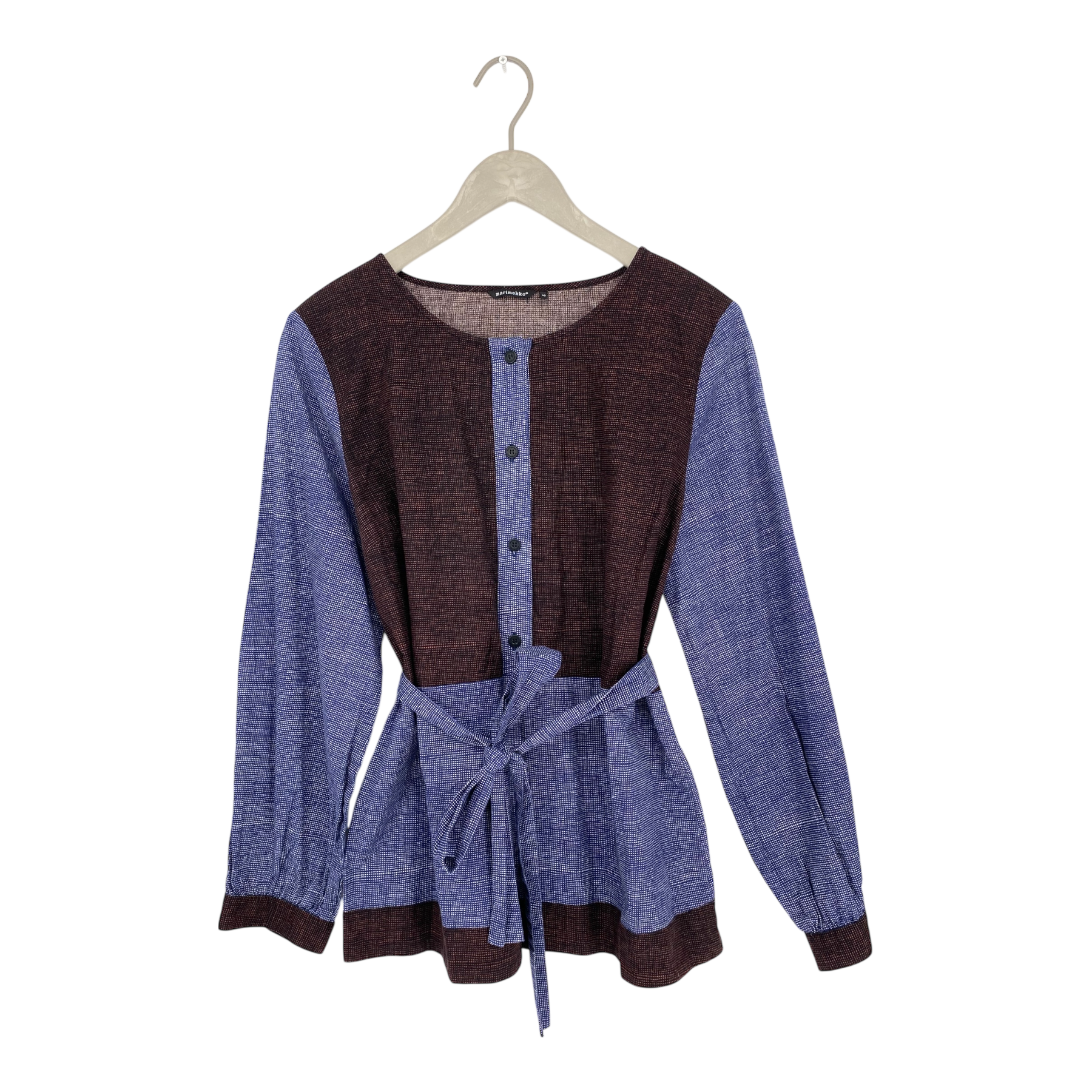 Marimekko Tuuli shirt with buttons on front and separate belt. Shirt has full length sleeves with buttoned cuffs and round neck.
