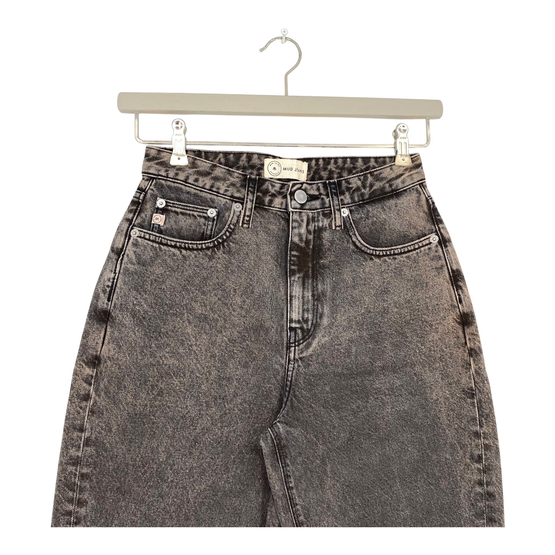 Color: washed grey denim with a brown tint