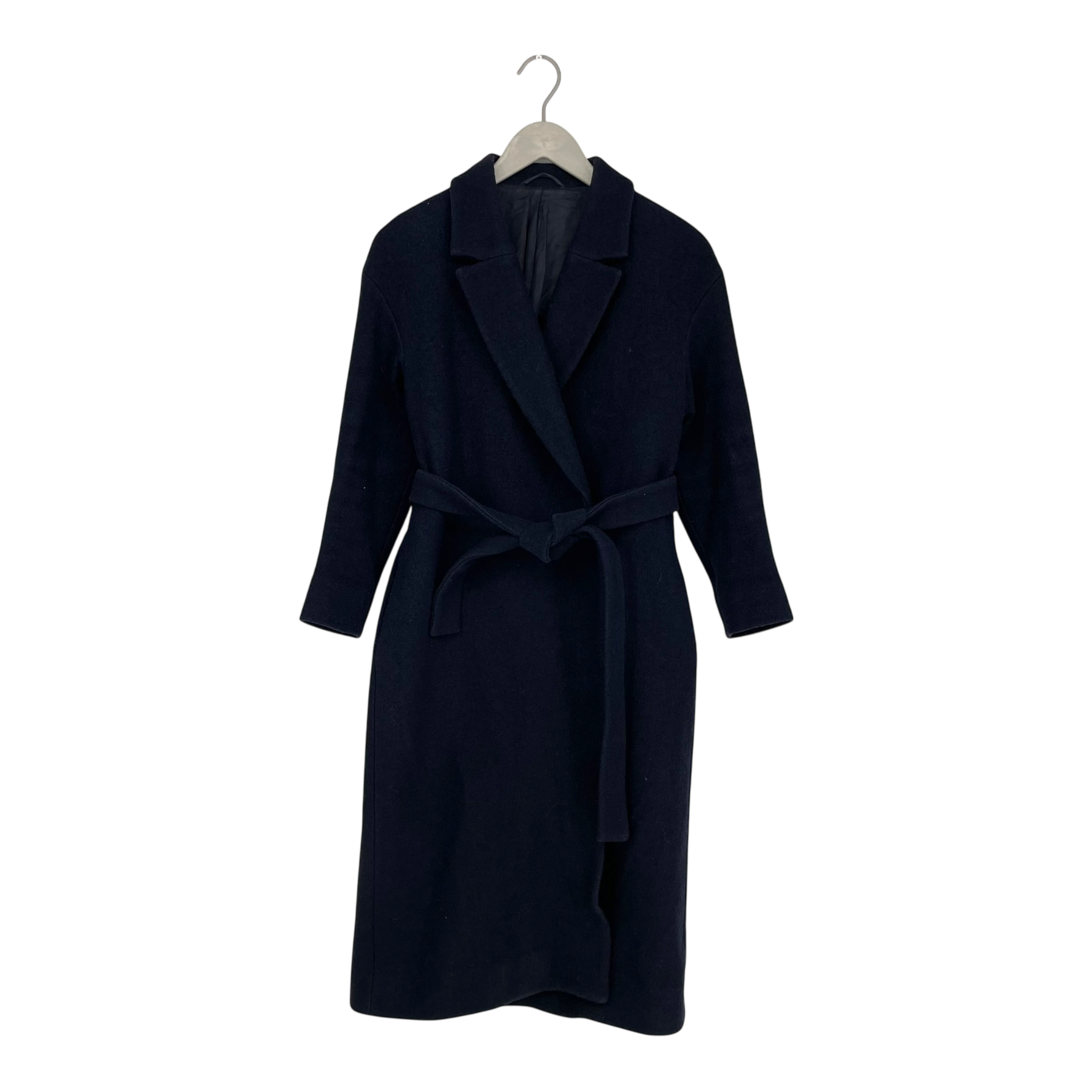 COS wool coat with pockets on the sides, button and belt closure. The size tag is missin, but looks like a XS.