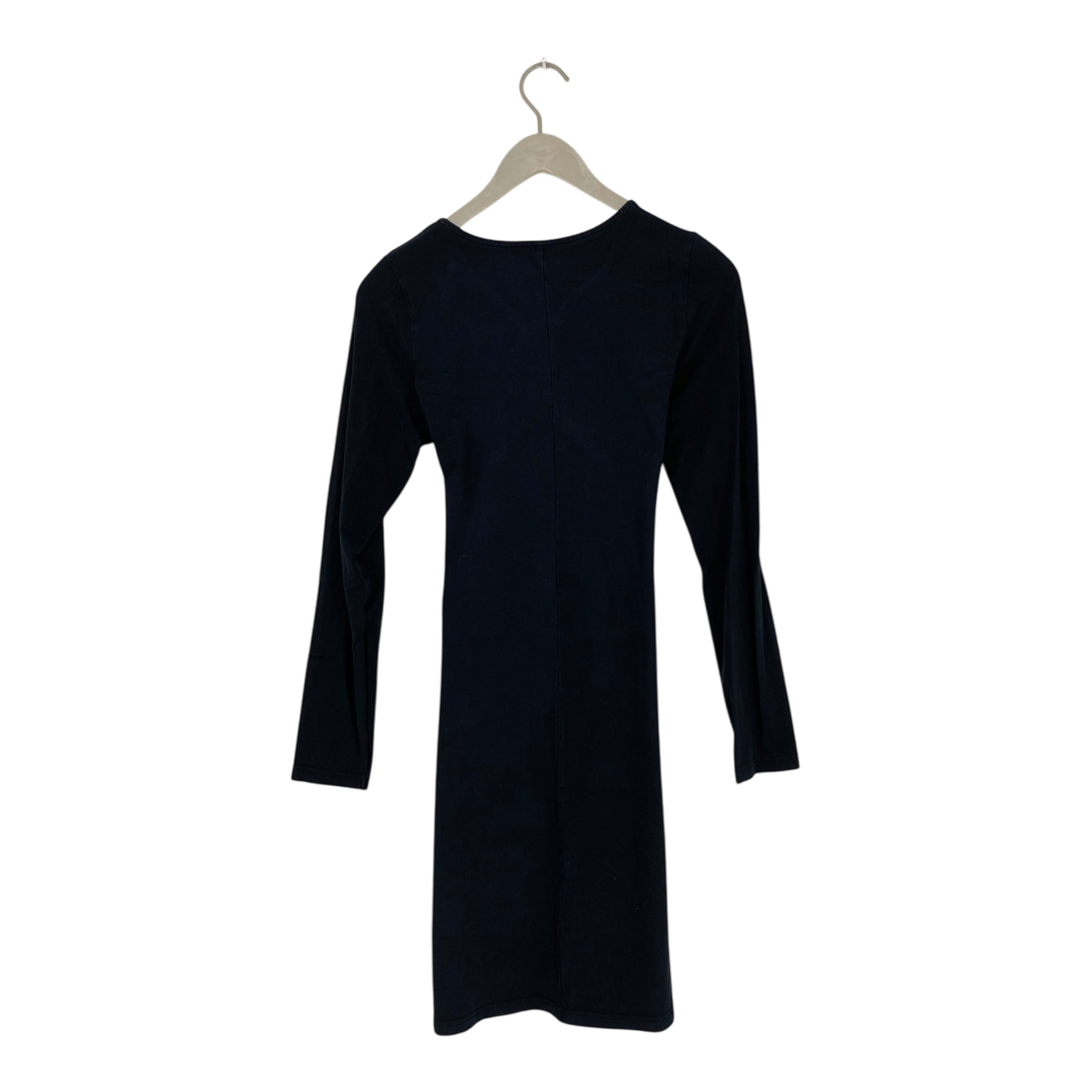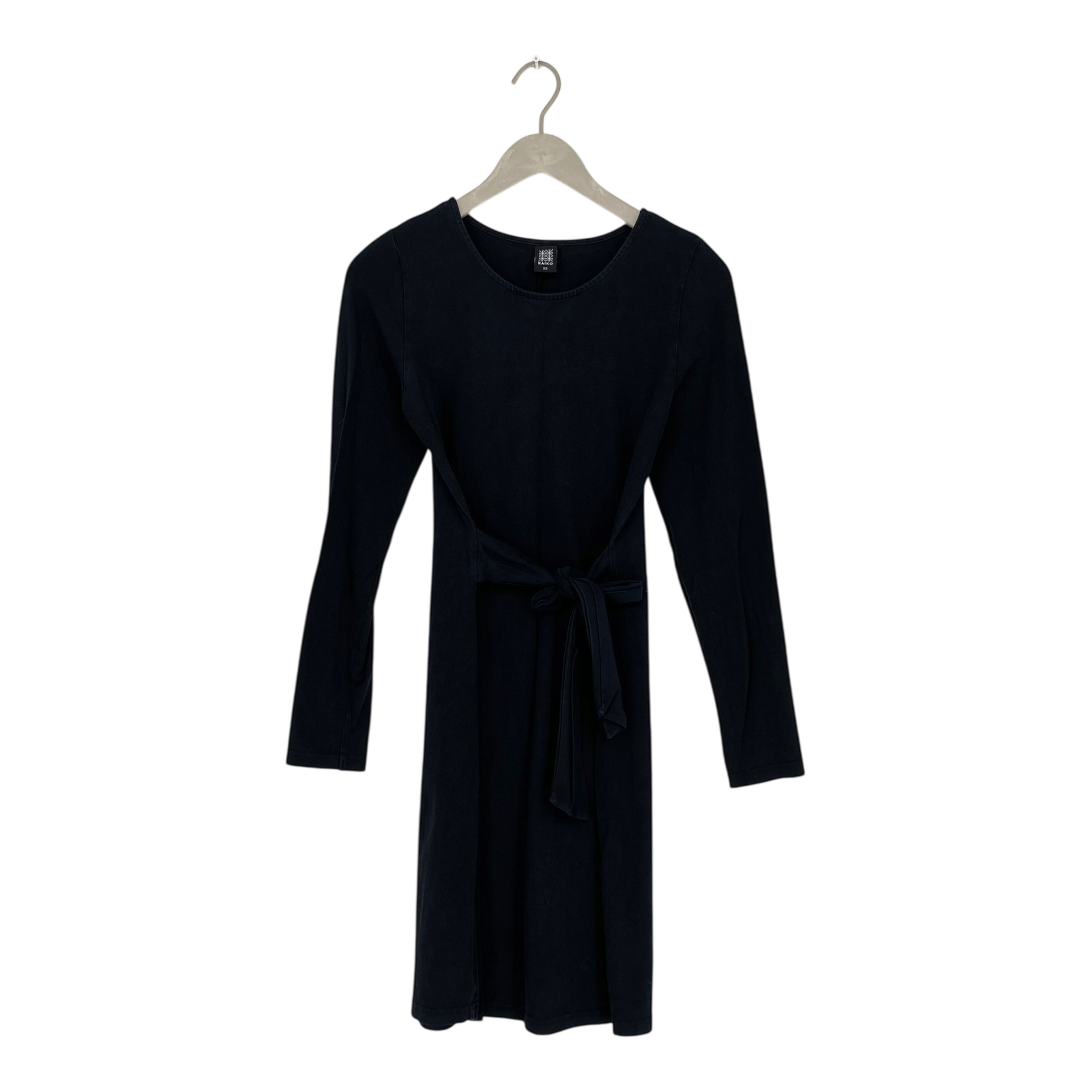 Kaiko belted dress has a slim, figure-hugging fit. Wide ribbons at the waist can be tied at the front or back. The dress has a rounded neckline, and the hem reaches down approximately to the knees.