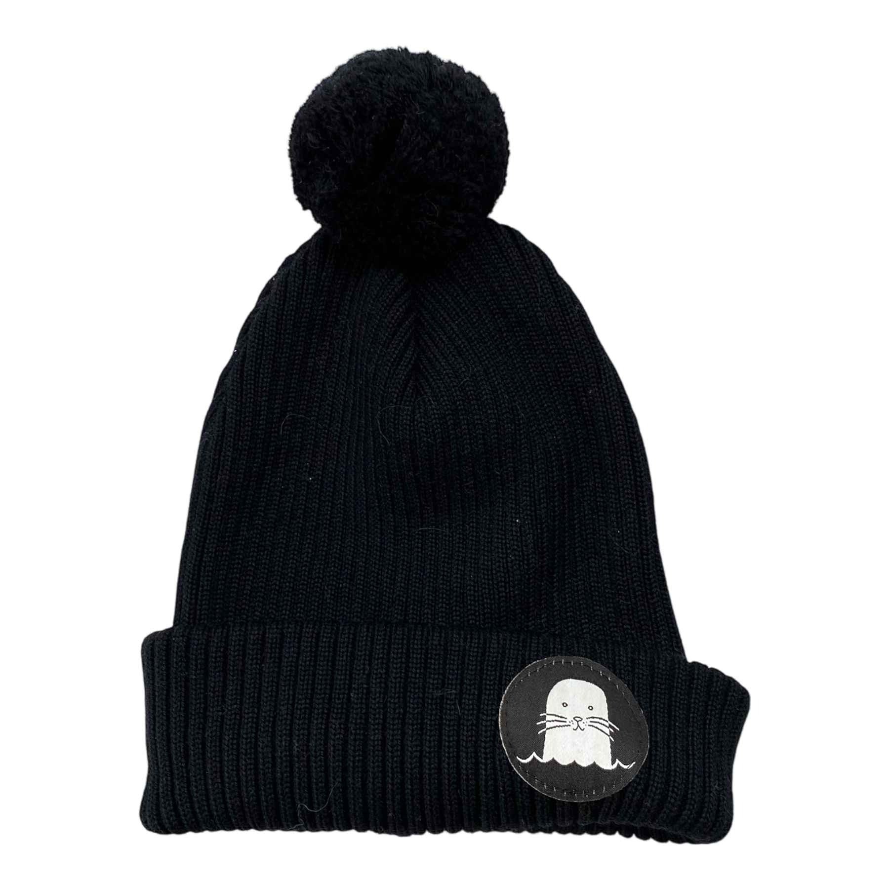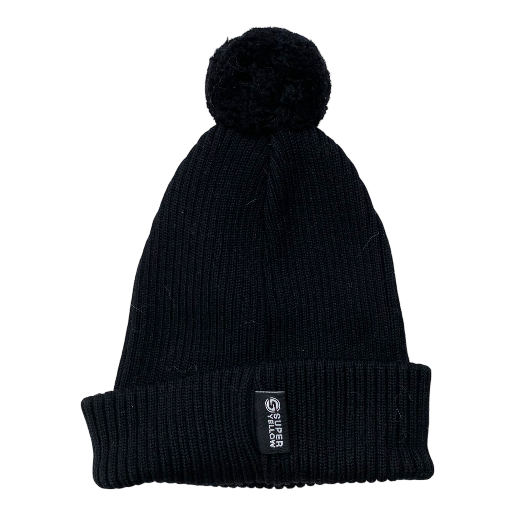 Superyellow kid's junior beanie with a pom and an embroidered patch.