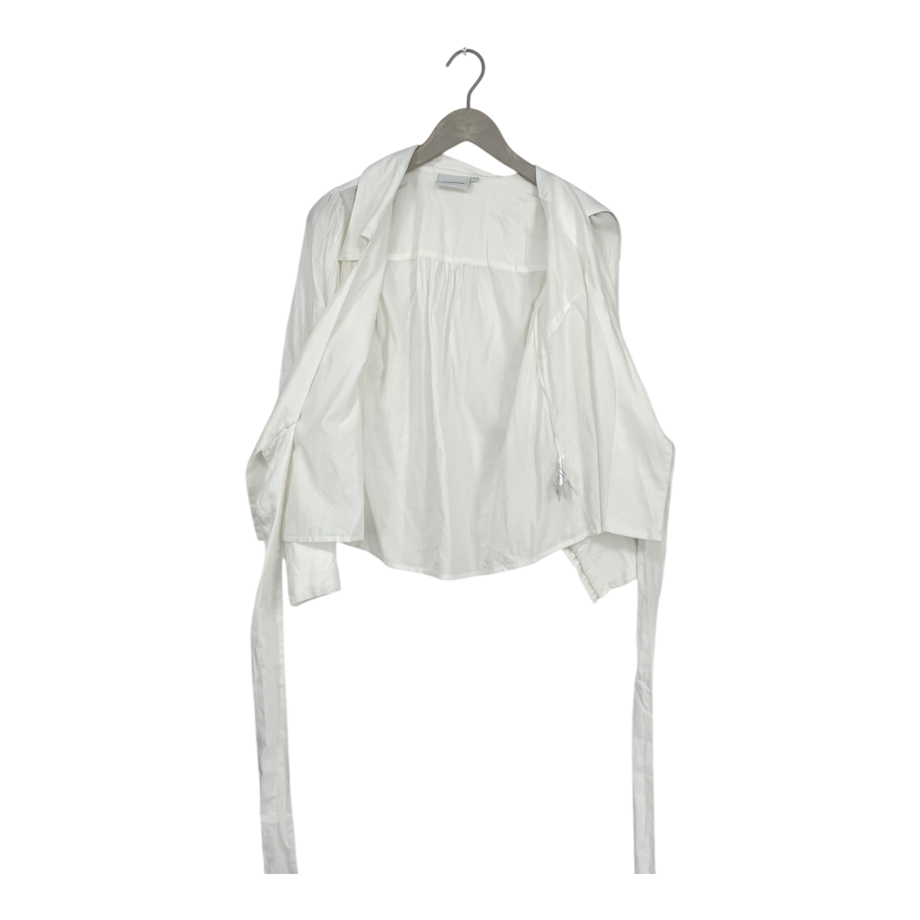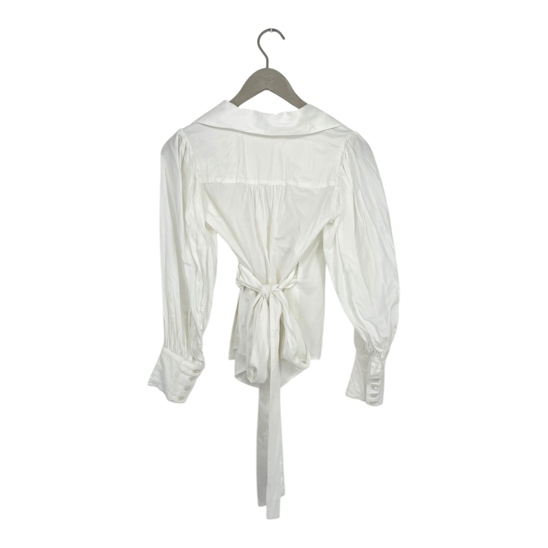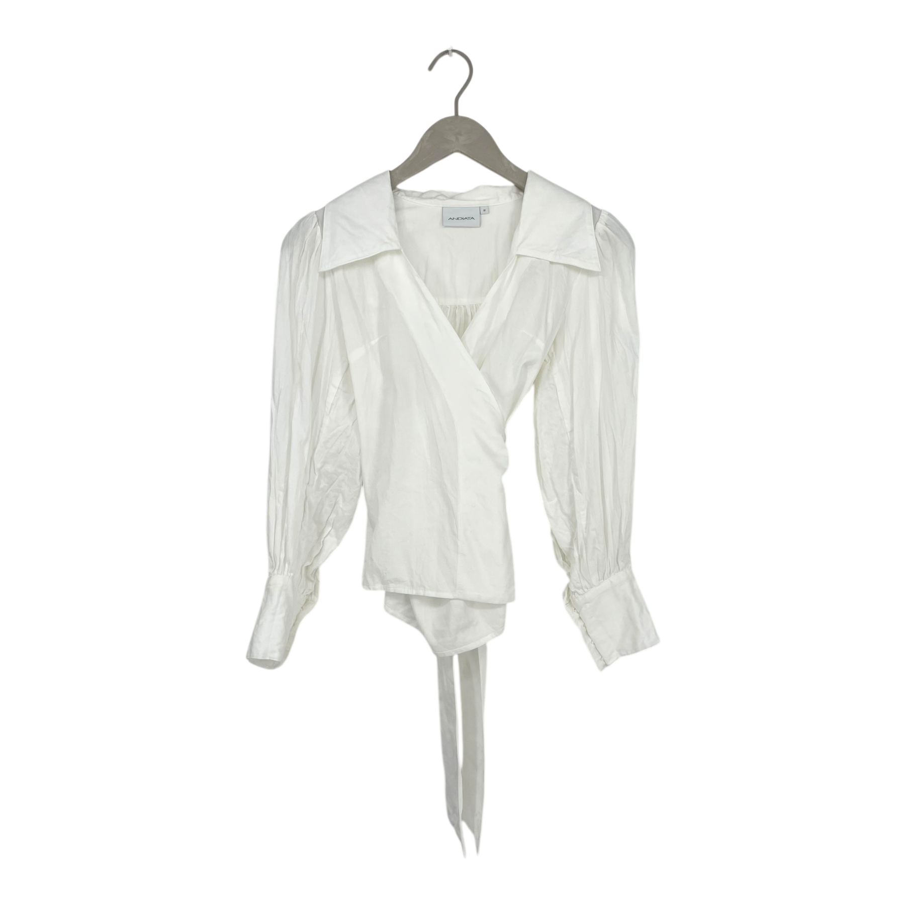 Andiata wrap shirt with puffy sleeves and button details on the cuffs.