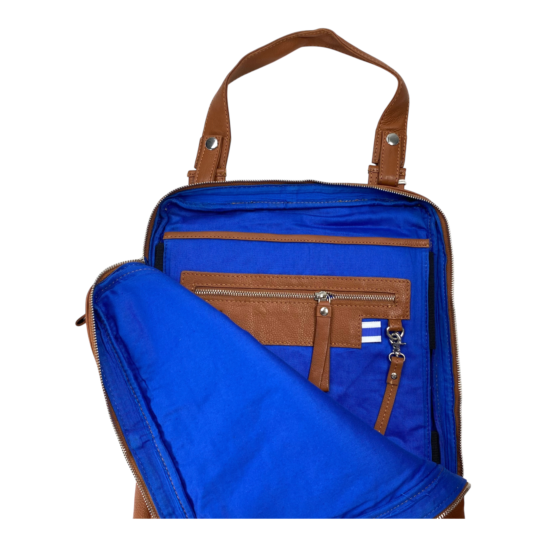Lumi compact laptop supermarket bag that has cotton twill lining, is made out of cow hide leather and has silver hardware. Multiple pockets and key fob in the main compartment, padded laptop slide compartment plus an extra zippered pocket on the back. The main compartment has a zipper closure. Fits the daily essentials, A4+ sized documents, standard 13-15″ laptops etc.