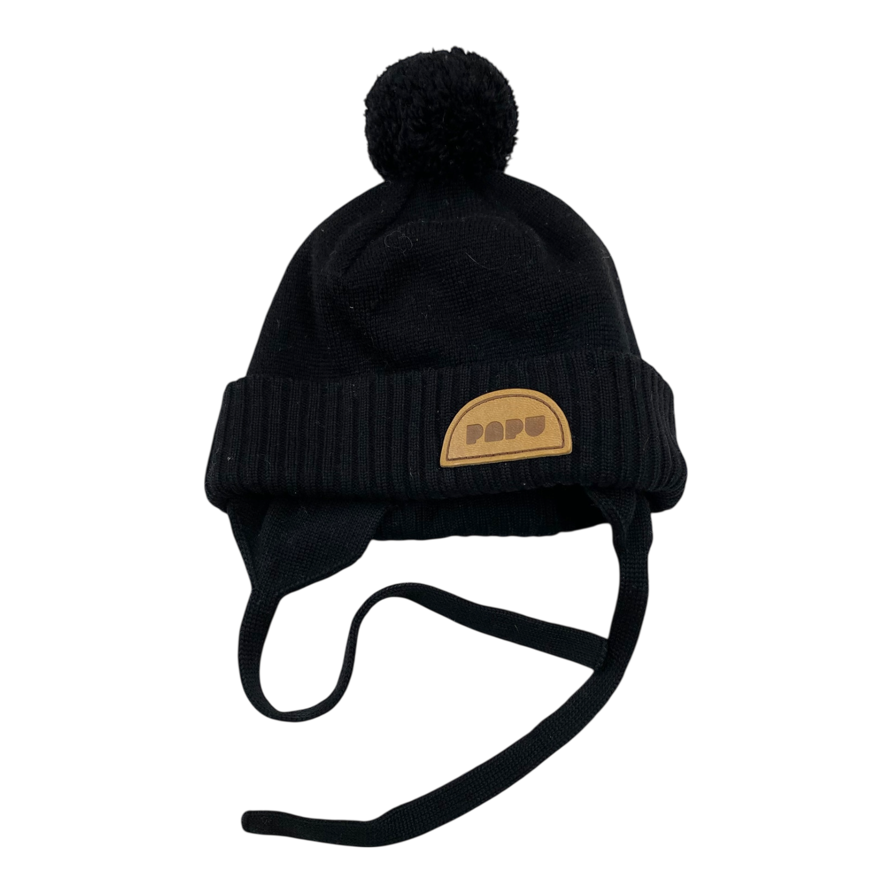 Papu knitted merino wool beanie with a pom pom on top and strings to tie with.