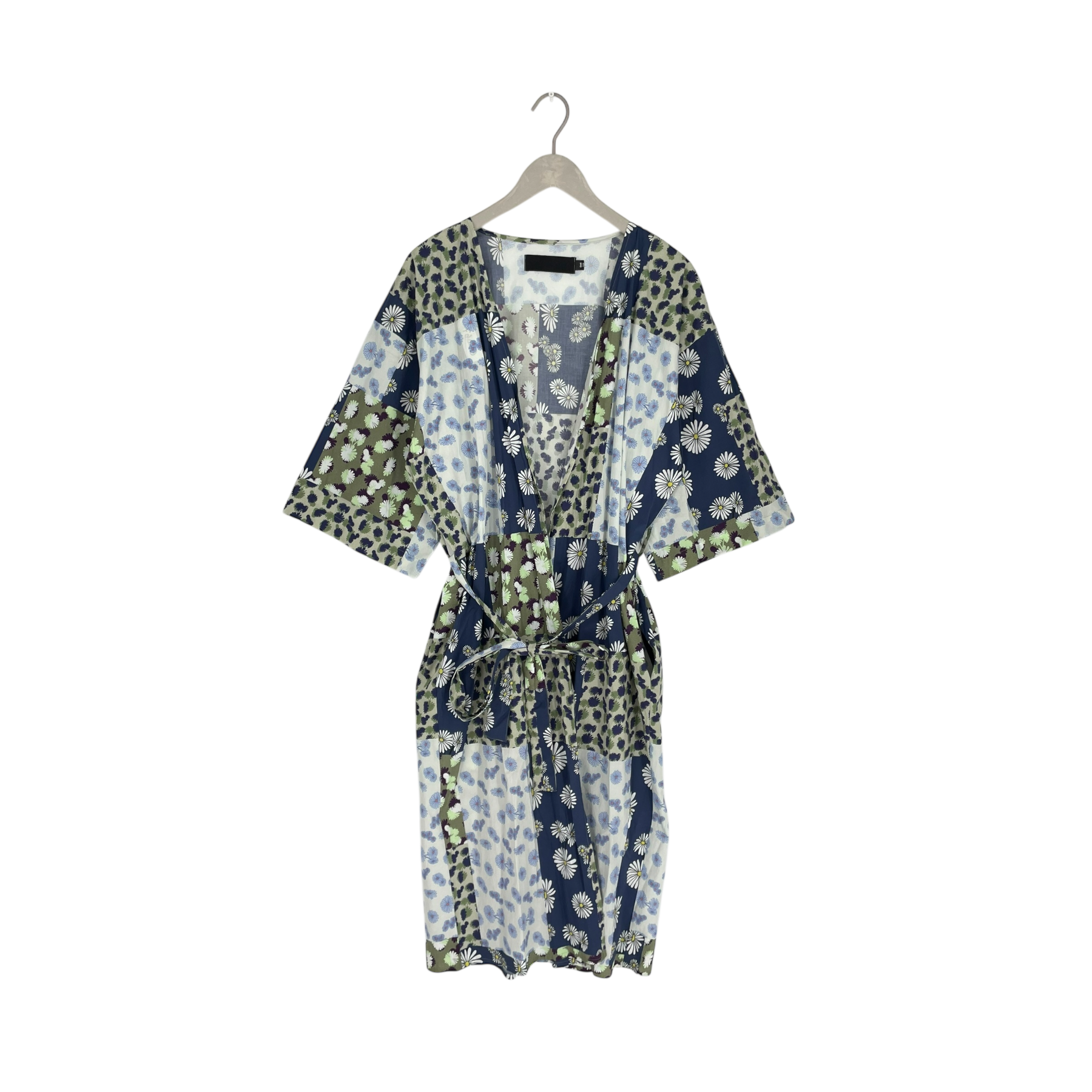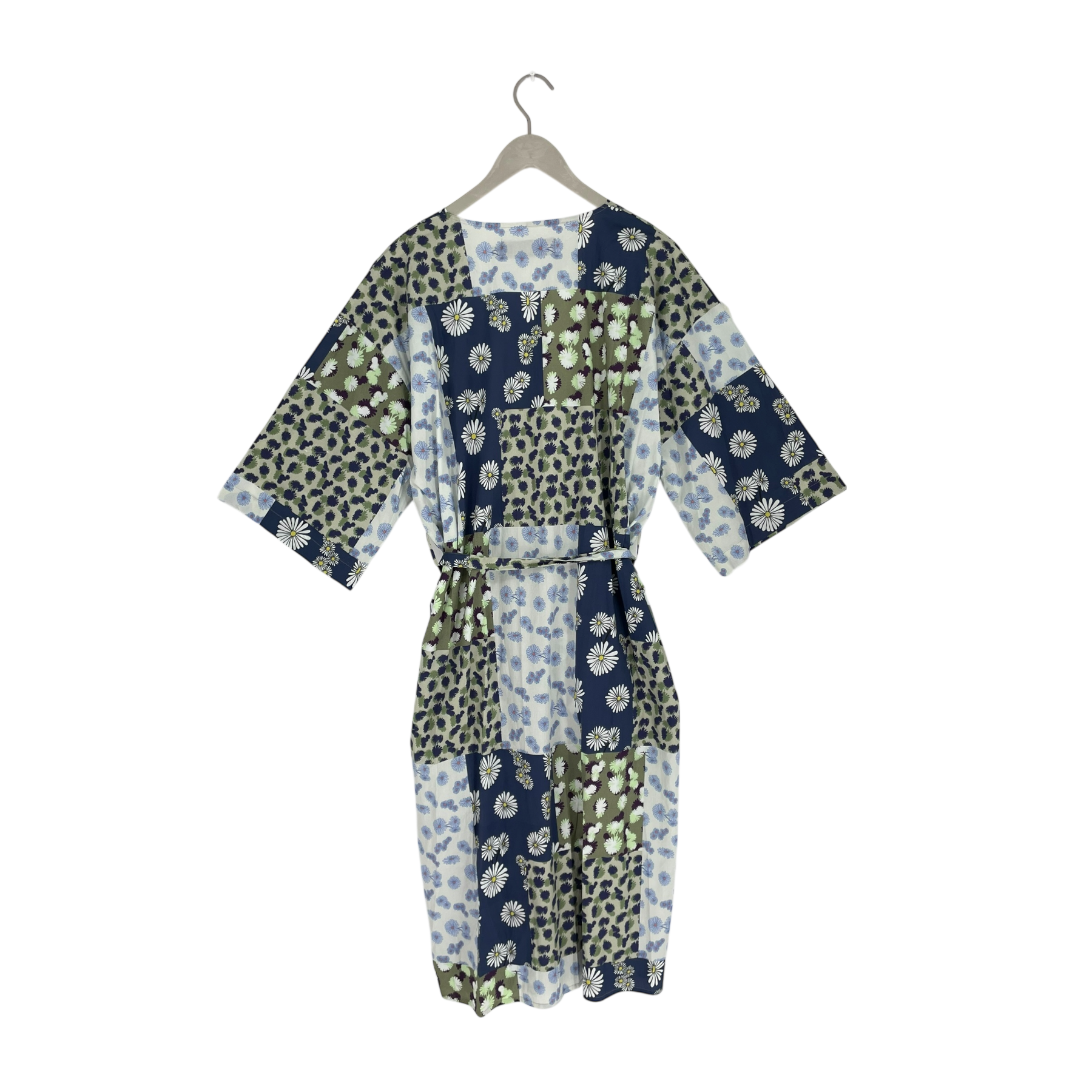 Vimma kaftan has full-length sleeves. The waist has a fabric belt and belt loops made of the same pattern. The model allows you to use the caftan open or closed like a wrap dress.
