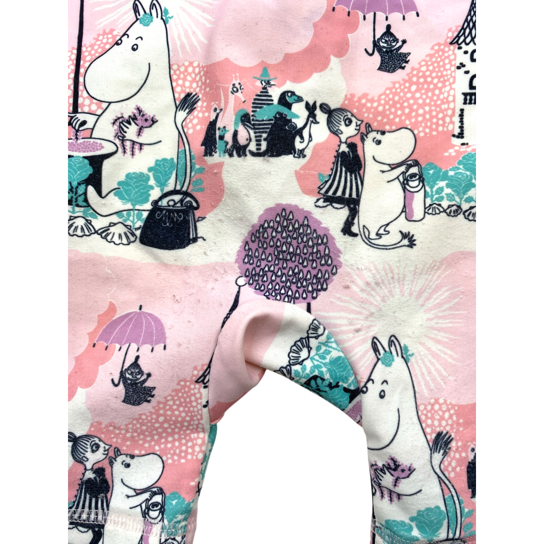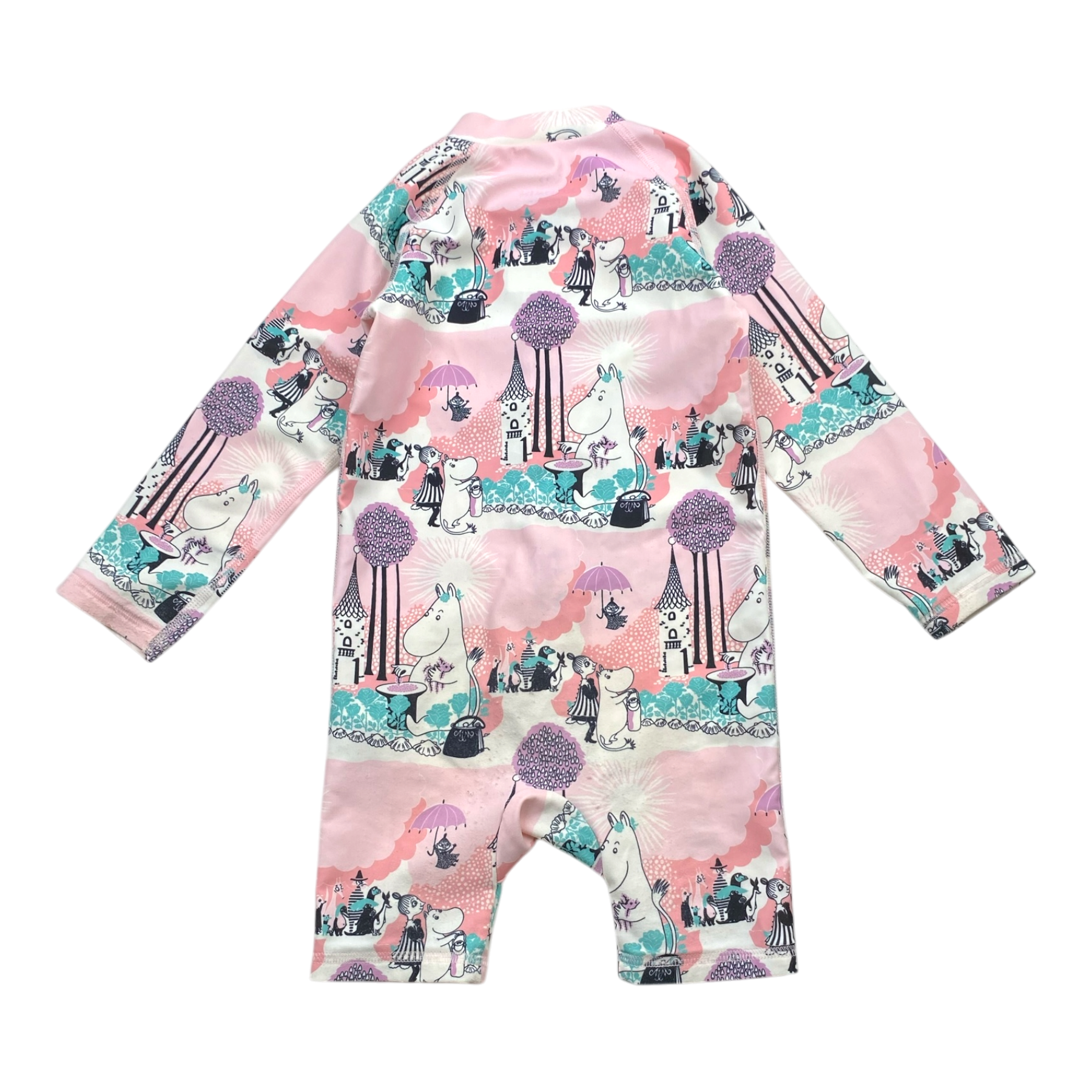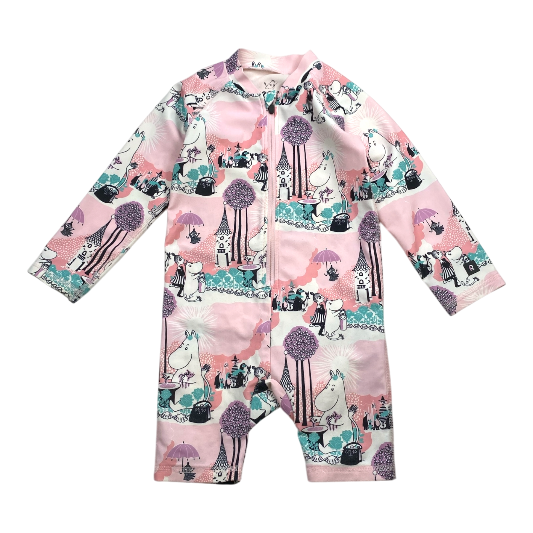 Reima moomin sandvig UV protective swim suit with a zipper in the front. The material has fluffed in the butt area.