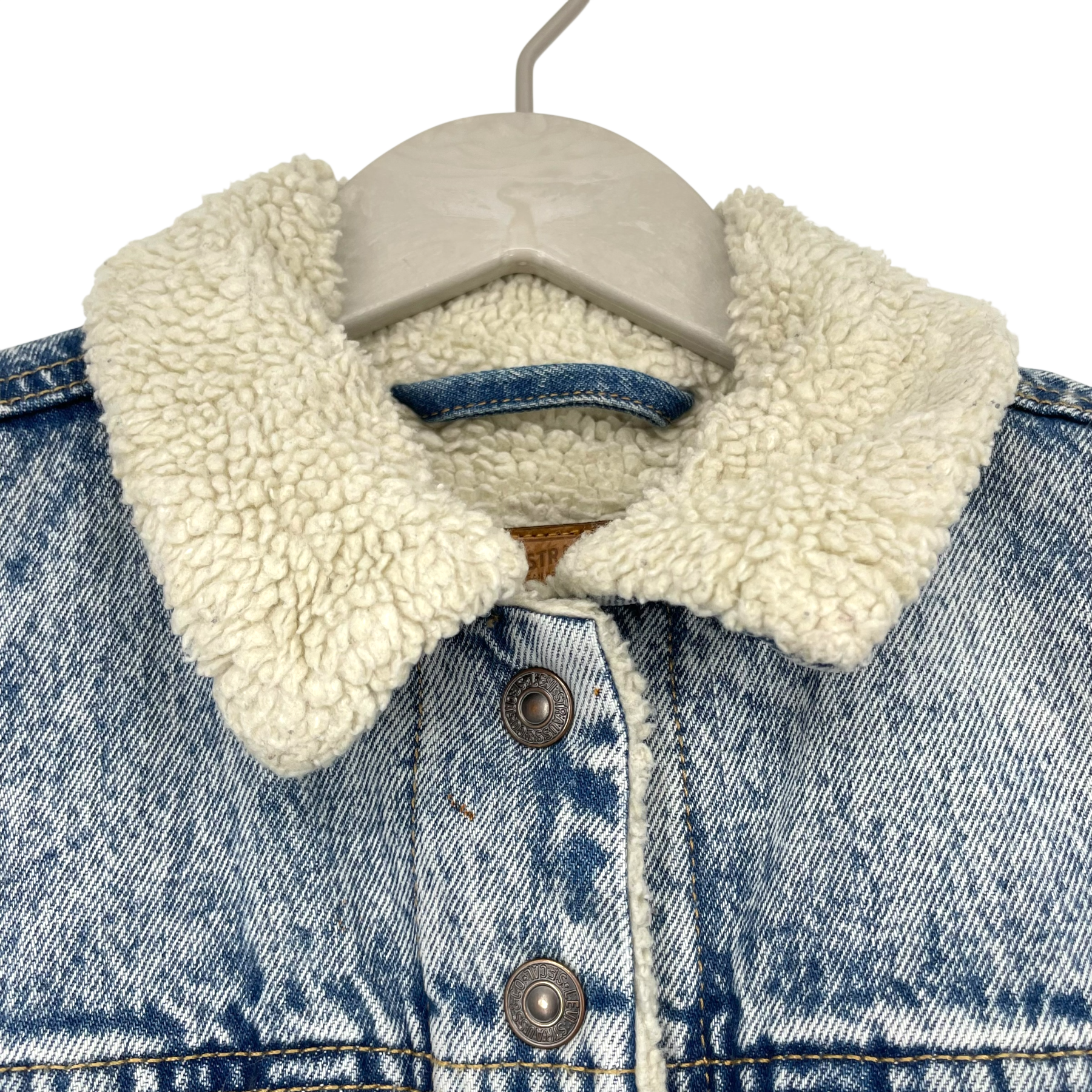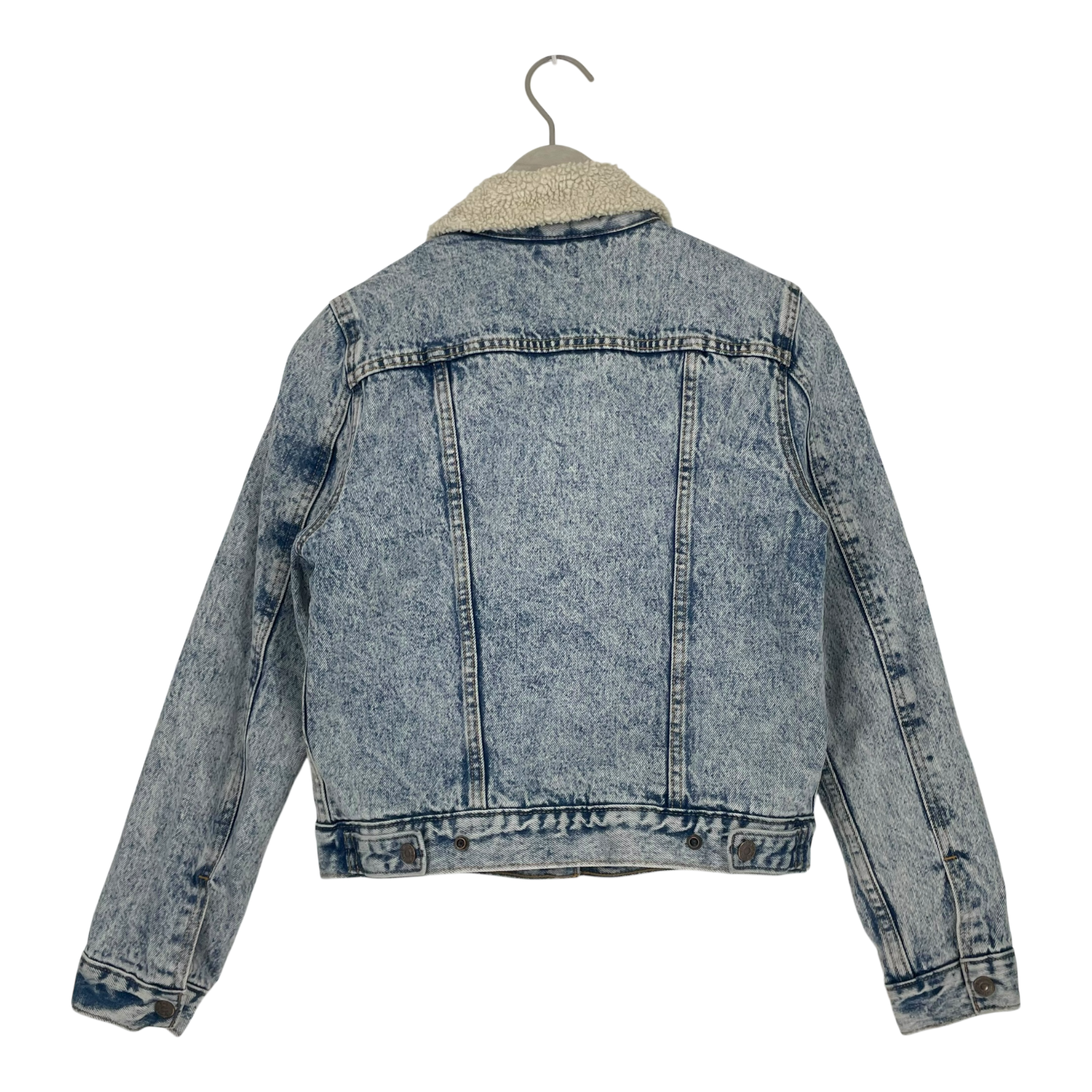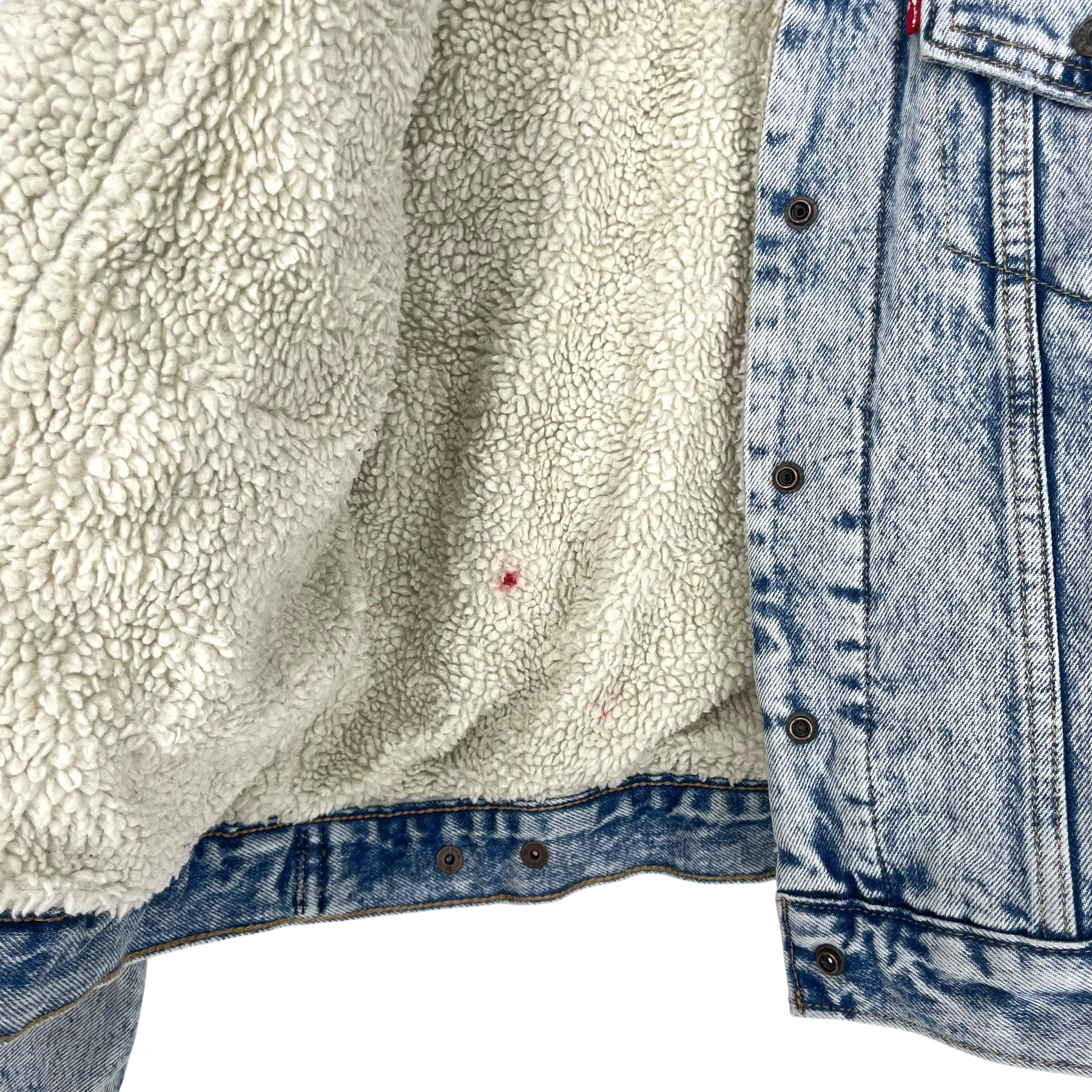Levi's sherpa tucker denim jacket with furry lining. Snap button closure, side pockets and chest pockets on both sides.