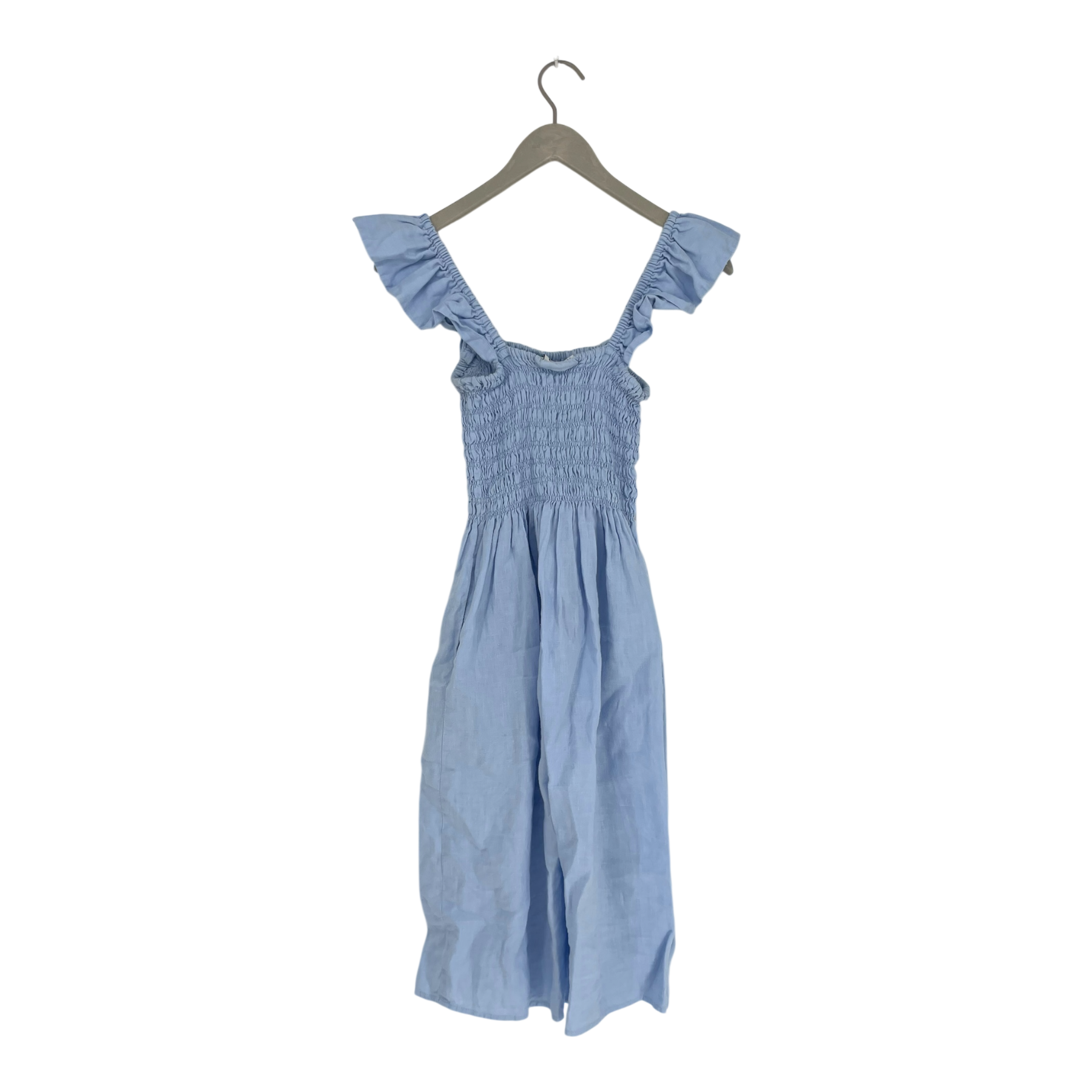 Nakoa linen Ariela dress with smoc pleats. The dress has short, pleated sleeves and a body-hugging tuxedo pleat. The dress has side pockets, and length is slightly below the knee.