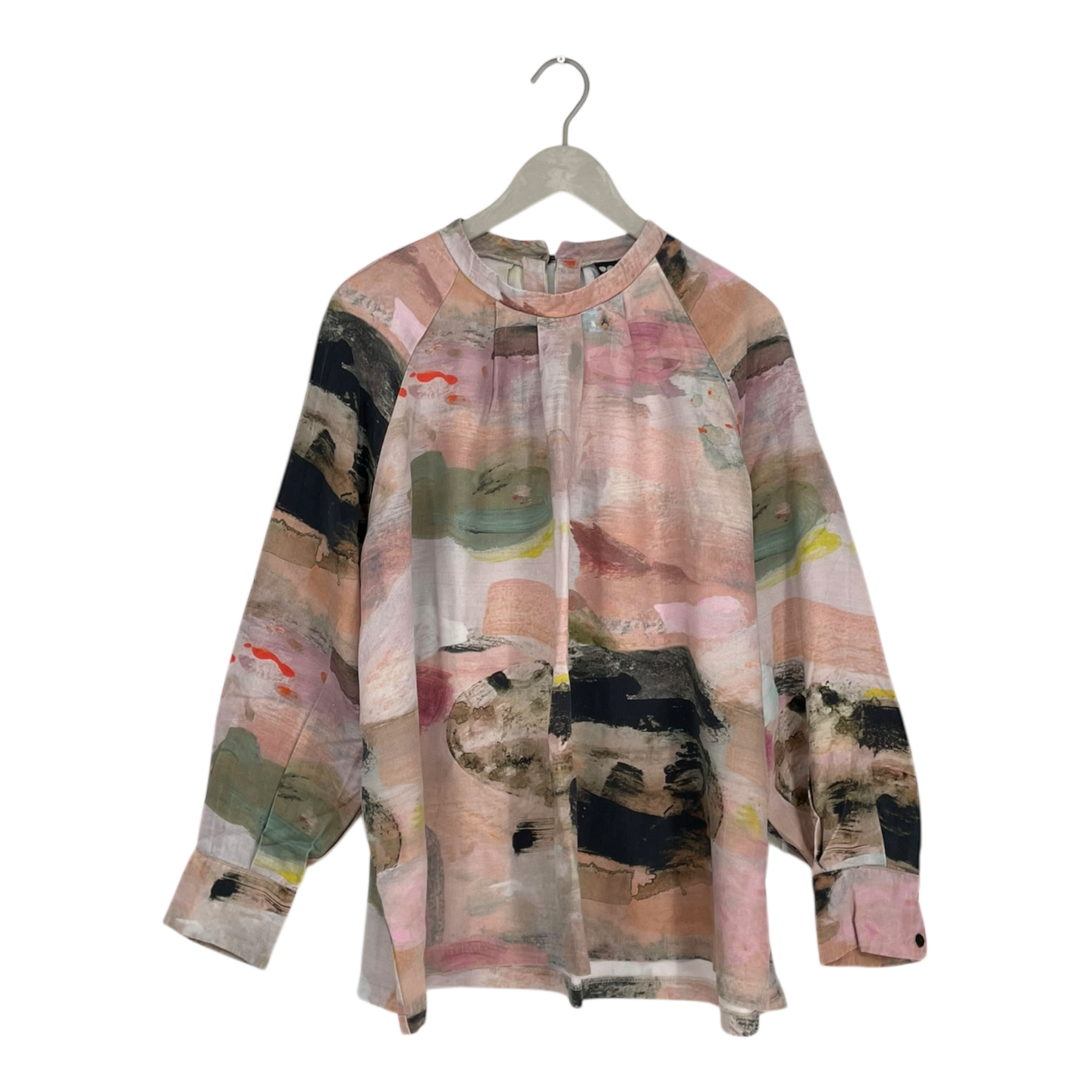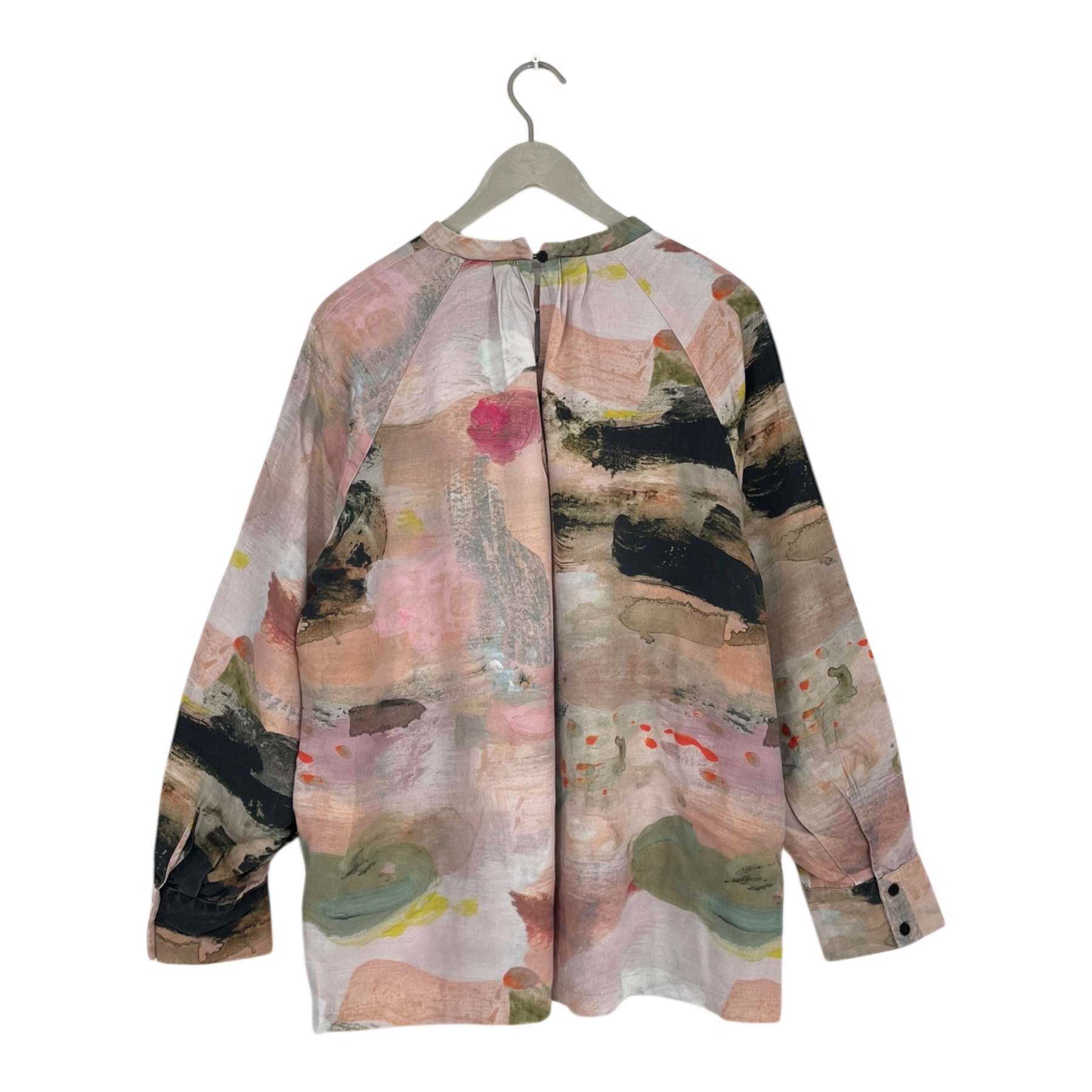 Papu Pleated blouse shirt with button on the back. The shirt has long sleeves with slits and buttons on wrist cuffs.