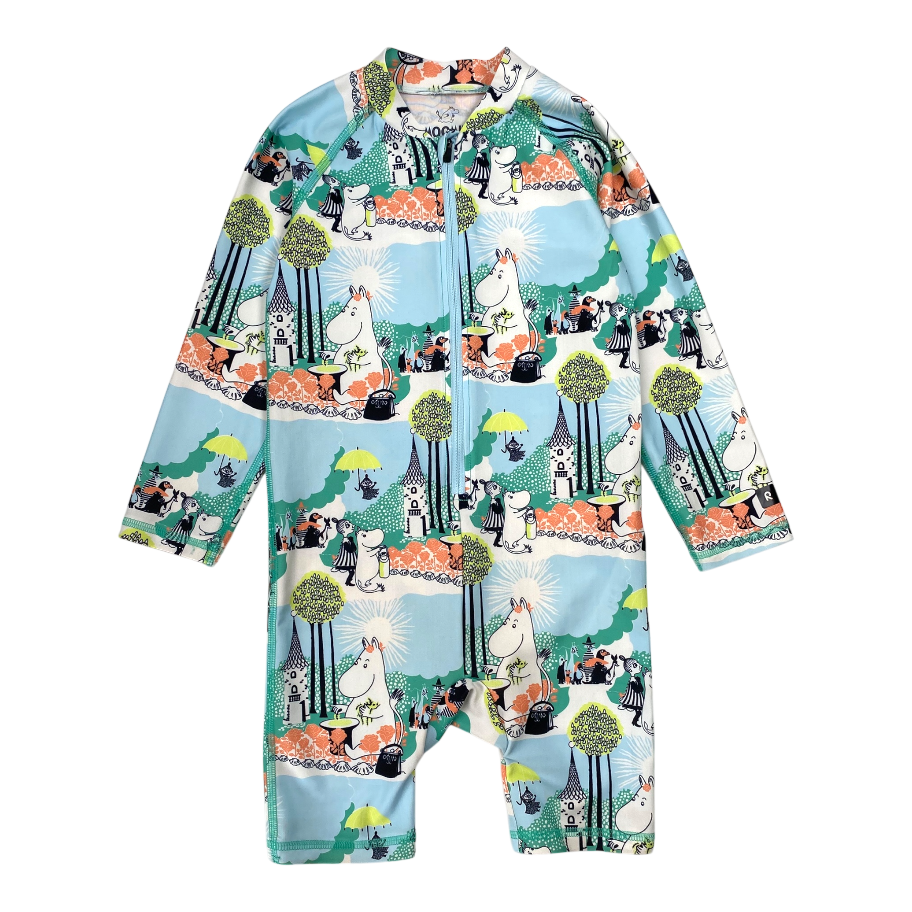 Reima moomin sandvig UV protective swim suit with a zipper in the front.